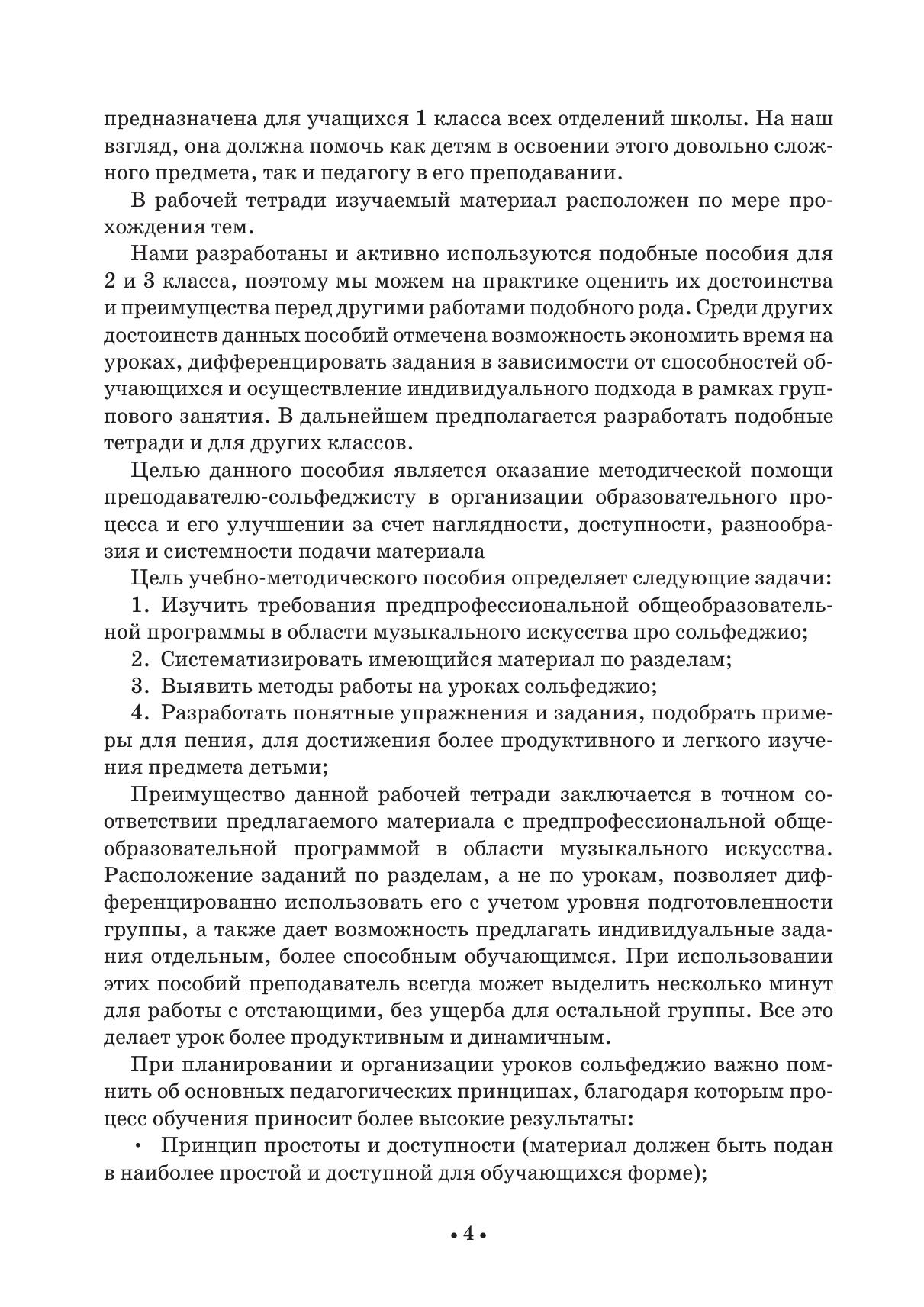 Рабочая тетрадь по сольфеджио представляет собой комплексное пособие, в котором собраны воедино и правила, и примеры для пения, и домашние задания. Материал расположен по мере прохождения тем. Среди главных достоинств пособия — возможность экономить время на уроках, дифференцировать задания в зависимости от способностей обучающихся и осуществление индивидуального подхода в рамках группового занятия.