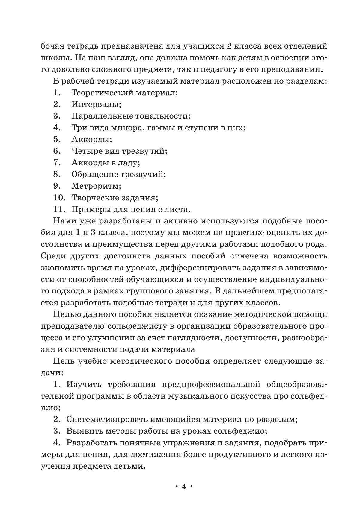 Г. Н. Пахомовой и Е. И. Рецлаф уже была разработана рабочая тетрадь для первого класса. Рабочая тетрадь по сольфеджио представляет собой комплексное пособие, в котором собраны воедино и правила, и примеры для пения, и домашние задания. Материал расположен по мере прохождения тем. Среди главных достоинств пособия — возможность экономить время на уроках, дифференцировать задания в зависимости от способностей обучающихся и осуществление индивидуального подхода в рамках группового занятия. Рабочая тетрадь рекомендована ученикам младших классов и педагогам ДМШ и ДШИ, а также широкому кругу интересующихся теорией музыки. The solfeggio workbook is a comprehensive textbook that includes rules, examples for singing, and homework tasks. The material is arranged according to the topics being studied. Among the textbook’s main advantages is a chance to save time during the lessons, differentiate tasks depending on the students' abilities and the use of an individual approach at a group lesson. The workbook is recommended for primary grades pupils and teachers of children’s music schools and children’s schools of arts, as well as a wide range of people interested in music theory.