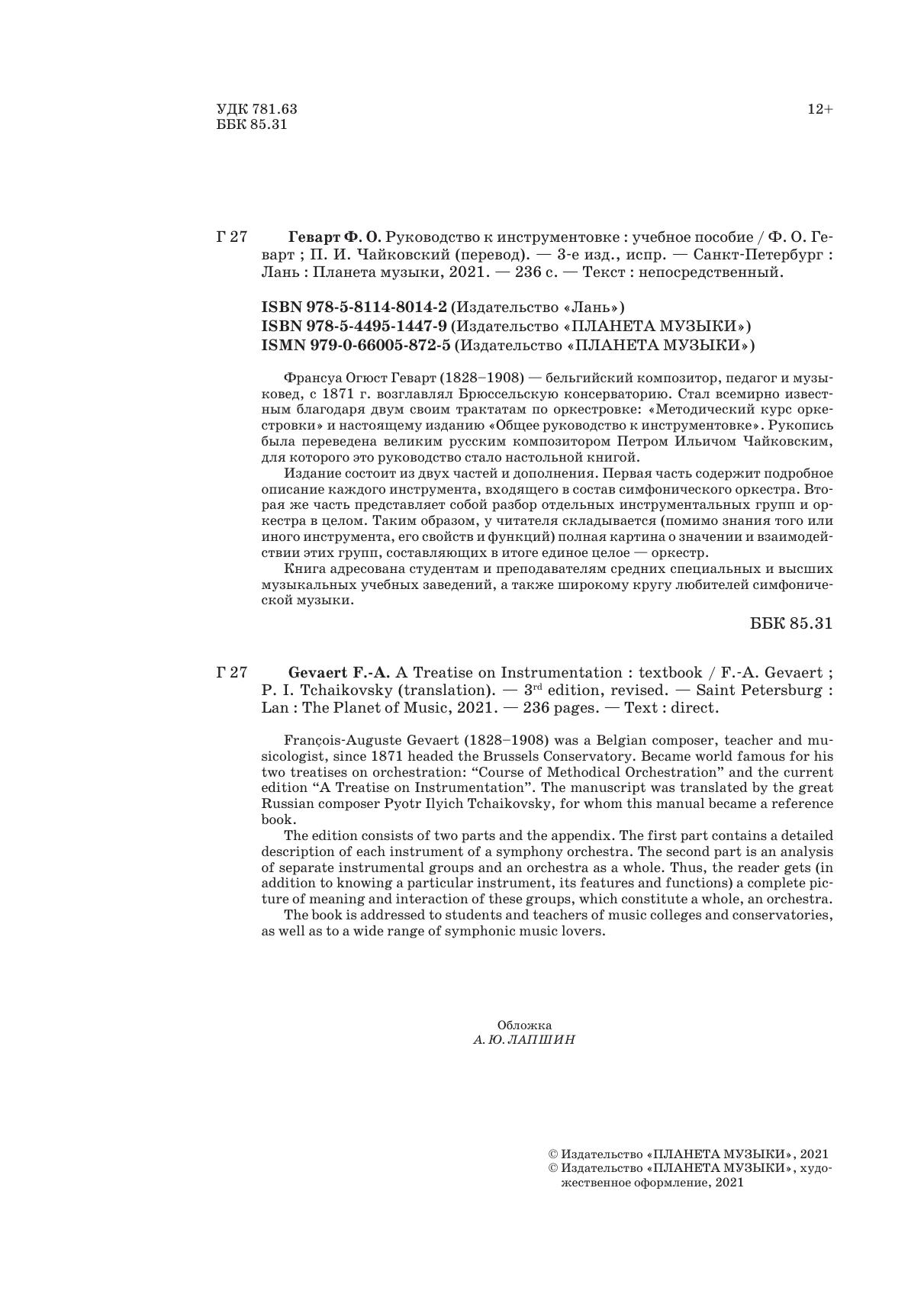 Геварт Франсуа Огюст (1828-1908) – бельгийский композитор, педагог и музыковед, с 1871 г. возглавлял Брюссельскую консерваторию. Стал всемирно известным благодаря двум своим трактатам по оркестровке: «Методический курс оркестровки» и настоящему изданию «Общее руководство к инструментовке». Рукопись была переведена великим русским композитором Петром Ильичом Чайковским, для которого это руководство стало настольной книгой.