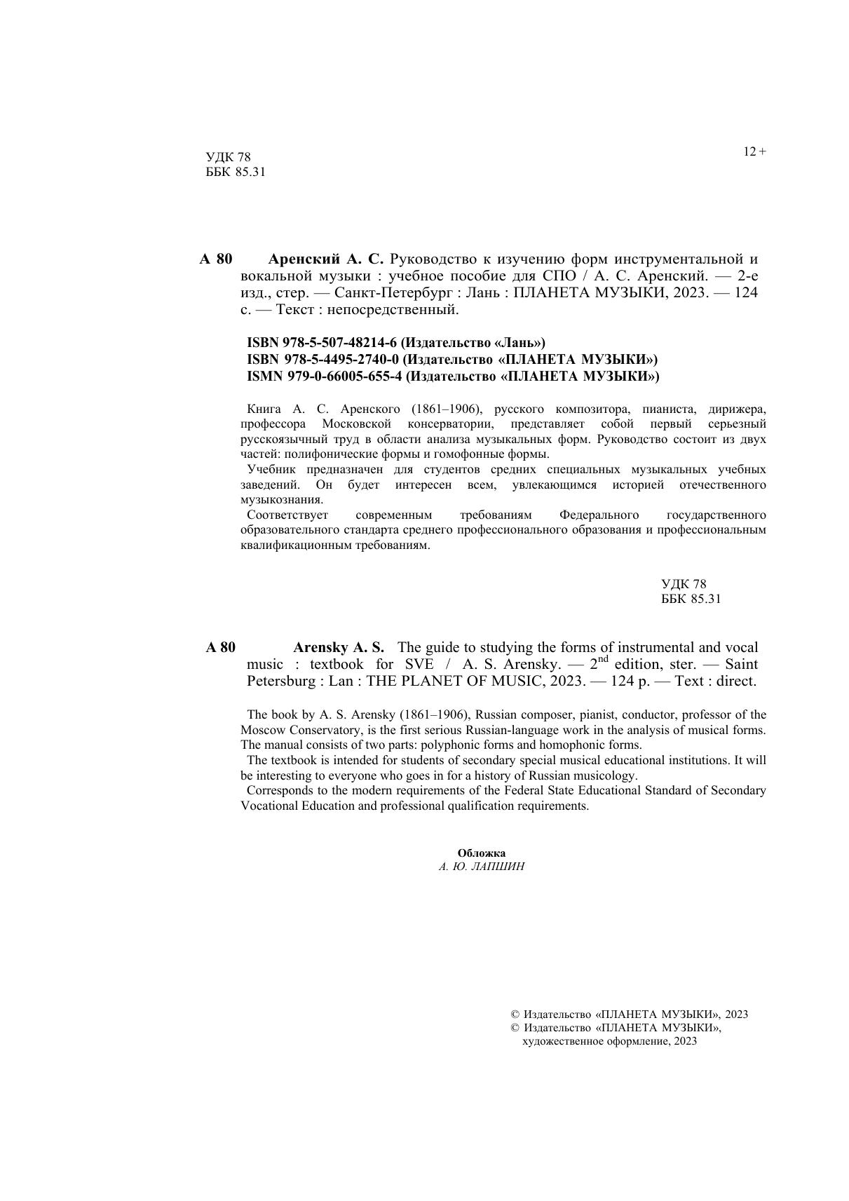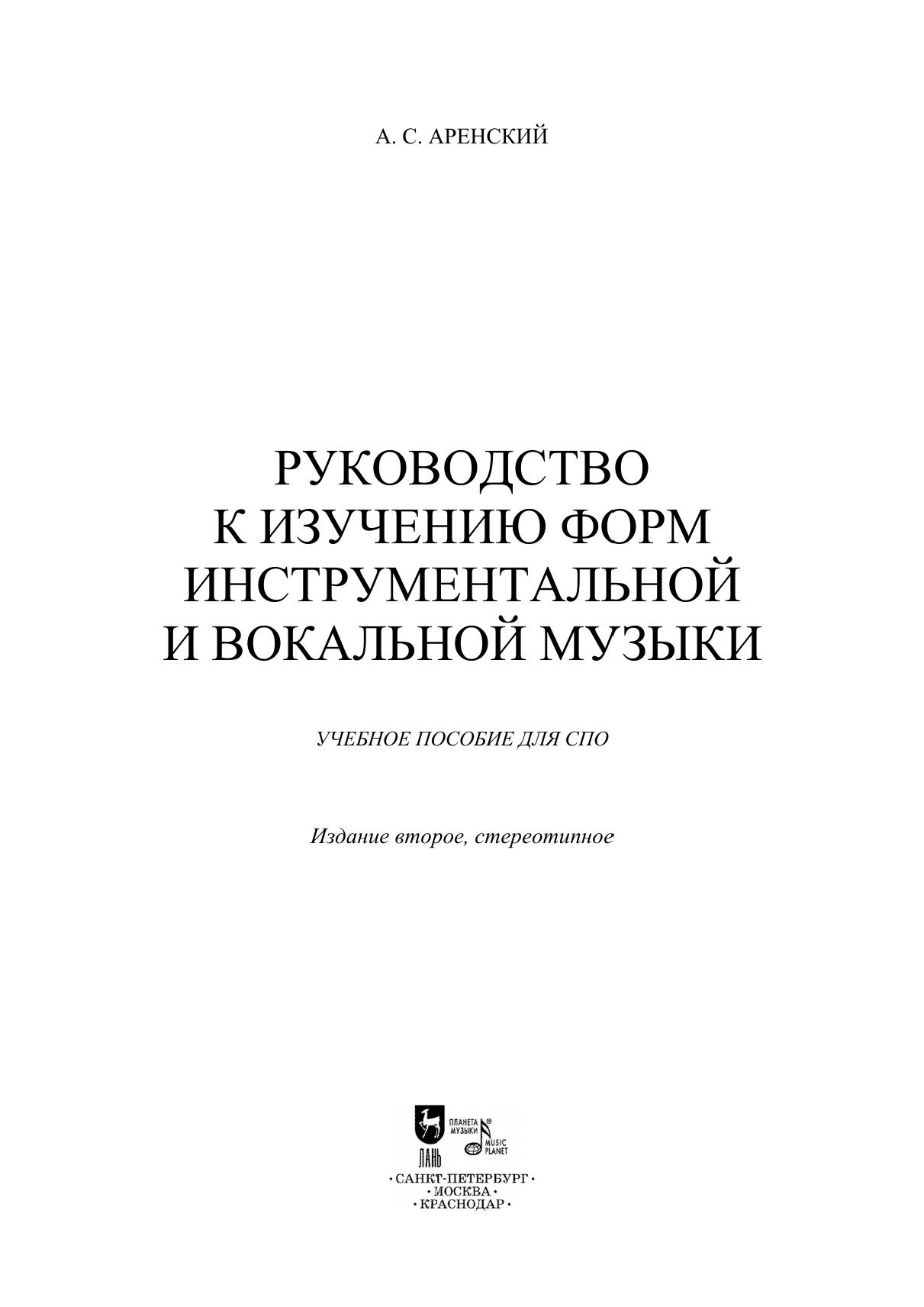 Книга А. С. Аренского (1861 — 1906), русского композитора, пианиста, дирижёра, профессора Московской консерватории, представляет собой первый серьезный русскоязычный труд в области анализа музыкальных форм. Руководство состоит из двух частей: полифонические формы и гомофонные формы. Соответствует современным требованиям Федерального государственного образовательного стандарта среднего профессионального образования и профессиональным квалификационным требованиям. Учебник предназначен для педагогов и студентов средних специальных учебных заведений. The book by A. S. Arensky (1861 - 1906), Russian composer, pianist, conductor, professor of the Moscow Conservatory, is the first serious Russian-language work in the analysis of musical forms. The manual consists of two parts: polyphonic forms and homophonic forms. Corresponds to the modern requirements of the Federal State Educational Standard of Secondary Vocational Education and professional qualification requirements. The textbook is intended for teachers and students of secondary colleges.