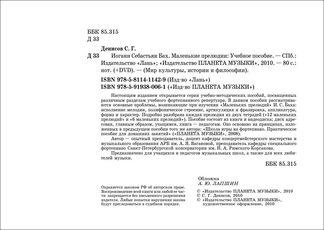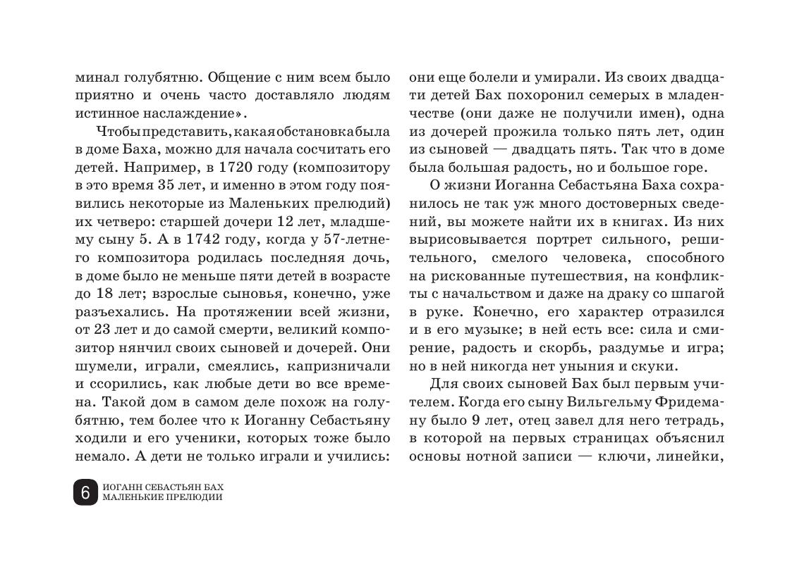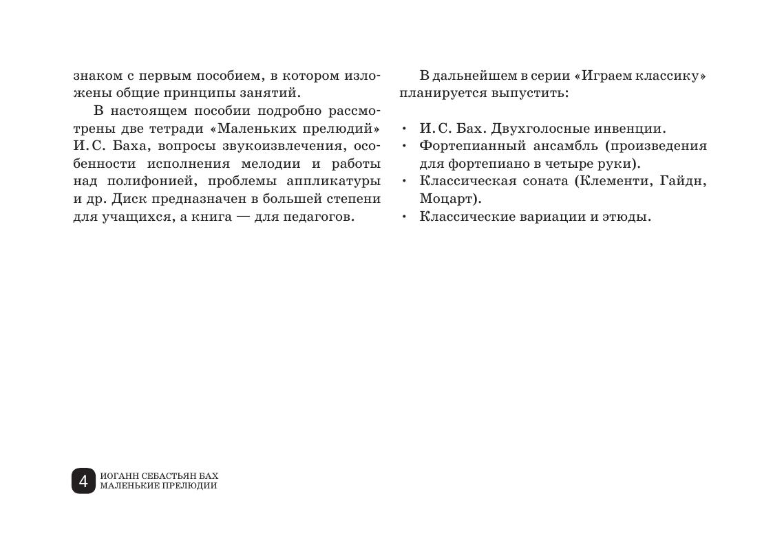 Настоящим изданием открывается серия учебно-методических пособий, посвященных различным разделам учебного фортепианного репертуара. В данном пособии рассматриваются основные проблемы, возникающие при изучении «Маленьких прелюдий» И. С. Баха: исполнение мелодии, полифоническое строение, артикуляция и фразировка, аппликатура, форма и характер.