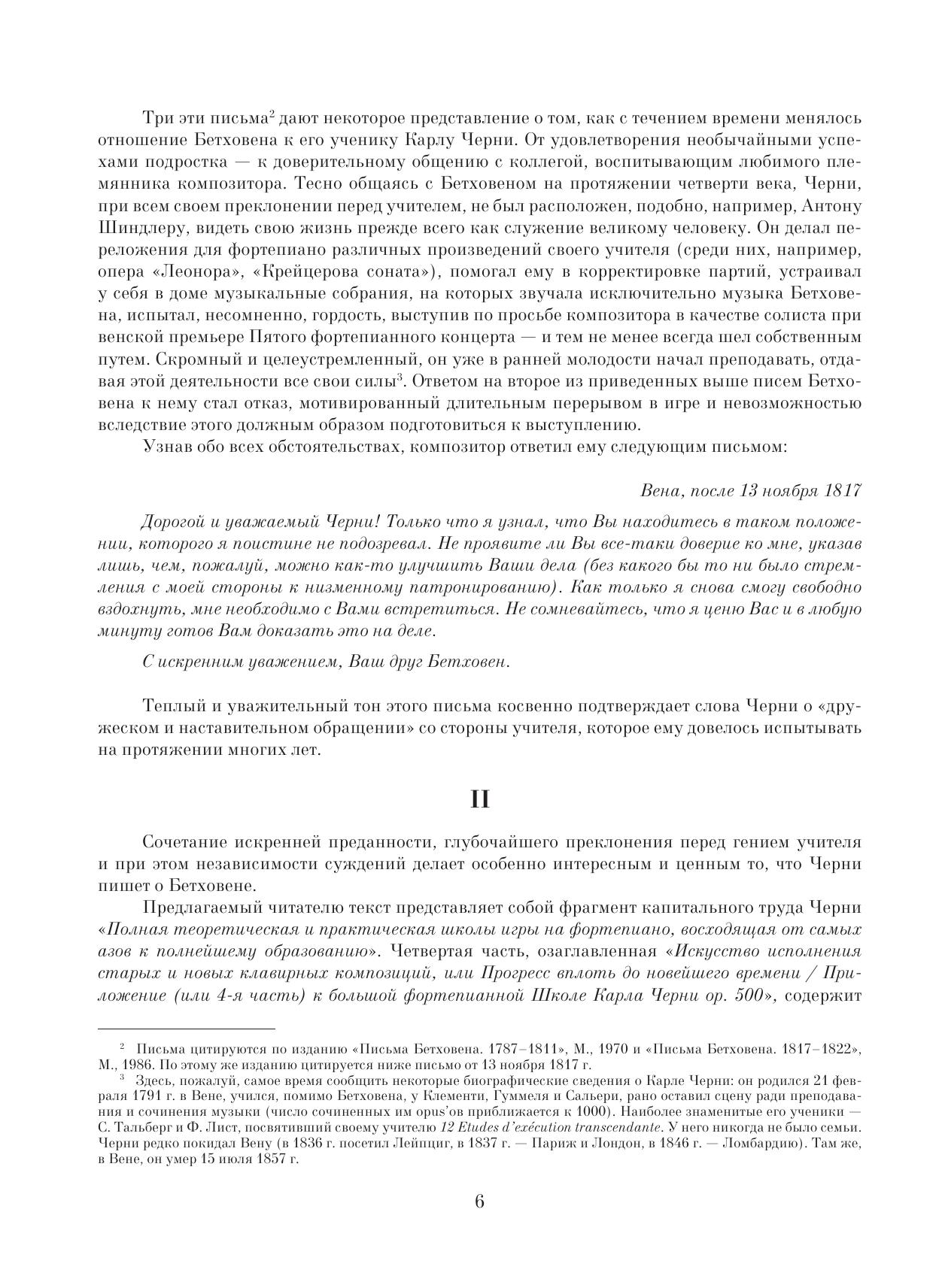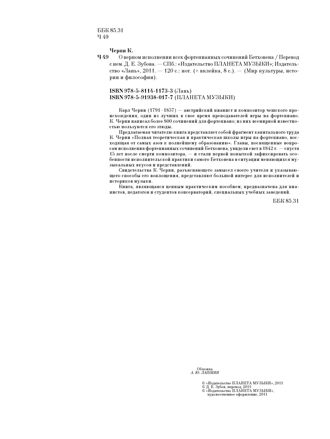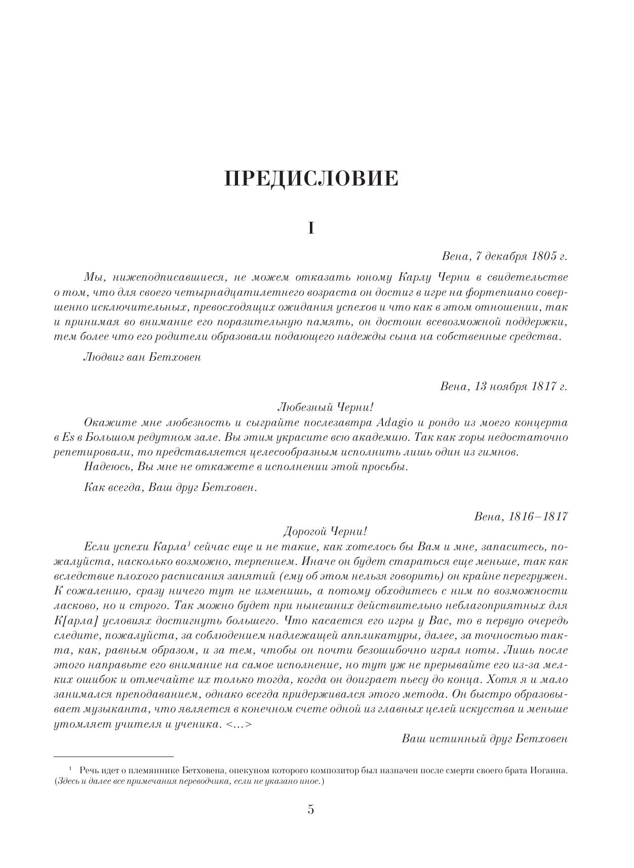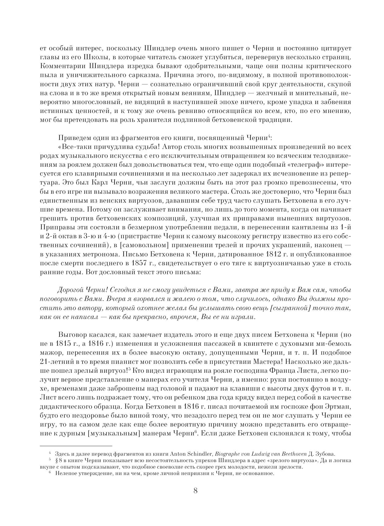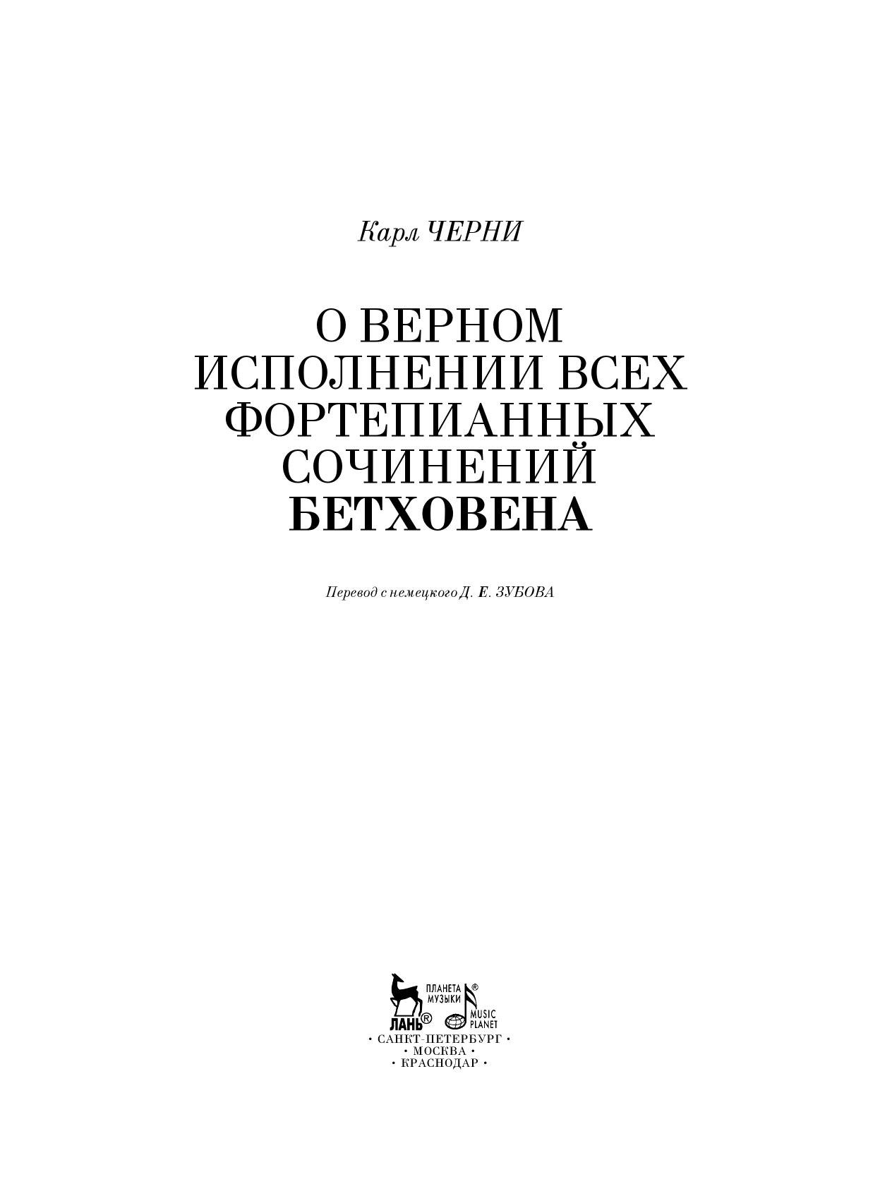 Карл Черни (1791–1857) — австрийский пианист и композитор чешского происхождения, один из лучших в свое время преподавателей игры на фортепиано. Черни написал более 800 сочинений для фортепиано; из них всемирной известностью пользуются его этюды. Предлагаемая читателю книга представляет собой фрагмент капитального труда Черни “Полная теоретическая и практическая школы игры на фортепиано, восходящая от самых азов к полнейшему образованию”. Главы, посвященные вопросам исполнения фортепианных сочинений Бетховена, увидели свет в 1842 г. — спустя 15 лет после смерти композитора, — и стали первой попыткой зафиксировать особенности исполнительской практики самого Бетховена в ситуации меняющихся музыкальных вкусов и представлений. Свидетельства Черни, разъясняющего замысел своего учителя и указывающего способы его воплощения, представляют большой интерес для исполнителей и историков музыки. Книга, являющаяся ценным практическим пособием, предназначена для пианистов, педагогов и студентов консерваторий, специальных учебных заведений.