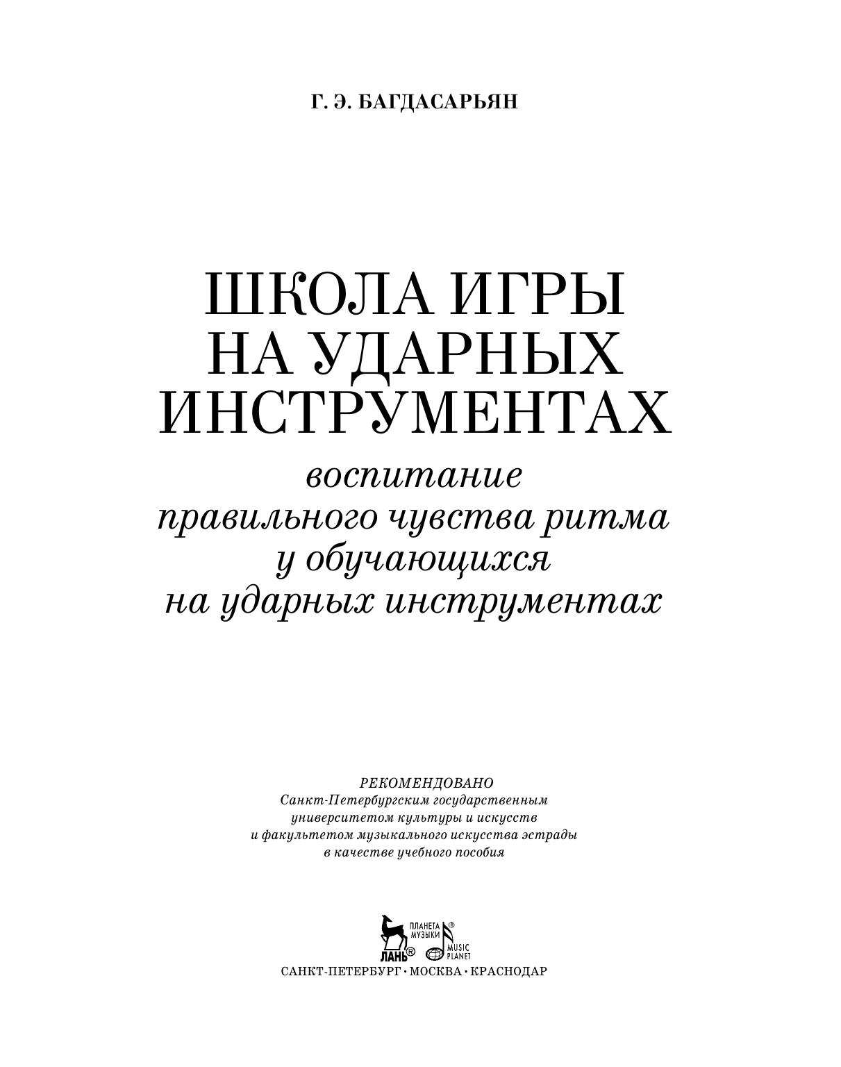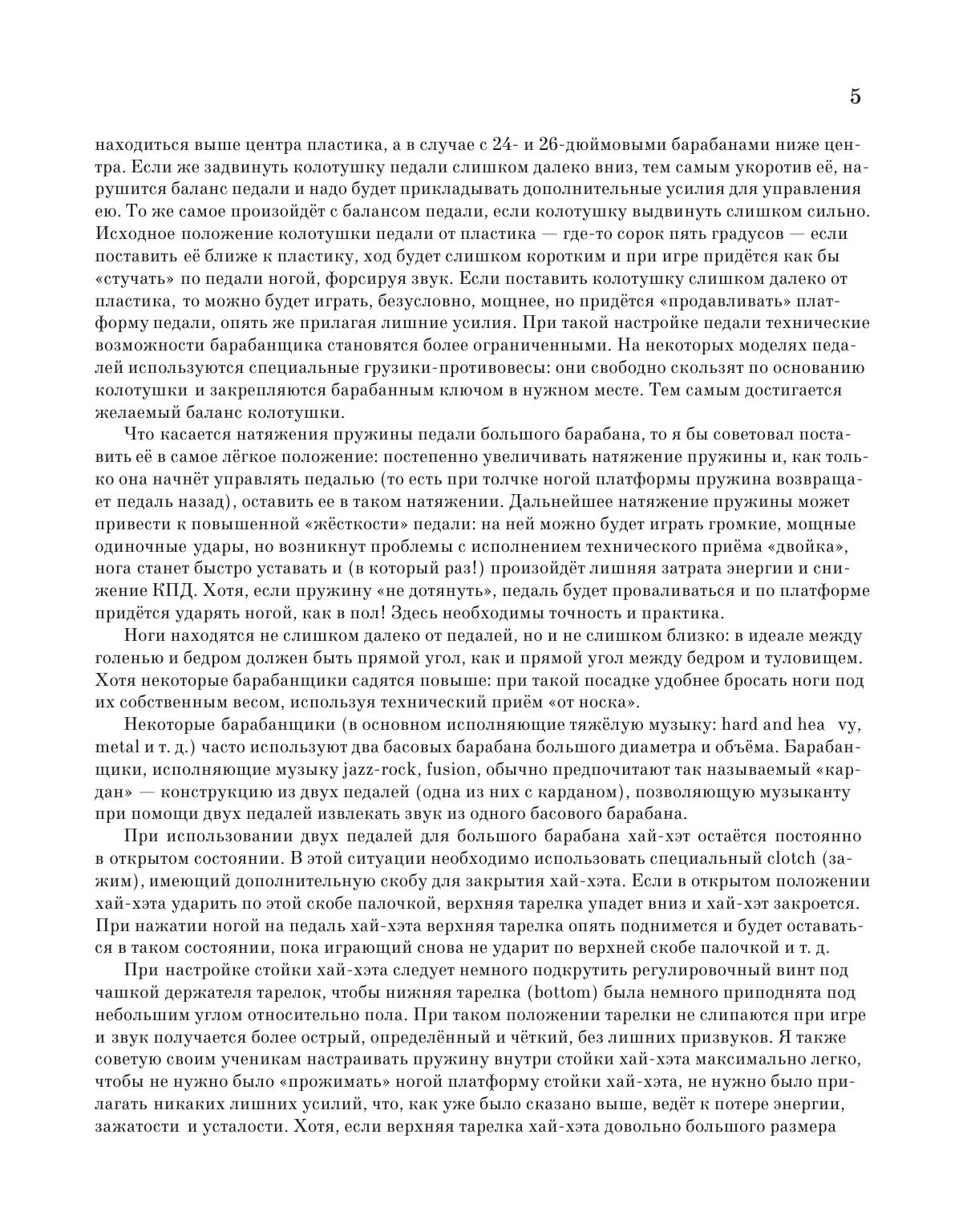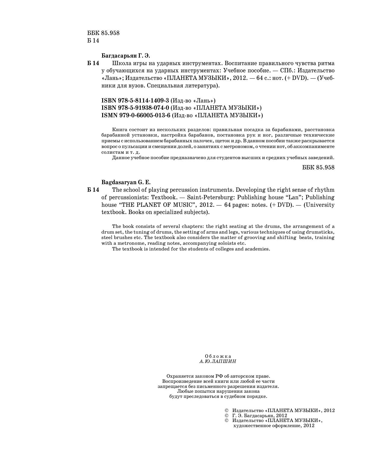 The book consists of several chapters: the right seating at the drums, the arrangement of a drum set, the tuning of drums, the setting of arms and legs, various techniques of using drumsticks, steel brushes etc. The textbook also considers the matter of grooving and shifting beats, training with a metronome, reading notes, accompanying soloists etc. The textbook is intended for the students of colleges and academies.