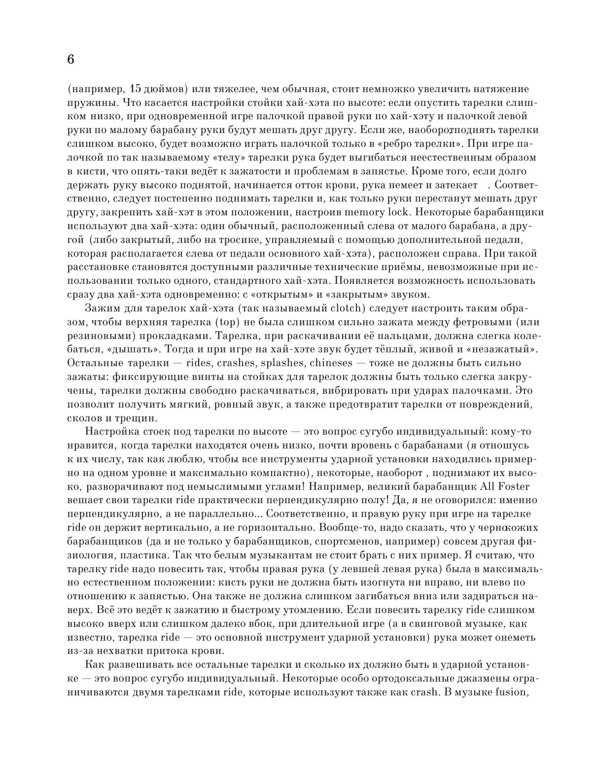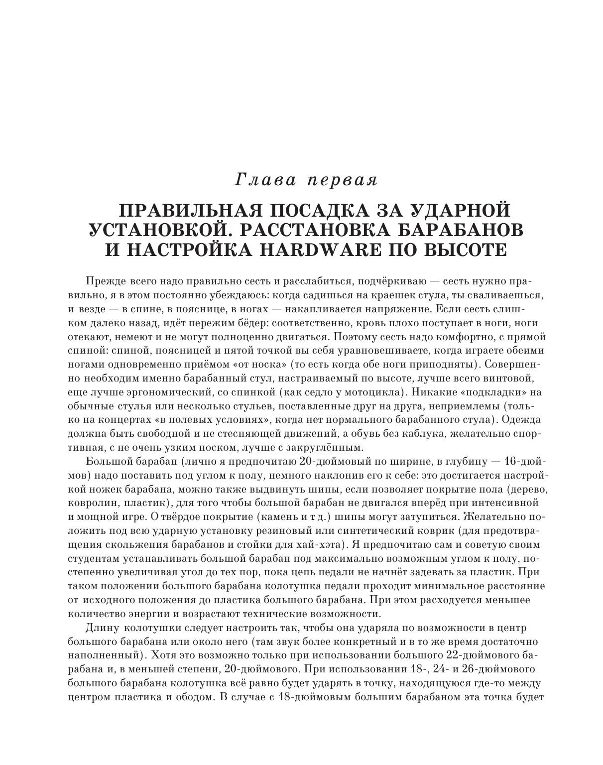 Книга состоит из нескольких разделов: правильная посадка за барабанами, расстановка барабанной установки, настройка барабанов, постановка рук и ног, различные технические приемы с использованием барабанных палочек, щеток и др. В данном пособии также раскрывается вопрос о пульсации и смещении долей, о занятиях с метрономом, о чтении нот, об аккомпанименте солистам и т. д.