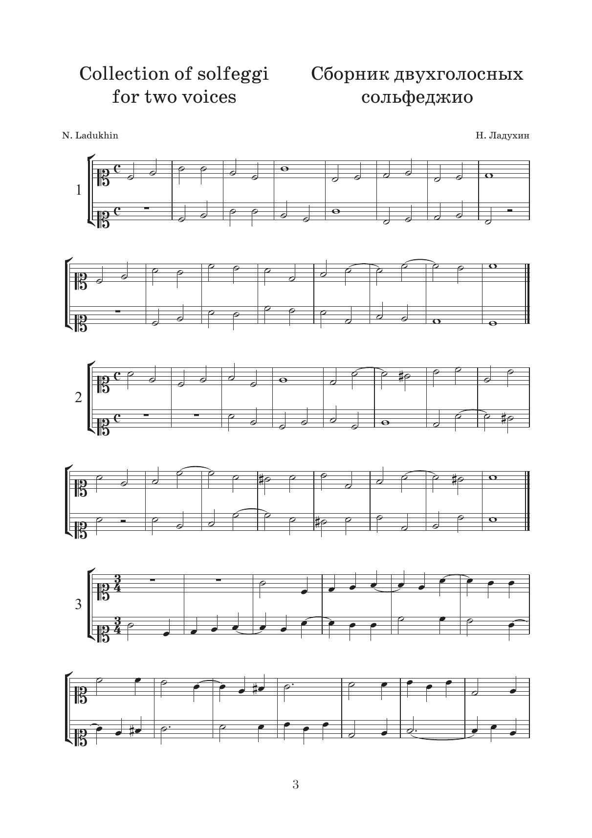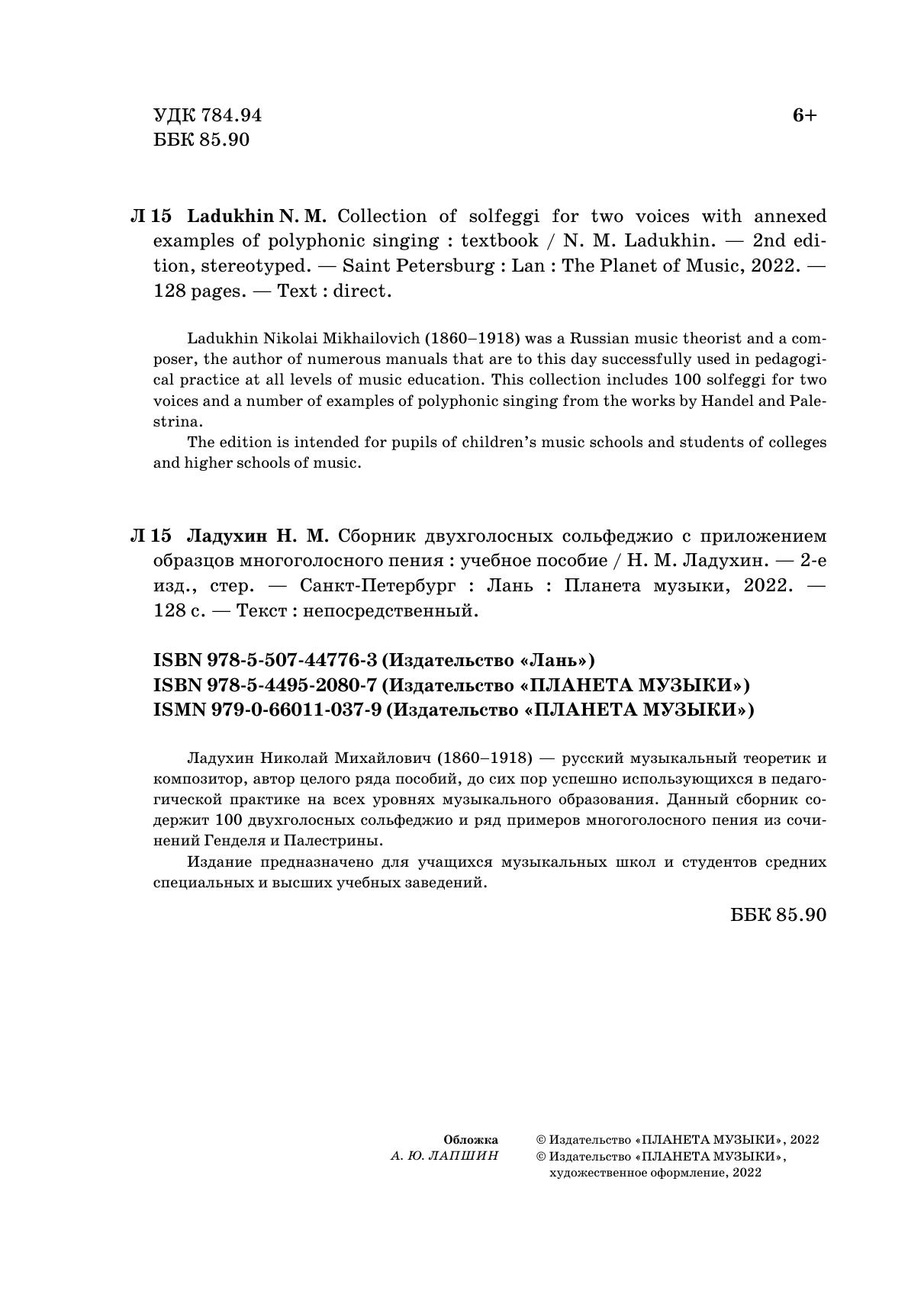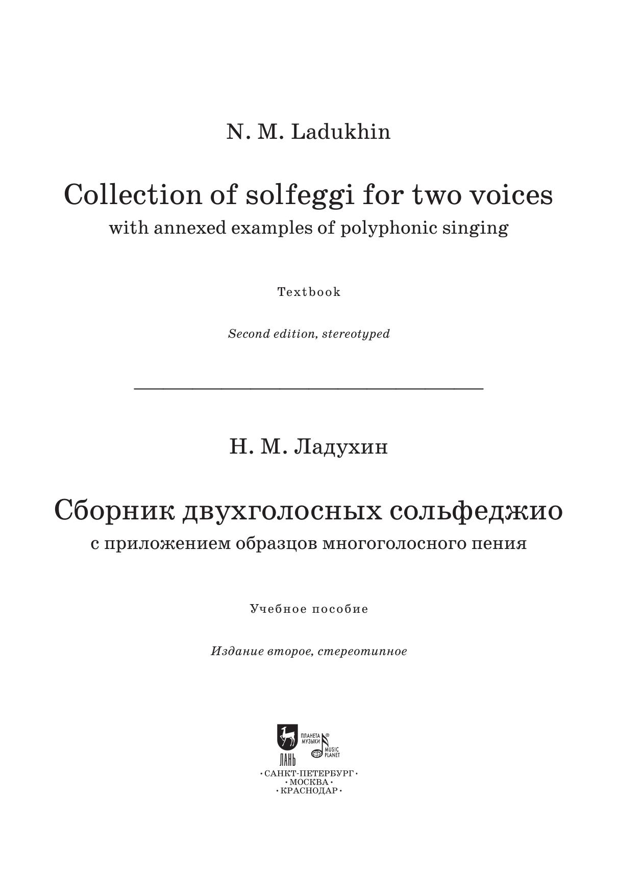 Ladukhin Nikolai Mikhailovich (1860–1918) was a Russian music theorist and a composer, the author of numerous manuals that are to this day successfully used in pedagogical practice at all levels of music education. This collection includes 100 solfeggi for two voices and a number of examples of polyphonic singing from the works by Handel and Palestrina.