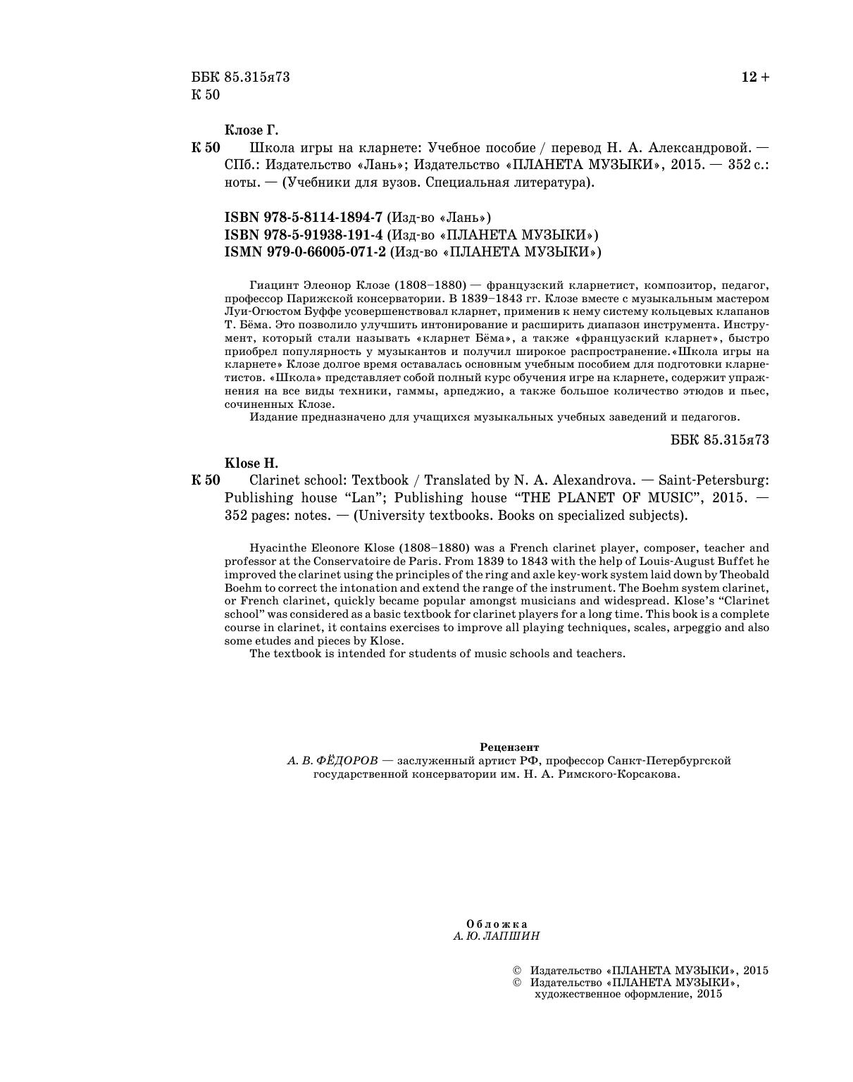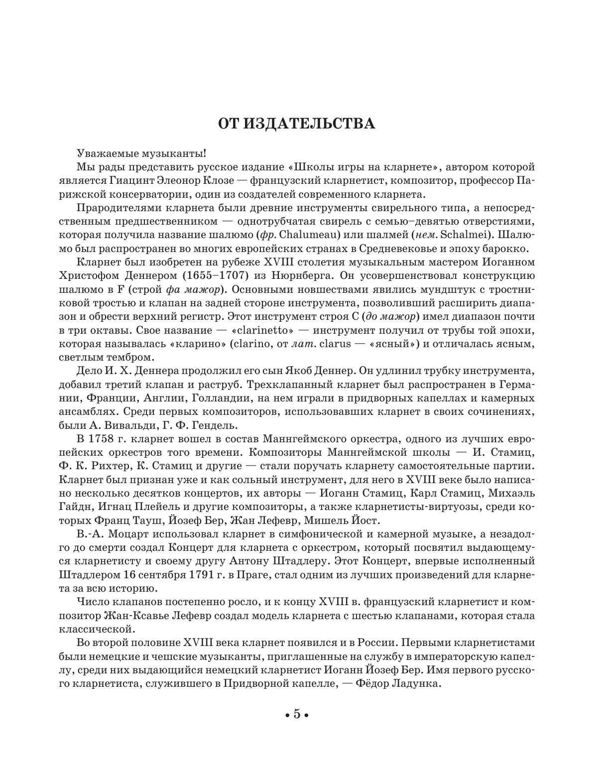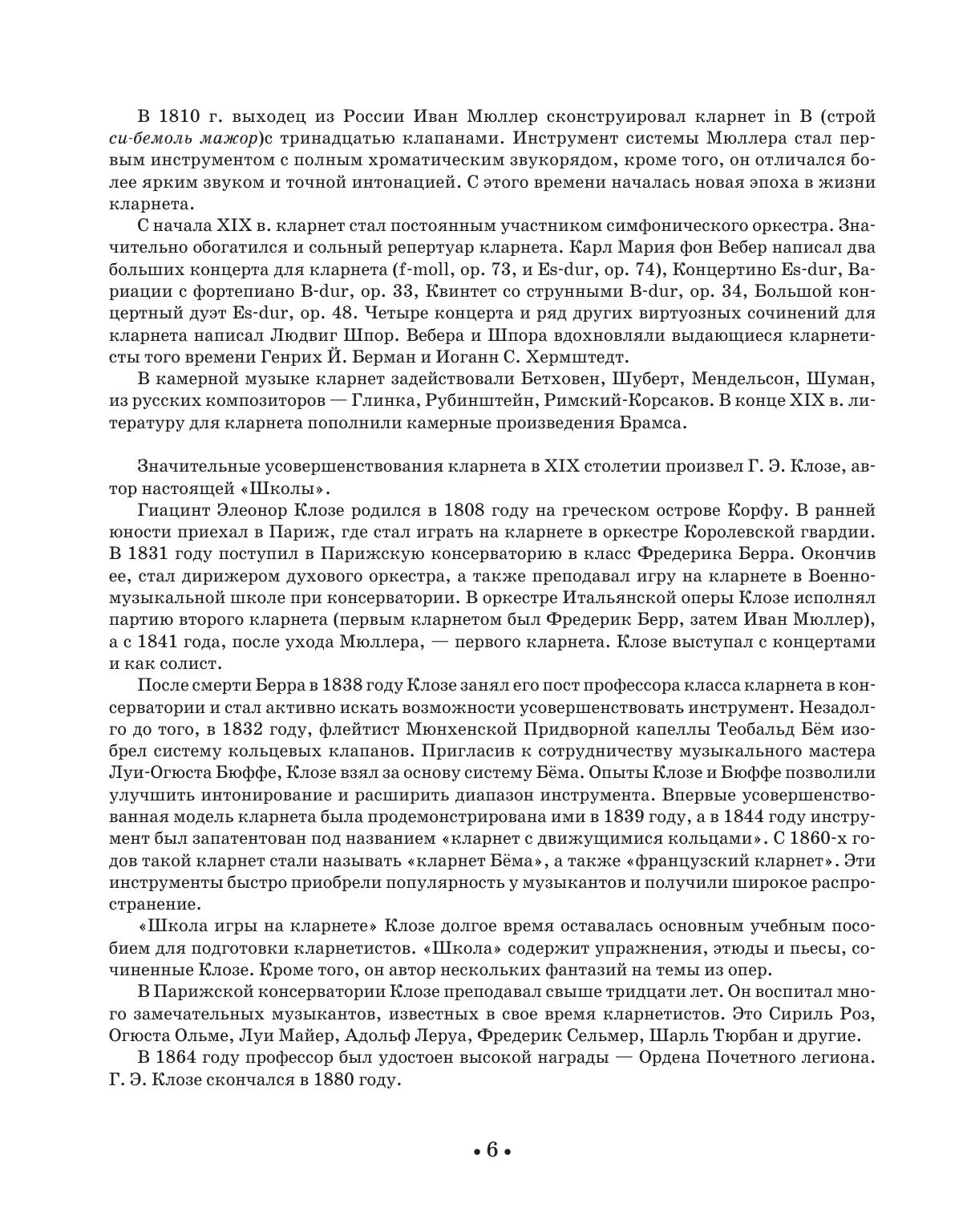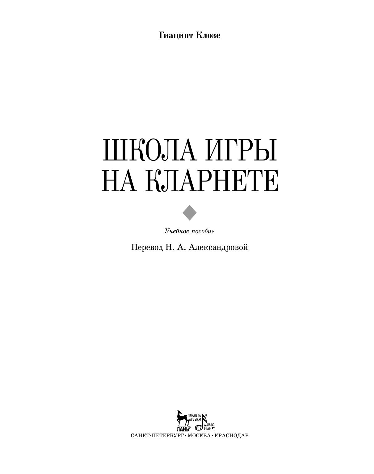 Гиацинт Элеонор Клозе (1808–1880) – французский кларнетист, композитор, педагог, профессор Парижской консерватории. В 1839–1843 гг. Клозе вместе с музыкальным мастером Луи-Огюстом Буффе усовершенствовал кларнет, применив к нему систему кольцевых клапанов Т.Бёма. Это позволило улучшить интонирование и расширить диапазон инструмента. Инструмент, который стали называть «кларнет Бёма», а также «французский кларнет», быстро приобрел популярность у музыкантов и получил широкое распространение.«Школа игры на кларнете» Клозе долгое время оставалась основным учебным пособием для подготовки кларнетистов. «Школа» представляет собой полный курс обучения игре на кларнете, содержит упражнения на все виды техники, гаммы, арпеджио, а также большое количество этюдов и пьес, сочиненных Клозе. Издание предназначено для учащихся музыкальных учебных заведений и педагогов.