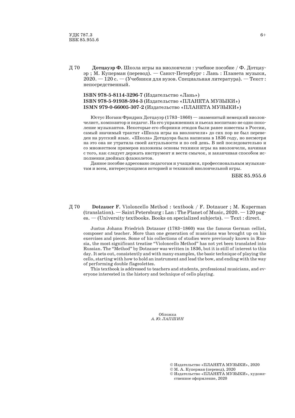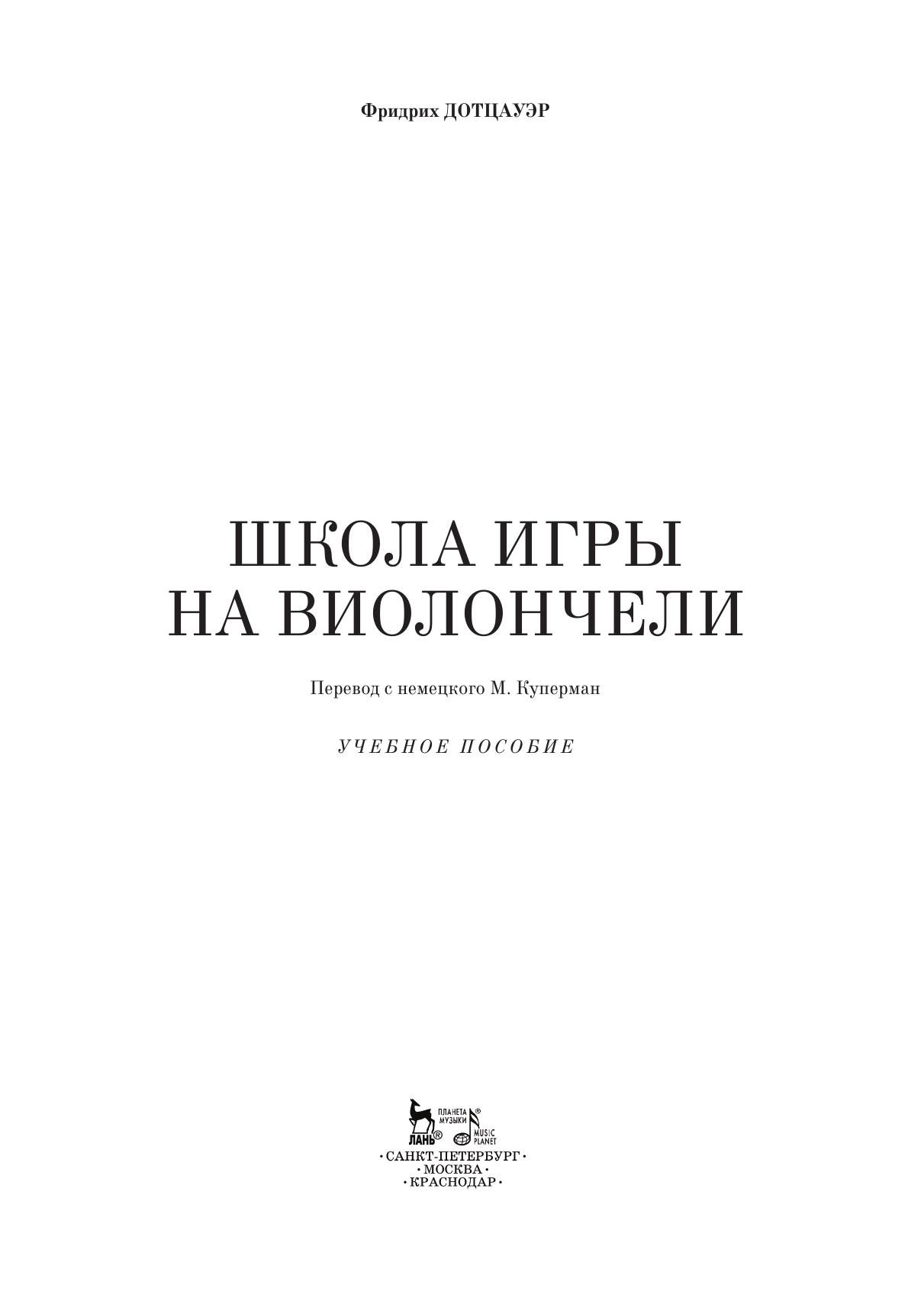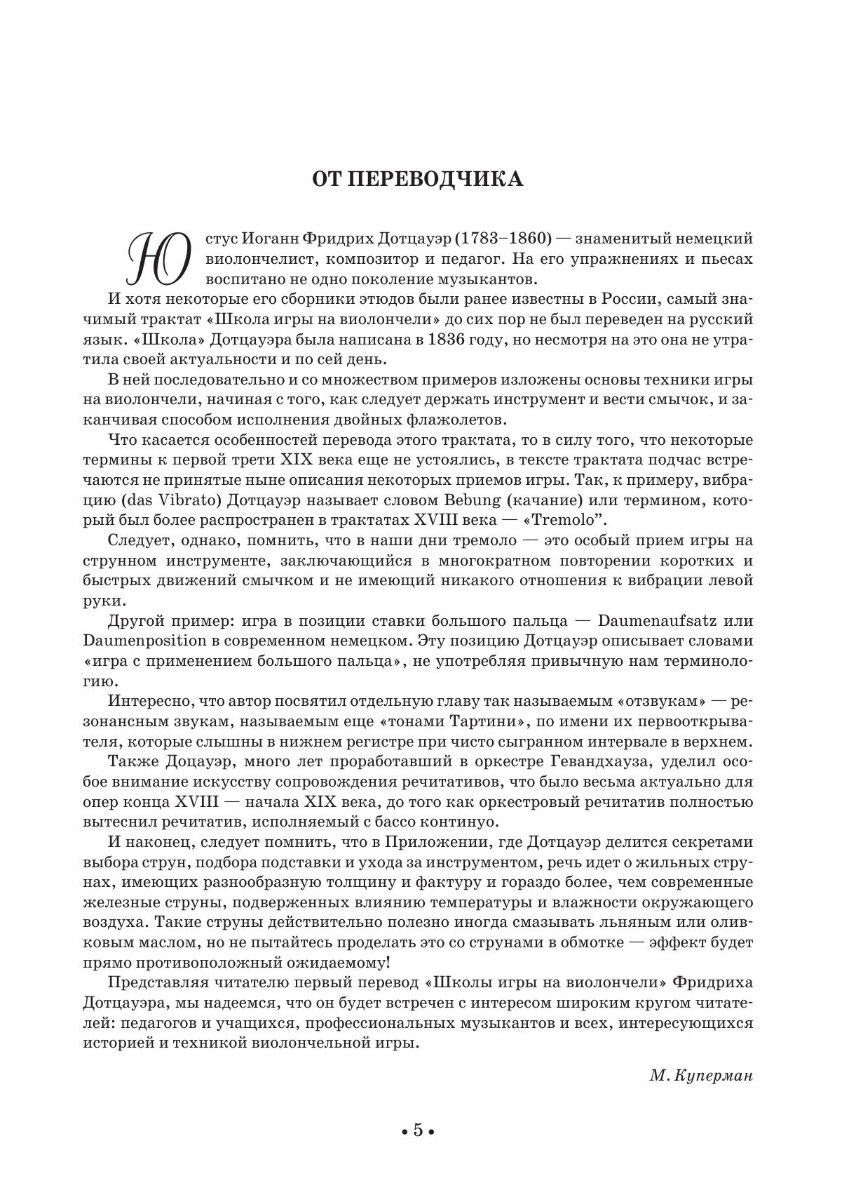 Юстус Иоганн Фридрих Дотцауэр (1783 1860) — знаменитый немецкий виолончелист, композитор и педагог. На его упражнениях и пьесах воспитано не одно поколение музыкантов. Некоторые его сборники этюдов были ранее известны в России, самый значимый трактат "Школа игры на виолончели" до сих пор не был переведен на русский язык. "Школа" Дотцауэра была написана в 1836 году, но несмотря на это она не утратила своей актуальности и по сей день. В ней последовательно и со множеством примеров изложены основы техники игры на виолончели, начиная с того, как следует держать инструмент и вести смычок, и заканчивая способом исполнения двойных флажолетов.
