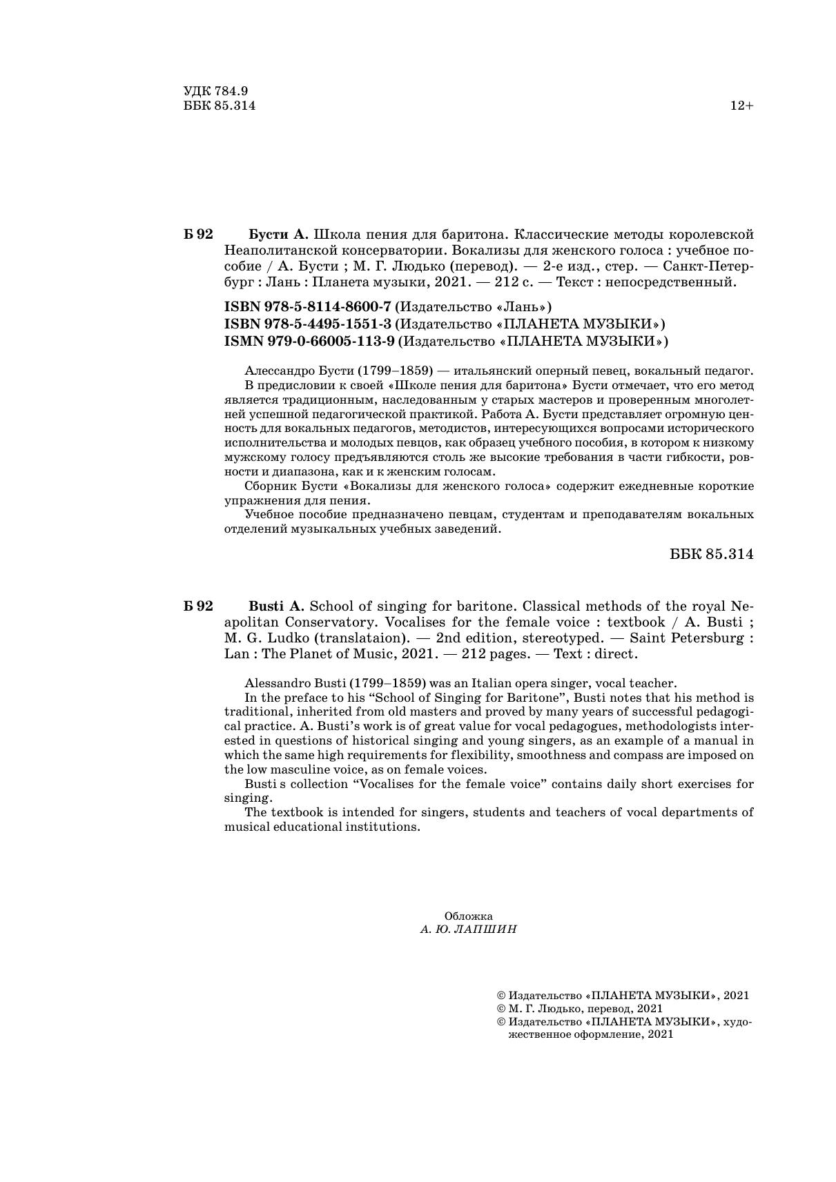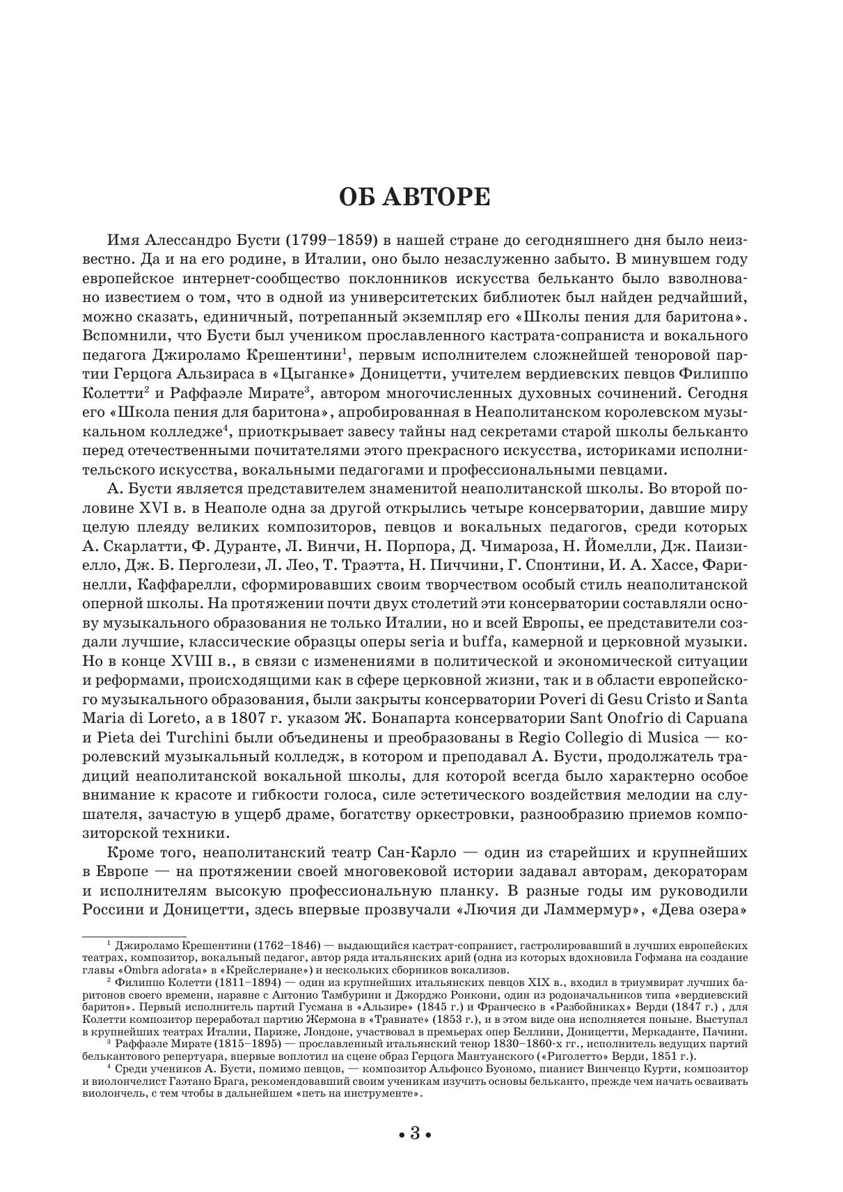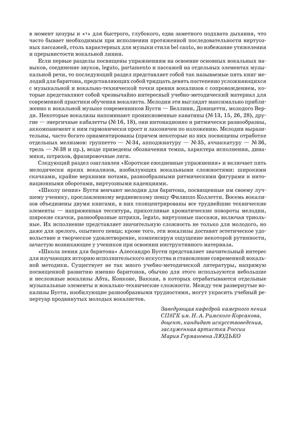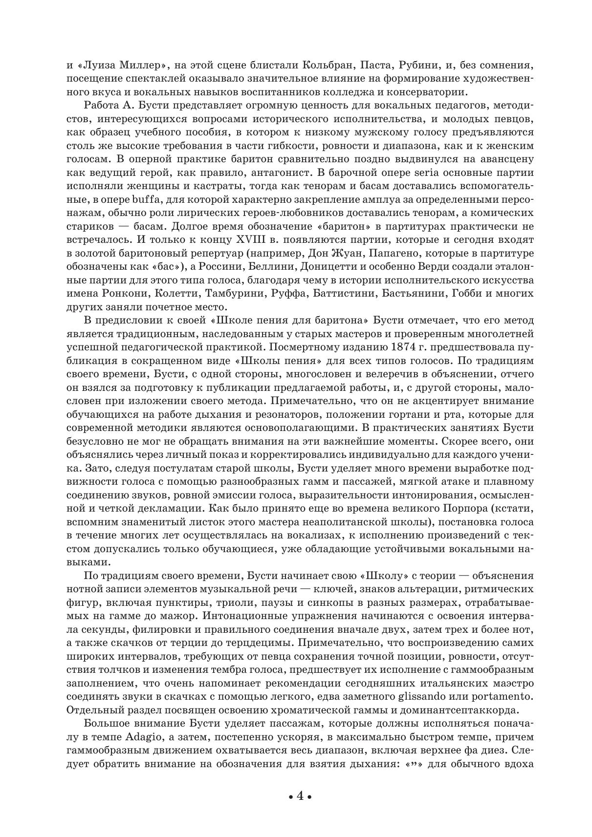In the preface to his "School of Singing for Baritone", Busti notes that his method is traditional, inherited from old masters and proved by many years of successful pedagogical practice. A.Busti's work is of great value for vocal pedagogues, methodologists interested in questions of historical singing and young singers, as an example of a manual in which the same high requirements for flexibility, smoothness and compass are imposed on the low masculine voice, as on female voices.