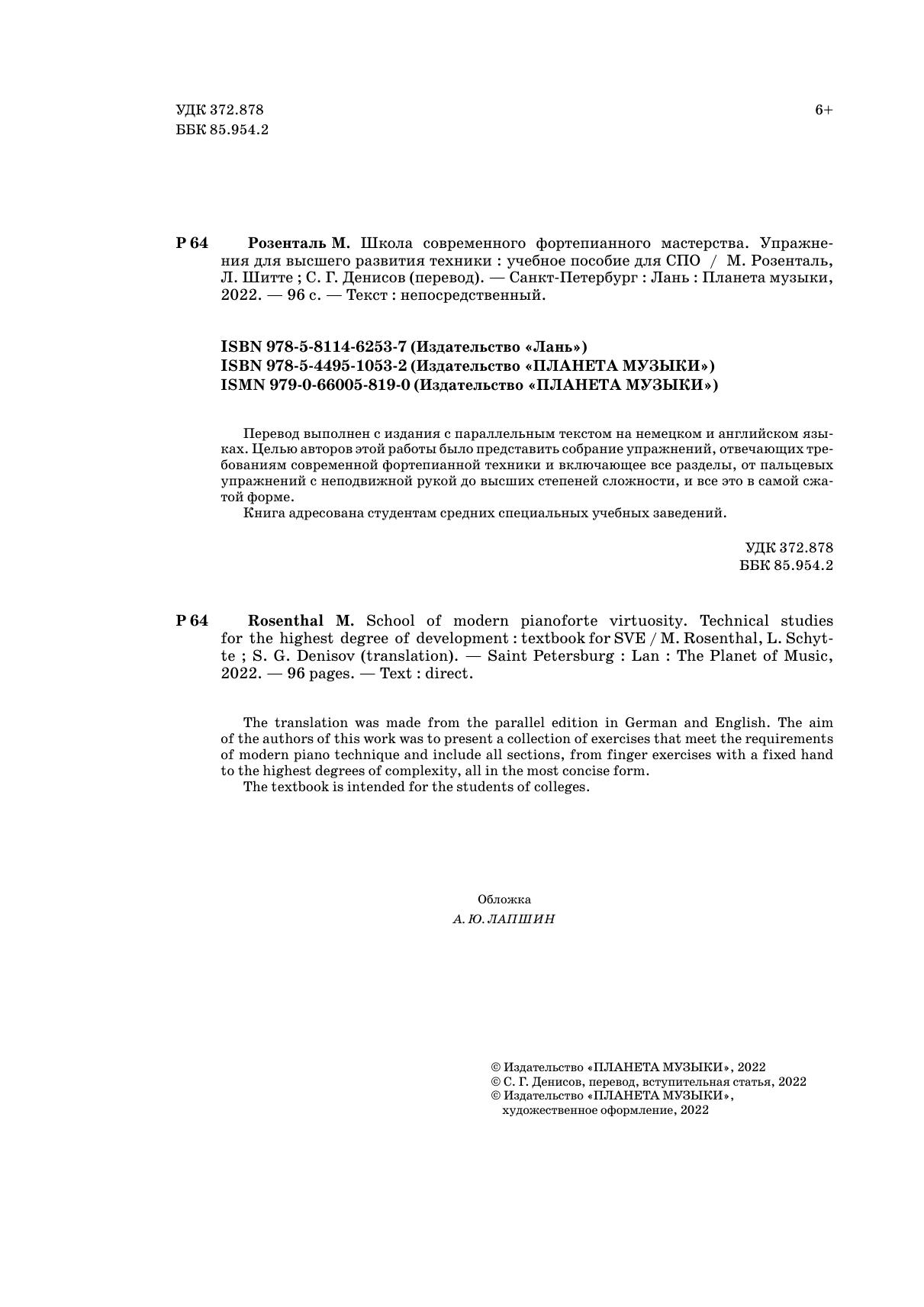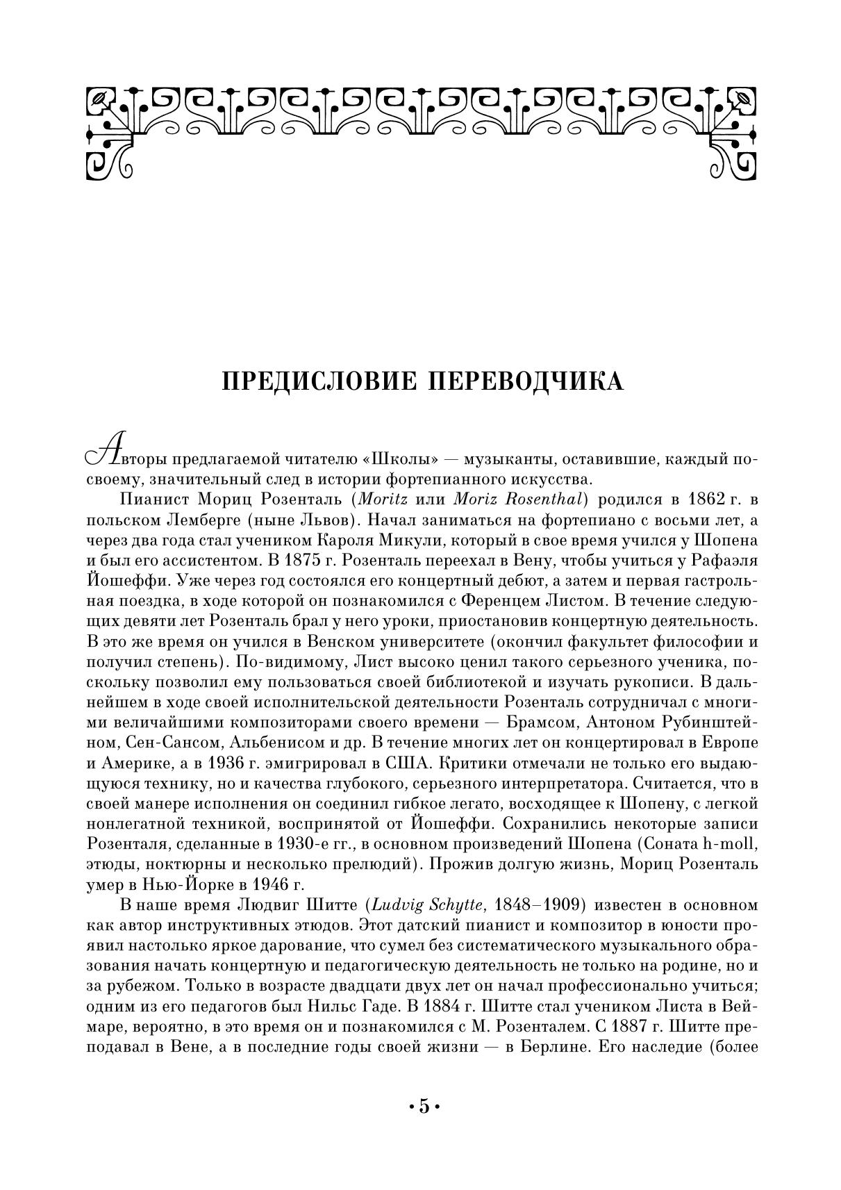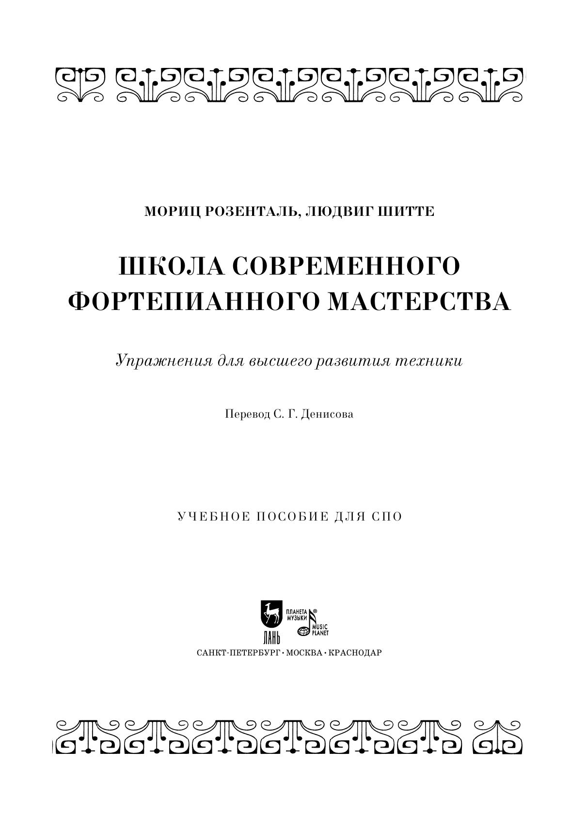 The translation was made from the parallel edition in German and English. The aim of the authors of this work was to present a collection of exercises that meet the requirements of modern piano technique and include all sections, from finger exercises with a fixed hand to the highest degrees of complexity, all in the most concise form.