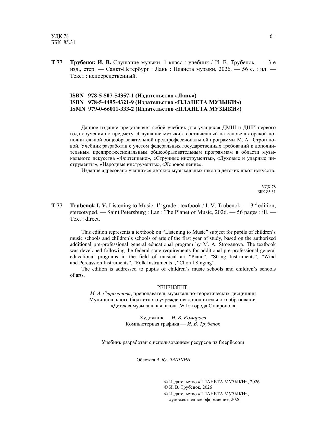 Данное учебное пособие представляет собой учебник для учащихся ДМШ и ДШИ первого года обучения по предмету «Слушание музыки». Учебник составлен на основе авторской дополнительной общеобразовательной предпрофессиональной программе Строгановой М.А. Пособие разработано с учетом федеральных государственных требований к дополнительным предпрофессиональным общеобразовательным программам в области музыкального искусства «Фортепиано», «Струнные инструменты», «Духовые и ударные инструменты», «Народные инструменты», «Хоровое пение». Издание адресовано учащимся детских музыкальных школ и детских школ искусств. This edition represents a textbook on “Listening to Music” subject for pupils of children’s music schools and children’s schools of arts of the first year of study, based on the authorized additional pre-professional general educational program by M. A. Stroganova. The textbook was developed following the federal state requirements for additional pre-professional general educational programs in the field of musical art “Piano”, “String Instruments”, “Wind and Percussion Instruments”, “Folk Instruments”, “Choral Singing”. The edition is addressed to pupils of children’s music schools and children’s schools of arts.