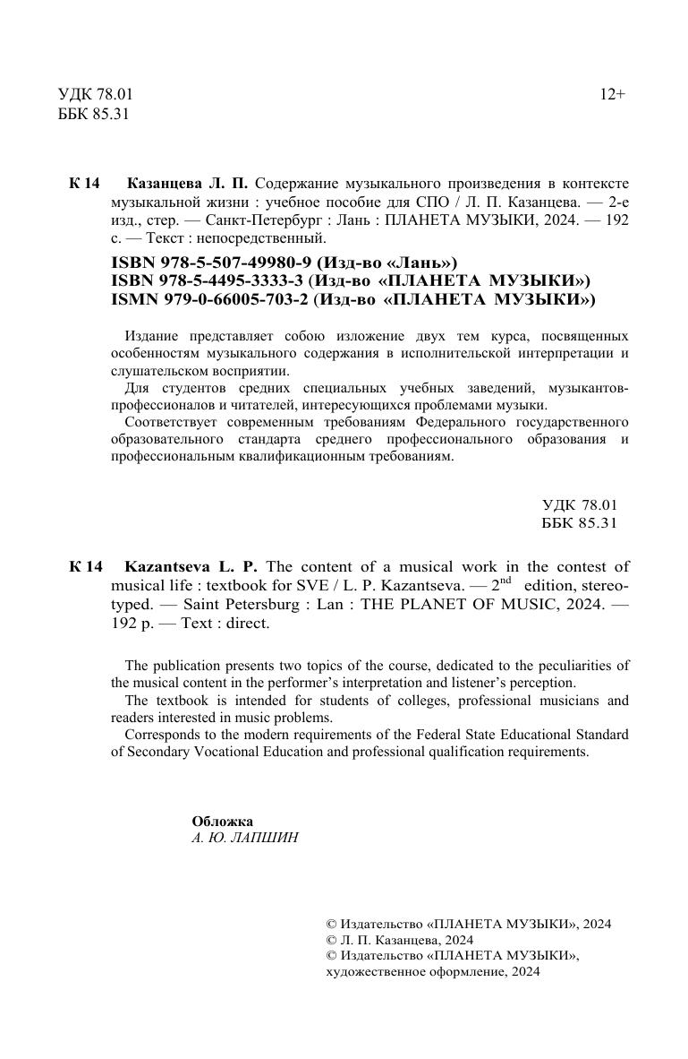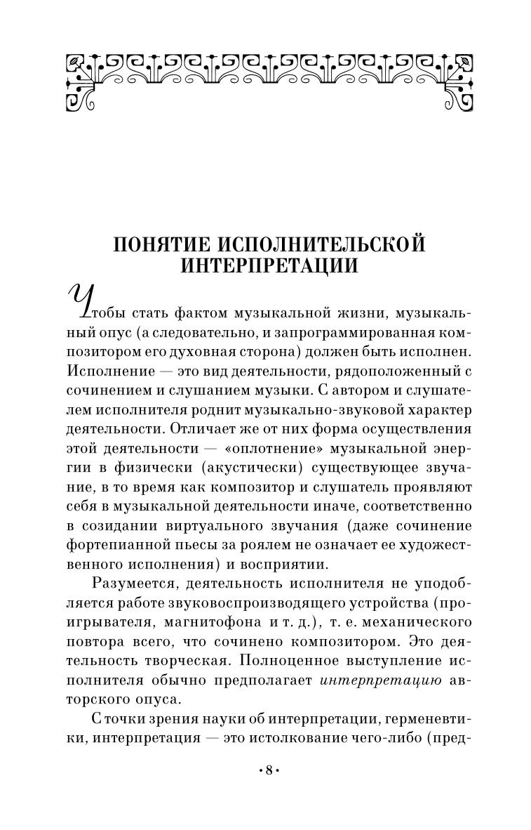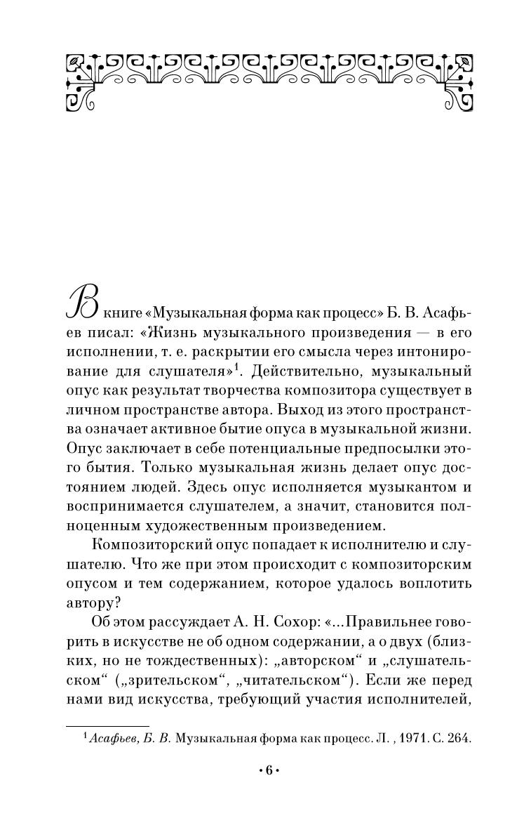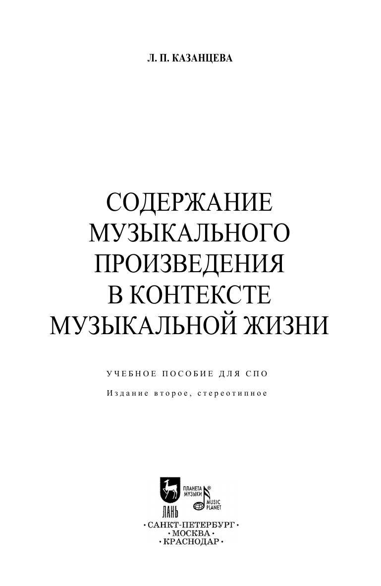 Издание представляет собою изложение двух тем курса, посвященных особенностям музыкального содержания в исполнительской интерпретации и слушательском восприятии. Для студентов средних специальных учебных заведений, музыкантов-профессионалов и читателей, интересующихся проблемами музыки. The publication presents two topics of the course, dedicated to the peculiarities of the musical content in the performer’s interpretation and listener’s perception. The textbook is intended for students of colleges, professional musicians and readers interested in music problems.