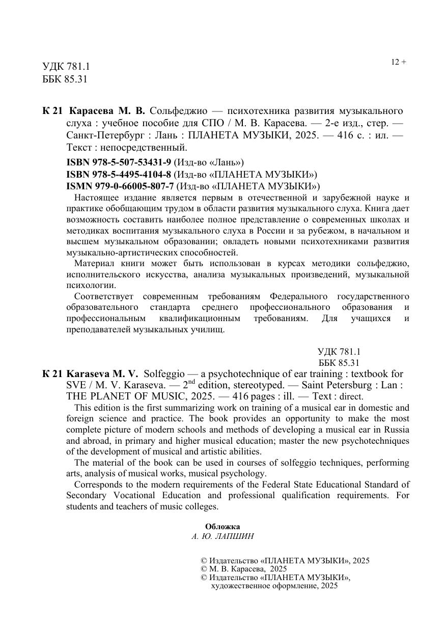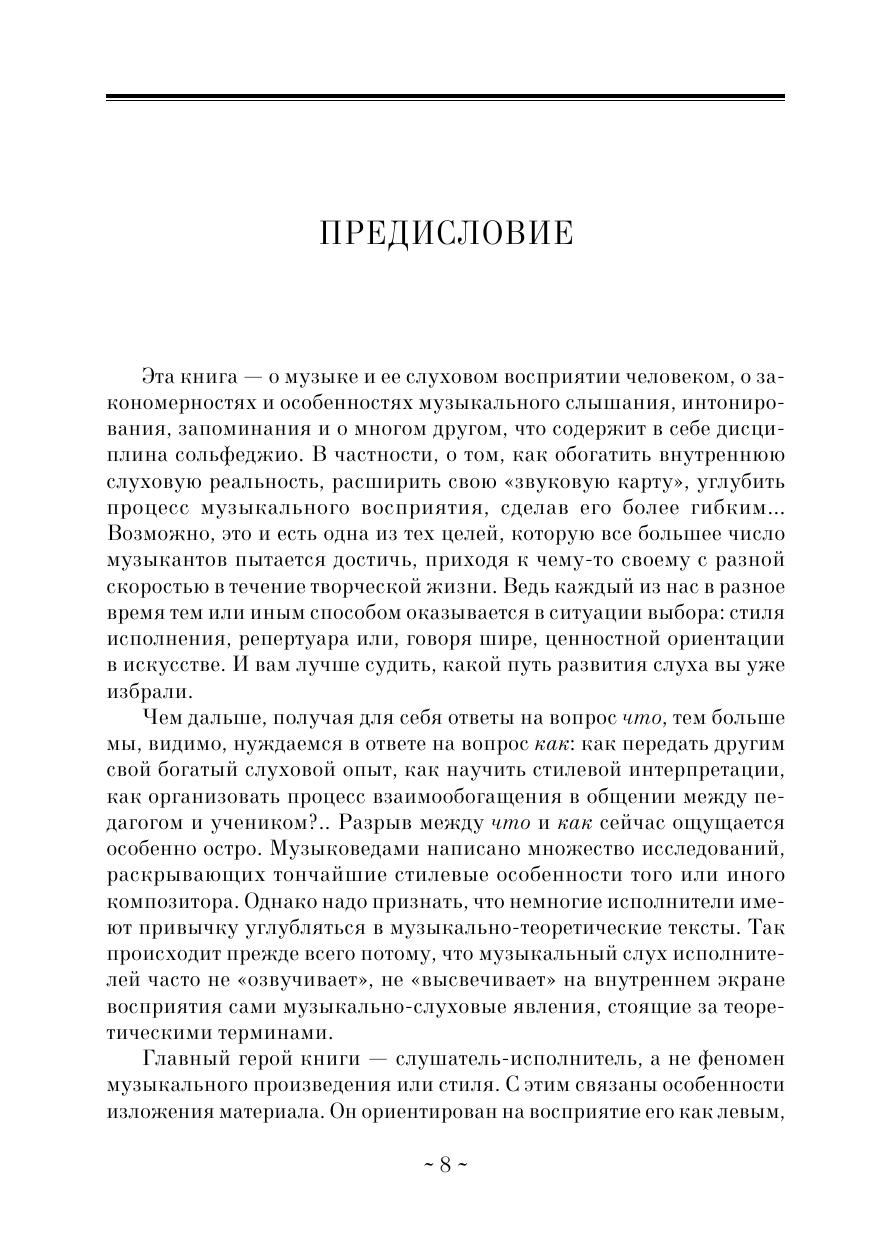 Настоящее издание является первым в отечественной и зарубежной науке и практике обобщающим трудом в области развития музыкального слуха. Книга дает возможность составить наиболее полное представление о современных школах и методиках воспитания музыкального слуха в России и за рубежом, в начальном и высшем музыкальном образовании, овладеть новыми психотехниками развития музыкально-артистических способностей. Материал книги может быть использован в курсах методики сольфеджио, исполнительского искусства, анализа музыкальных произведений, музыкальной психологии. Для учащихся и преподавателей музыкальных училищ. This edition is the first summarizing work on development of a musical ear in domestic and foreign science and practice. The book provides an opportunity to make the most complete picture of modern schools and methods of developing a musical ear in Russia and abroad, in primary and higher musical education, master the new psychotechniques of the development of musical and artistic abilities. The material of the book can be used in courses of solfeggio techniques, performing arts, analysis of musical works, musical psychology. For students and teachers of music colleges.