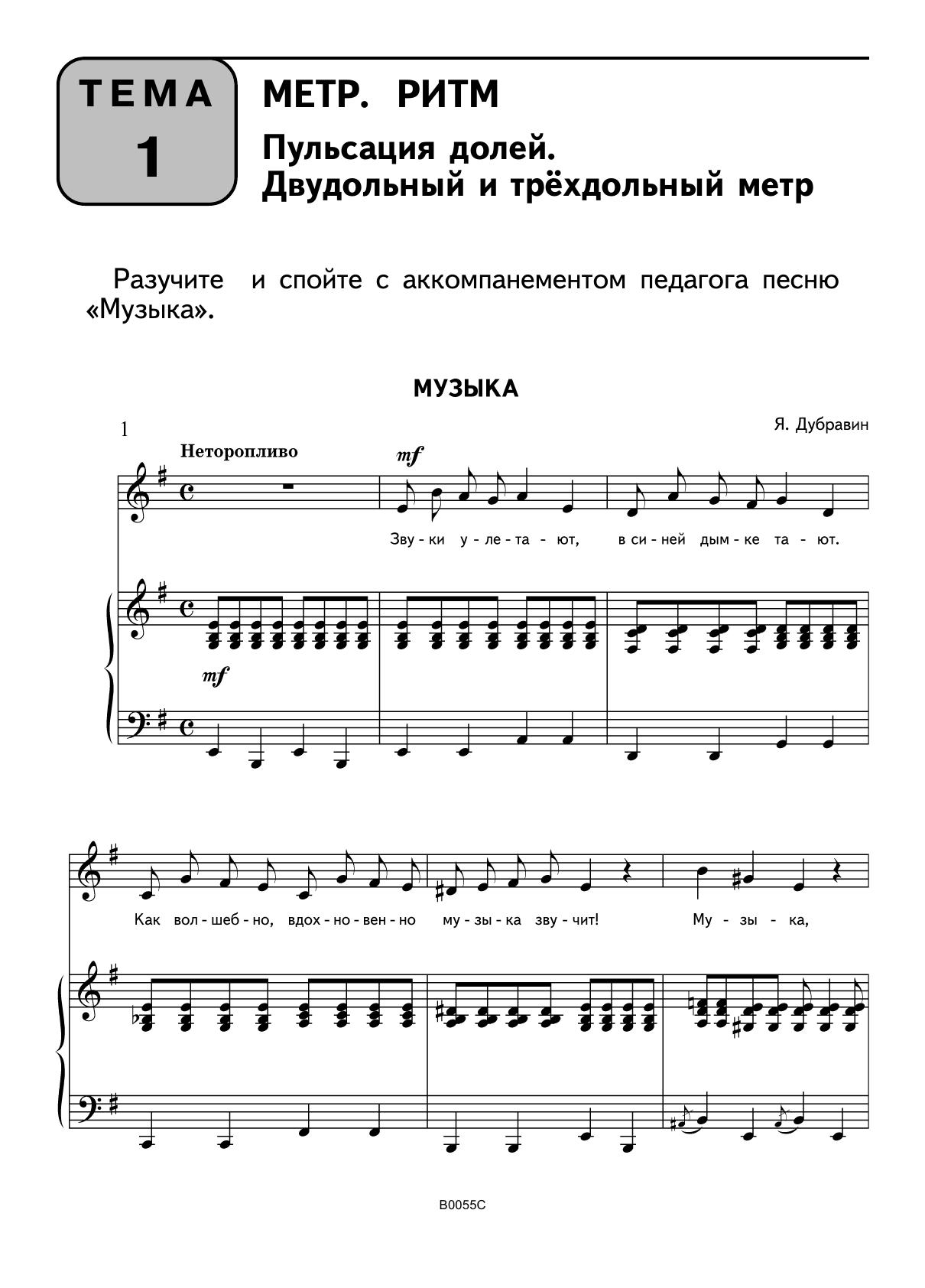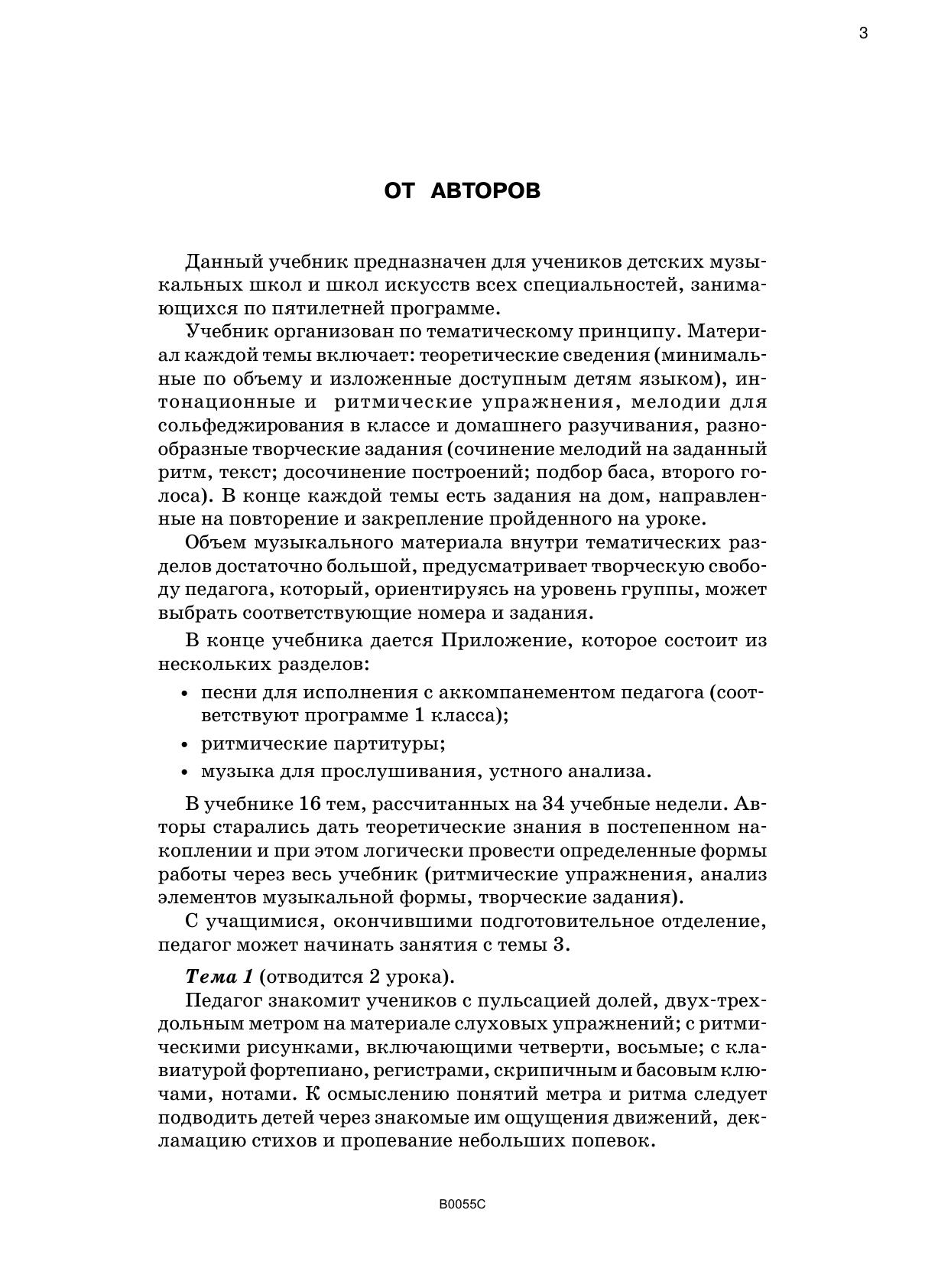 Учебное пособие организовано по тематическому принципу: включает теоретический материал 16 тем, упражнения и задания. В приложении даны песни для исполнения с аккомпанементом педагога, ритмические упражнения, произведения для слухового анализа. Адресовано учащимся 1 классов детских музыкальных школ и школ искусств, занимающимся по пятилетней программе обучения. Может применяться на занятиях с учащимися 1 классов, занимающимися по семилетней программе обучения.