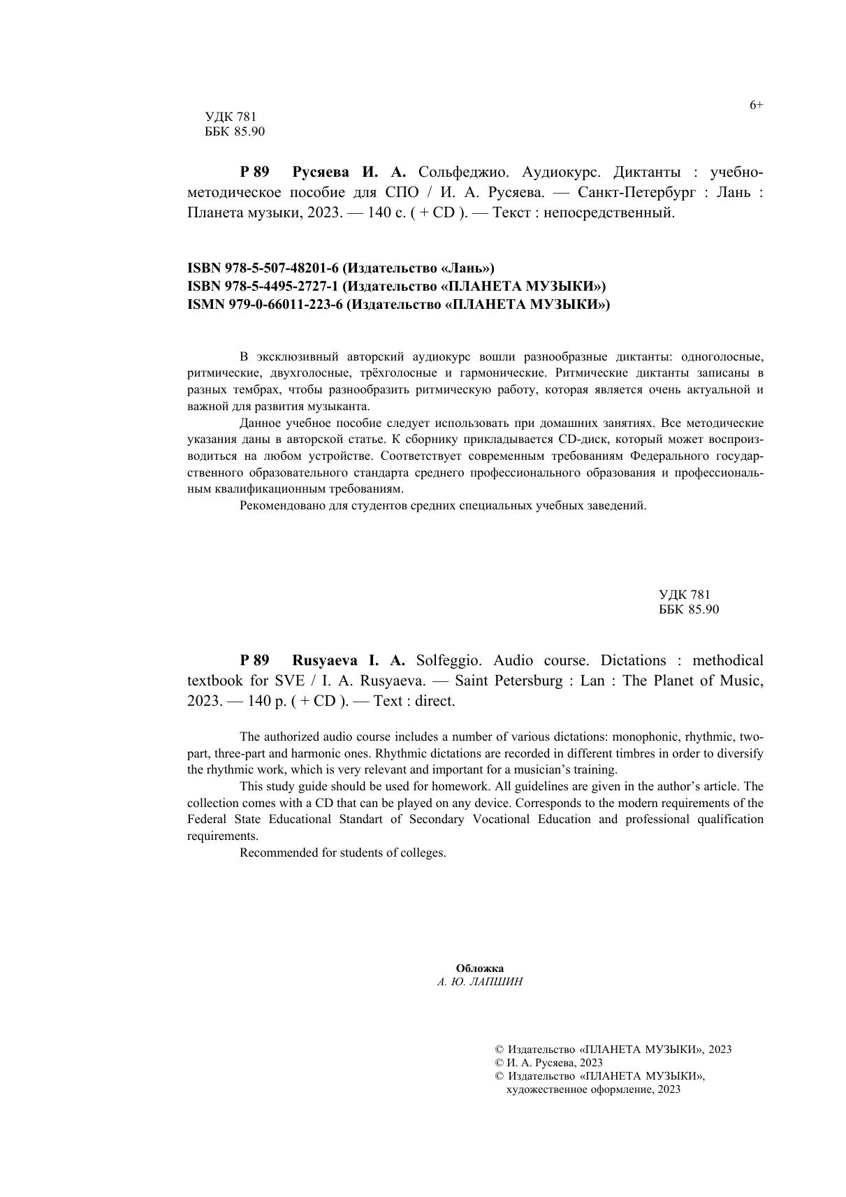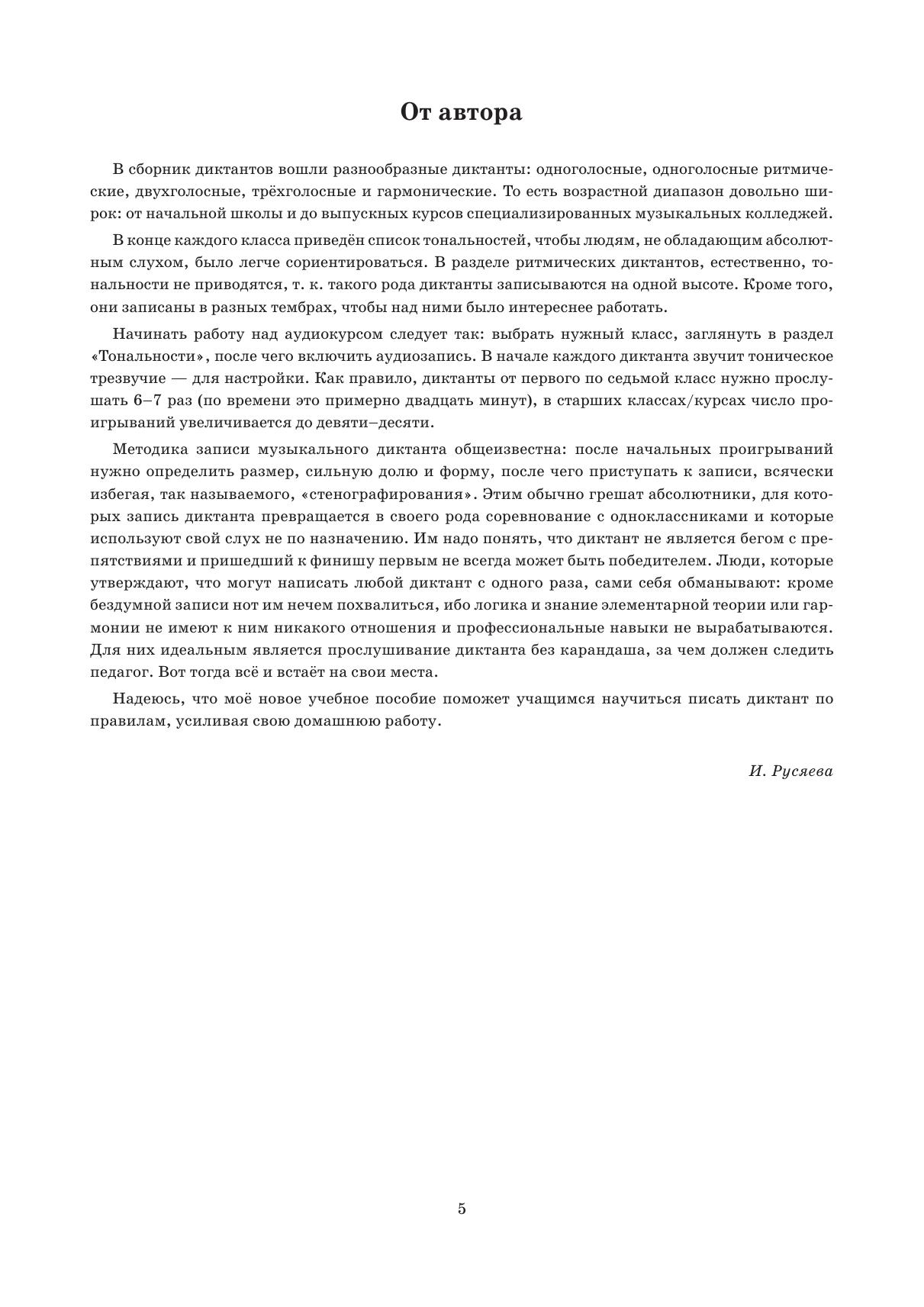В эксклюзивный авторский аудиокурс вошли разнообразные диктанты: одноголосные, ритмические, двухголосные, трёхголосные и гармонические. Ритмические диктанты записаны в разных тембрах, чтобы разнообразить ритмическую работу, которая является очень актуальной и важной для развития музыканта. Данное учебное пособие следует использовать при домашних занятиях. Все методические указания даны в авторской статье. К сборнику прикладывается DVD-диск, который может воспроизводиться на любом устройстве. Соответствует современным требованиям Федерального государственного образовательного стандарта среднего профессионального образования и профессиональным квалификационным требованиям. Рекомендовано для студентов средних специальных учебных заведений. The authorized audio course includes a number of various dictations: monophonic, rhythmic, two-part, three-part and harmonic ones. Rhythmic dictations are recorded in different timbres in order to diversify the rhythmic work, which is very relevant and important for a musician’s training. This study guide should be used for homework. All guidelines are given in the author’s article. The collection comes with a CD that can be played on any device. Corresponds to the modern requirements of the Federal State Educational Standart of Secondary Vocational Education and professional qualification requirements. Recommended for students of colleges.