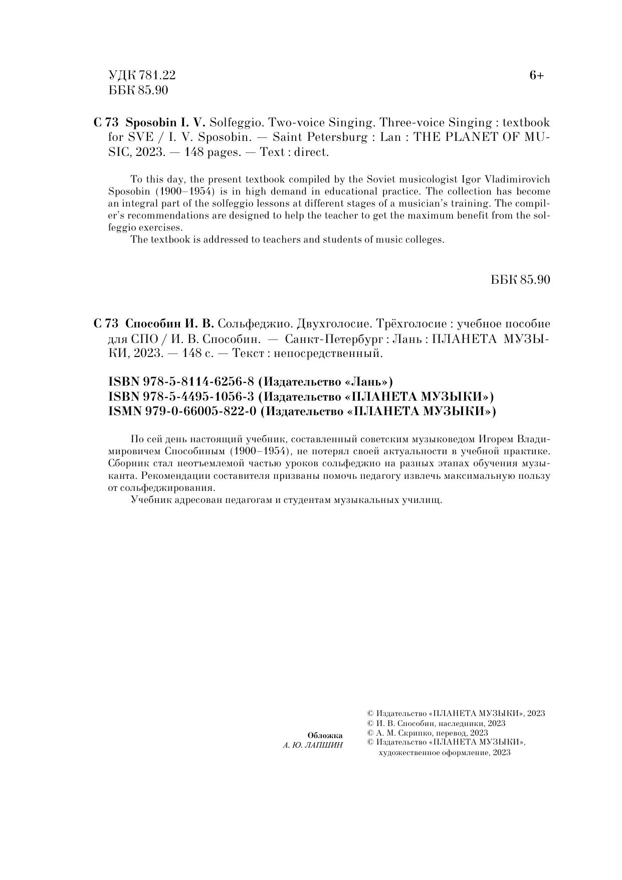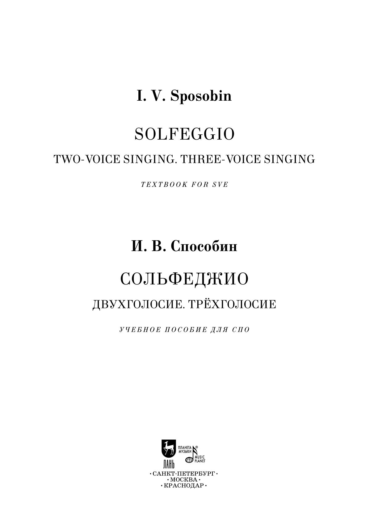 To this day, the present textbook compiled by the Soviet musicologist Igor Vladimirovich Sposobin (1900–1954) is in high demand in educational practice. The collection has become an integral part of the solfeggio lessons at different stages of a musician’s training. The compiler’s recommendations are designed to help the teacher to get the maximum benefit from the solfeggio exercises. Corresponds to the modern requirements of the Federal State Educational Standard of Secondary Vocational Education and professional qualification requirements. The textbook is addressed to students of music colleges.