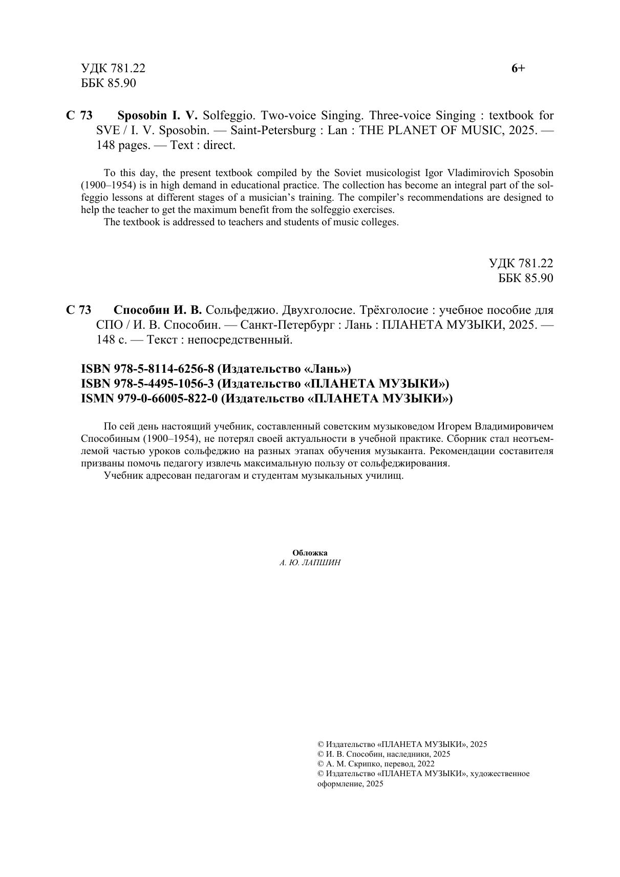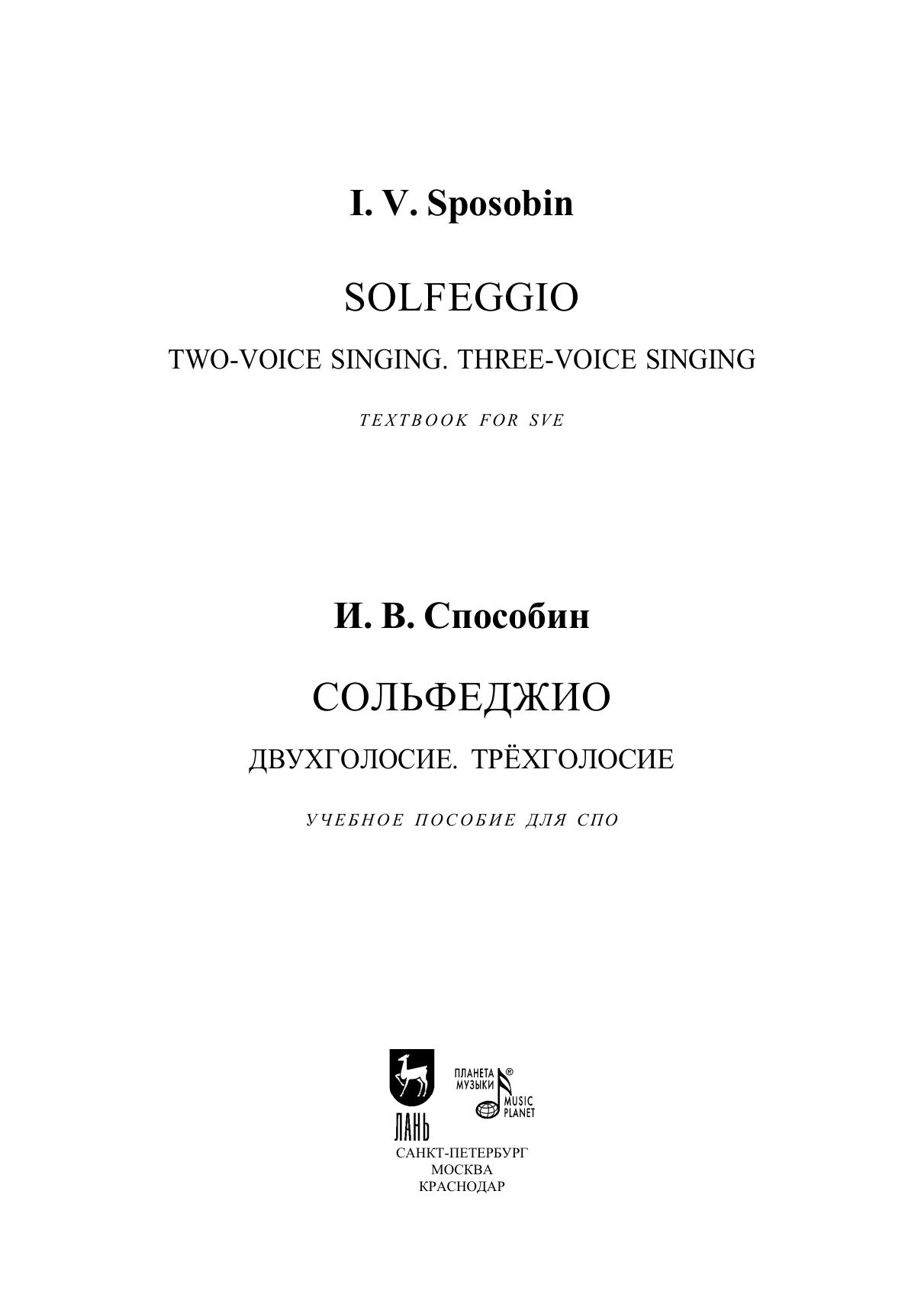 По сей день настоящий учебник, составленный советским музыковедом Игорем Владимировичем Способиным (1900-1954), не потерял своей актуальности в учебной практике. Сборник стал неотъемлемой частью уроков сольфеджио на разных этапах обучения музыканта. Рекомендации составителя призваны помочь педагогу извлечь максимальную пользу от сольфеджирования. Учебник адресован студентам музыкальных училищ. To this day, the present textbook compiled by the Soviet musicologist Igor Vladimirovich Sposobin (1900–1954) is in high demand in educational practice. The collection has become an integral part of the solfeggio lessons at different stages of a musician’s training. The compiler’s recommendations are designed to help the teacher to get the maximum benefit from the solfeggio exercises. The textbook is addressed to students of music colleges.
