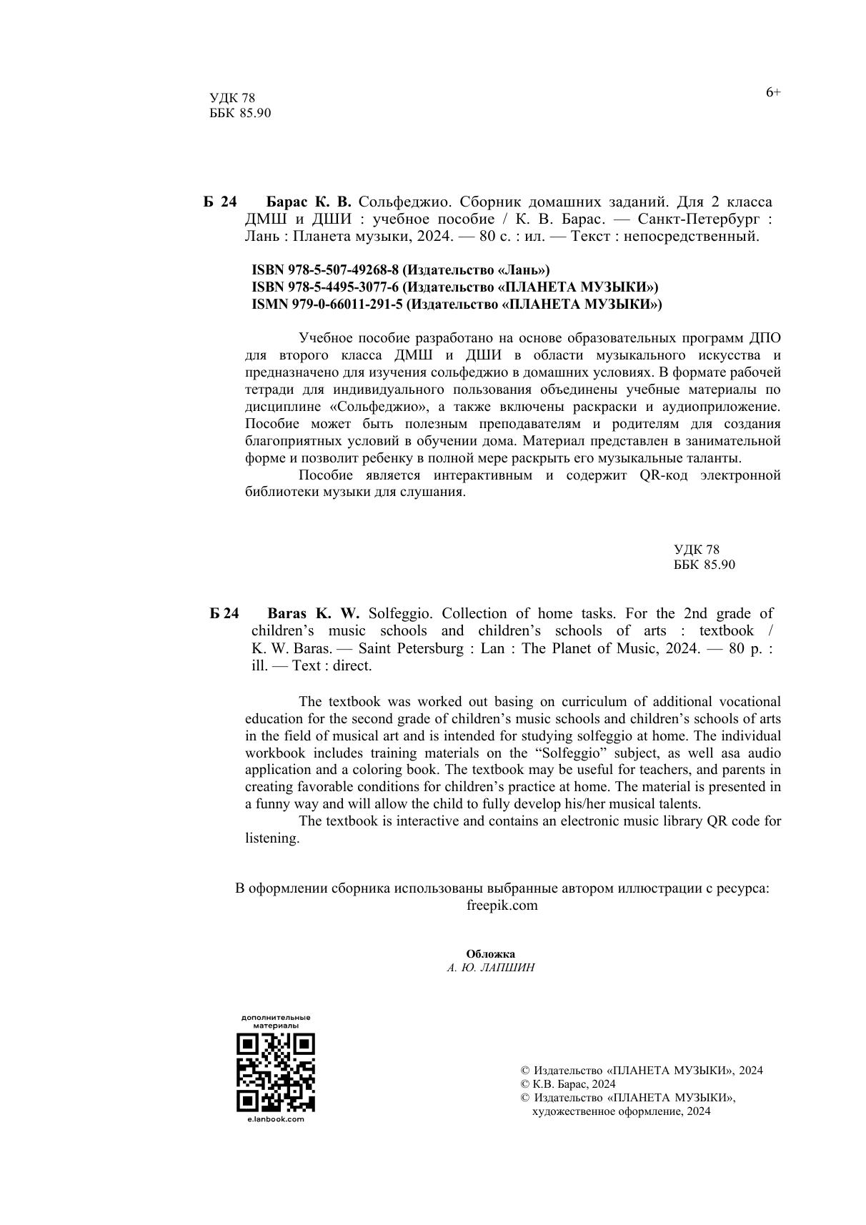Учебное пособие разработано на основе образовательных программ ДПО для второго класса ДМШ и ДШИ в области музыкального искусства и предназначено для изучения сольфеджио в домашних условиях. В формате рабочей тетради для индивидуального пользования объединены учебные материалы по дисциплине «Сольфеджио», а также включены раскраски и аудиоприложение. Пособие может быть полезным преподавателям и родителям для создания благоприятных условий в обучении дома. Материал представлен в занимательной форме и позволит ребёнку в полной мере раскрыть его музыкальные таланты. Пособие является интерактивным и содержит QR-код электронной библиотеки музыки для слушания. The textbook was worked out basing on curriculum of additional vocational education for the second grade of children’s music schools and children’s schools of arts in the field of musical art and is intended for studying solfeggio at home. The individual workbook includes training materials on the “Solfeggio” subject, as well asa audio application and a coloring book. The textbook may be useful for teachers, and parents in creating favorable conditions for children’s practice at home. The material is presented in a funny way and will allow the child to fully develop his/her musical talents. The textbook is interactive and contains an electronic music library QR code for listening.