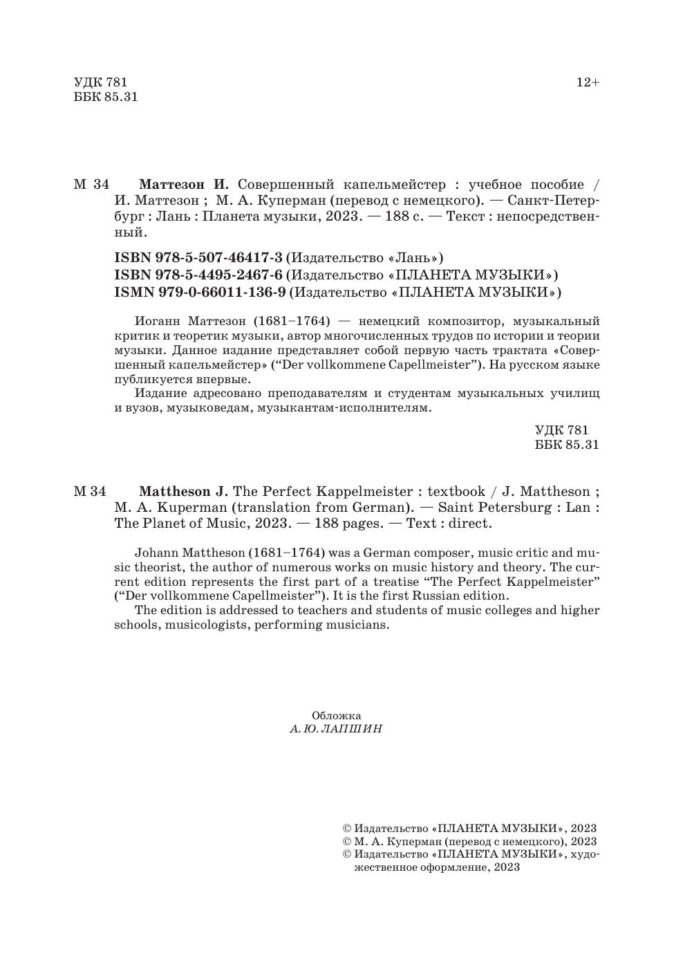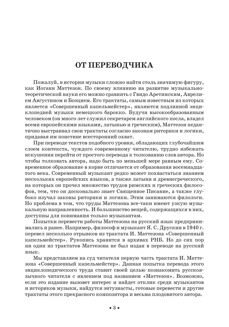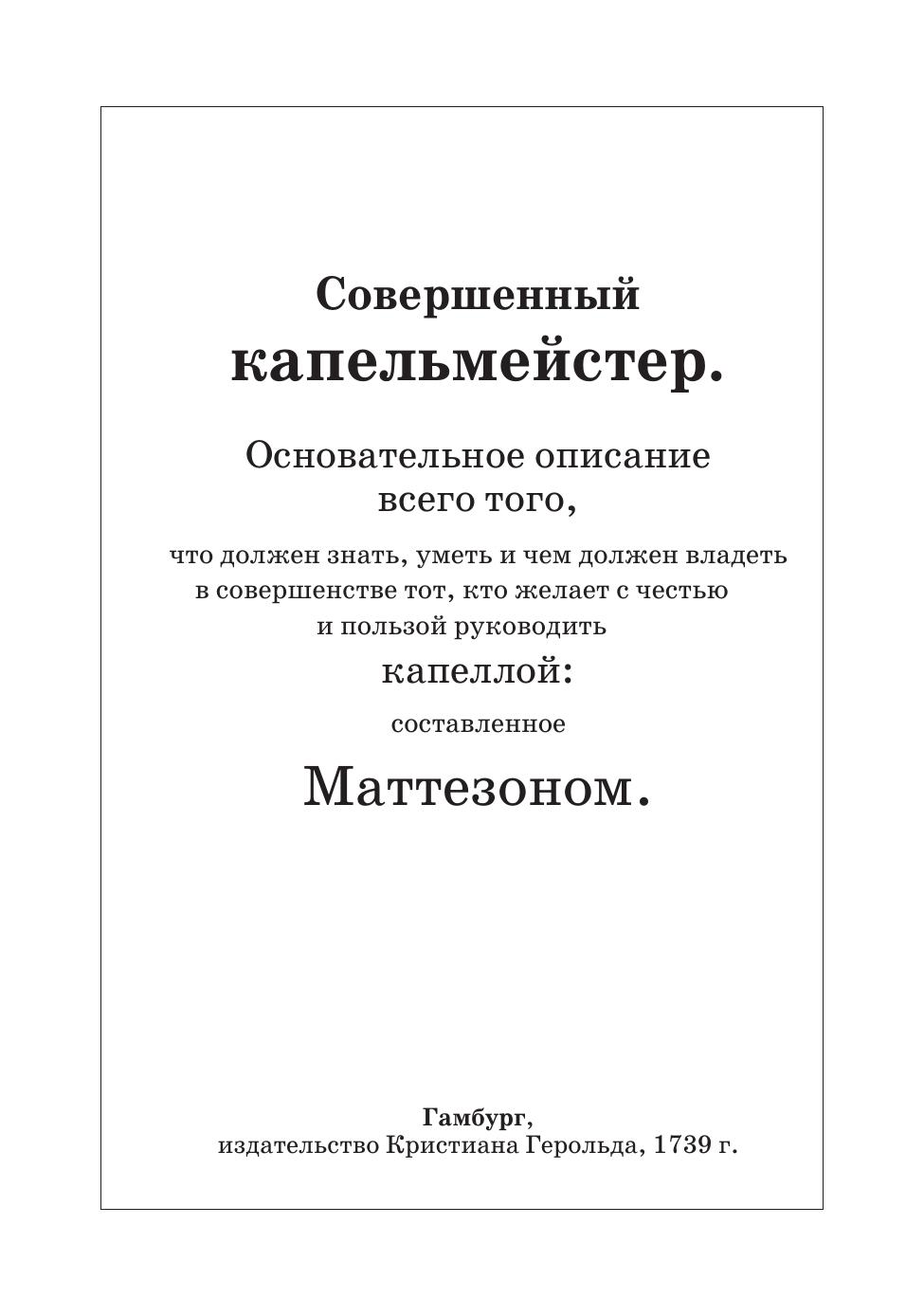 Иоганн Маттезон (1681-1764) - немецкий композитор, музыкальный критик и теоретик музыки, автор многочисленных трудов по истории и теории музыки. Данное издание представляет собой первую часть трактата "Совершенный капельмейстер". На русском языке публикуется впервые. Издание адресовано преподавателям и студентам музыкальных училищ и вузов, музыковедам, музыкантам-исполнителям. Johann Mattheson (1681–1764) was a German composer, music critic and music theorist, the author of numerous works on music history and theory. The current edition represents the first part of a treatise “The Perfect Kappelmeister” (“Der vollkommene Capellmeister”). It is the first Russian edition. The edition is addressed to teachers and students of music colleges and higher schools, musi-cologists, performing musicians.