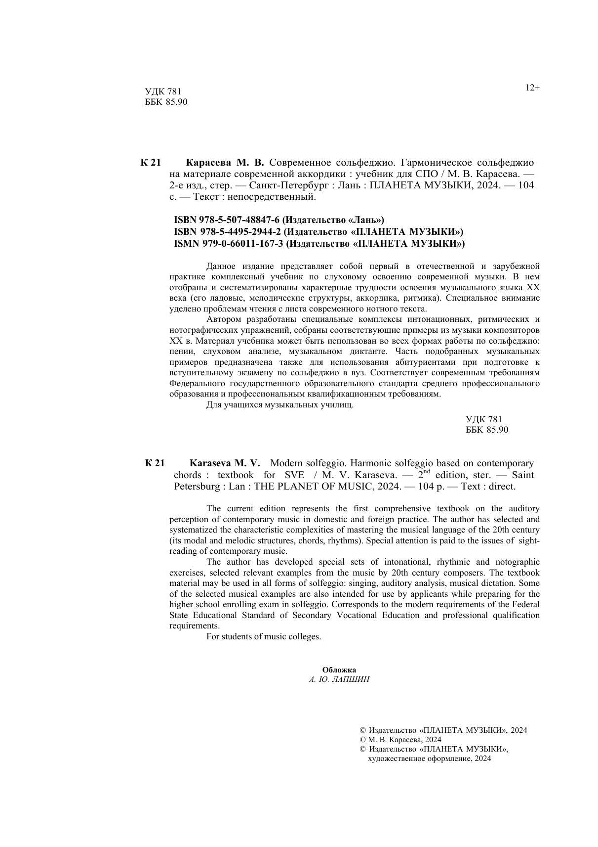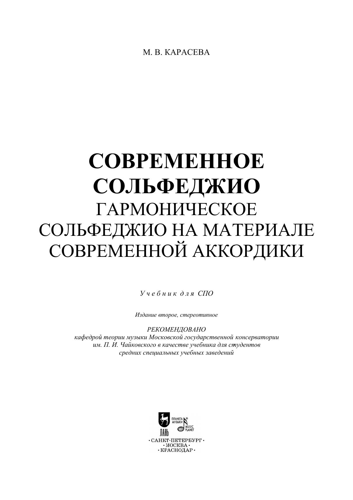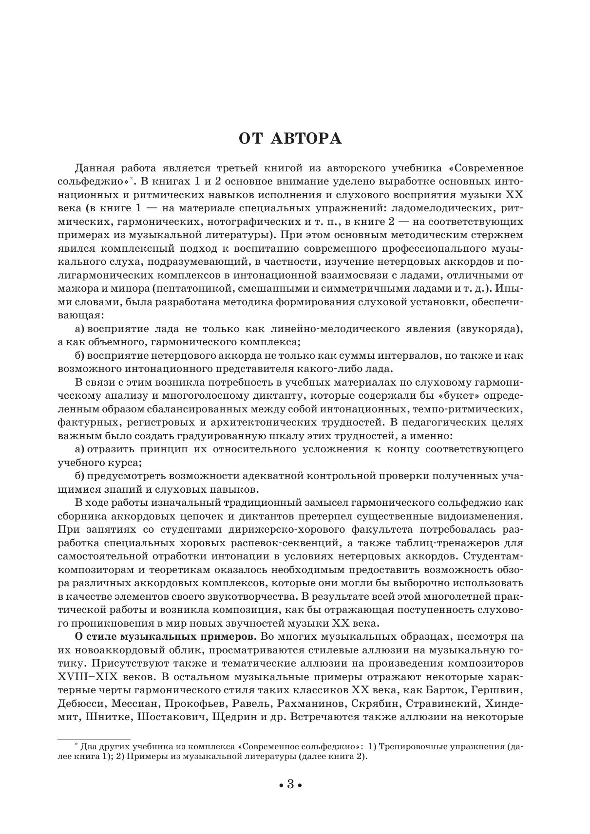 Данное издание представляет собой первый в отечественной и зарубежной практике КОМПЛЕКСНЫЙ УЧЕБНИК по слуховому освоению современной музыки. В нем отобраны и систематизированы характерные трудности освоения музыкального языка ХХ века (его ладовые, мелодические структуры, аккордика, ритмика). Специальное внимание уделено проблемам чтения с листа современного нотного текста. Автором разработаны специальные комплексы интонационных, ритмических и нотографических упражнений, собраны соответствующие примеры из музыки композиторов ХХ в. Материал учебника может быть использован во всех формах работы по сольфеджио: пении, слуховом анализе, музыкальном диктанте. Часть подобранных музыкальных примеров предназначена также для использования абитуриентами при подготовке к вступительному экзамену по сольфеджио в вуз. Соответствует современным требованиям Федерального государственного образовательного стандарта среднего профессионального образования и профессиональным квалификационным требованиям. Для учащихся музыкальных училищ. The current edition represents the first comprehensive textbook on the auditory perception of contemporary music in domestic and foreign practice. The author has selected and systematized the characteristic complexities of mastering the musical language of the 20th century (its modal and melodic structures, chords, rhythms). Special attention is paid to the issues of sight-reading of contemporary music. The author has developed special sets of intonational, rhythmic and notographic exercises, selected relevant examples from the music by 20th century composers. The textbook material may be used in all forms of solfeggio: singing, auditory analysis, musical dictation. Some of the selected musical examples are also intended for use by applicants while preparing for the higher school enrolling exam in solfeggio. Corresponds to the modern requirements of the Federal State Educational Standard of Secondary Vocational Education and professional qualification requirements. For students of music colleges.