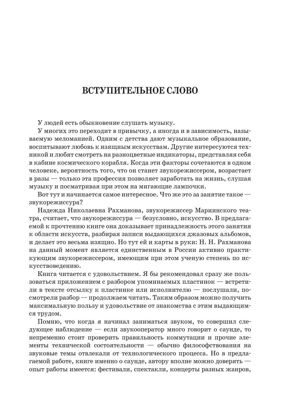 Надежда Николаевна Рахманова, звукорежиссёр Мариинского театра, считает, что звукорежиссура — искусство. В предлагаемой книге она исследует звукозапись джазовой музыки и доказывает проявление творческой индивидуальности в работе звукорежиссера. Все теоретические обобщения опираются на анализ фонограмм 17 альбомов, что может заинтересовать не только практикующих звукорежиссеров, но и любителей джаза. Книга содержит также значительное по объёму (более чем 180 звукозаписей) приложение, включающее в себя комплексный анализ фонограмм джазовой музыки, а также запись джазового стандарта «Autumn Leaves», сведённую четырьмя студийными звукорежиссёрами. Приложение существенно расширяет авторскую аргументацию. Каждый его раздел снабжен графической ссылкой на Интернет-ресурс, где размещен обсуждаемый альбом.