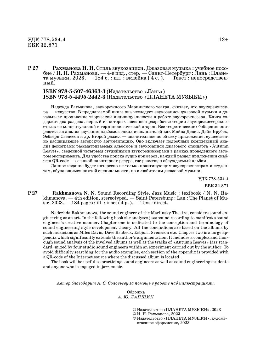 Надежда Рахманова, звукорежиссер Мариинского театра, считает, что звукорежиссура — искусство. В предлагаемой книге она исследует звукозапись джазовой музыки и до-казывает проявление творческой индивидуальности в работе звукорежиссера. Книга содержит два раздела, первый из которых посвящен разработке теории звукорежиссерского стиля: ее концептуальной и терминологической сторон. Все теоретические обобщения опираются на анализ звучания альбомов таких исполнителей как Майлз Девис, Дэйв Брубек, Эсбьёрн Свенссон и др. Второй раздел — значительное по объему приложение, существенно расширяющее авторскую аргументацию. Оно включает подробный комплексный ана-лиз фонограмм рассматриваемых альбомов и звукозаписи джазового стандарта «Autumn Leaves», сведенной четырьмя студийными звукорежиссерами в рамках проведенного авто-ром эксперимента. Для удобства поиска аудио примеров, каждый раздел приложения снабжен QR-code — ссылкой на интернет-ресурс, где размещен обсуждаемый альбом.