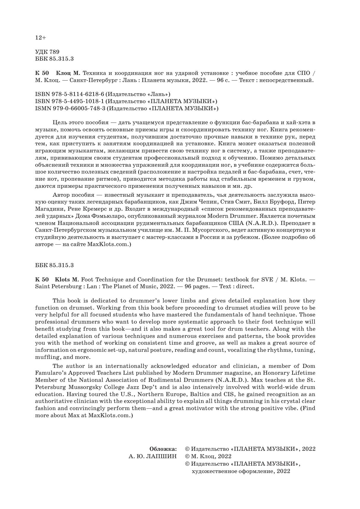 Цель этого пособия — дать учащемуся представление о функции бас-барабана и хай-хэта в музыке, помочь освоить основные приемы игры и скоординировать технику ног. Книга рекомендуется для изучения студентам, получившим достаточно прочные навыки в технике рук, перед тем, как приступить к занятиям координацией на установке. Помимо детальных объяснений техники и множества упражнений для координации ног, в учебнике содержится большое количество полезных сведений (расположение и настройка педалей и бас-барабана, счет, чтение нот, пропевание ритмов), приводится методика работы над стабильным временем и грувом, даются примеры практического применения полученных навыков и мн. др. Автор пособия — известный музыкант и преподаватель, чья деятельность заслужила высокую оценку таких легендарных барабанщиков, как Джим Чепин, Стив Смит, Билл Бруфорд, Питер Магадини, Рене Кремерс и др. Входит в международный «список рекомендованных преподавателей ударных» Дома Фэмьюларо, опубликованный журналом Modern Drummer. Является почетным членом Национальной ассоциации рудиментальных барабанщиков США (N.A.R.D.). Преподает в Санкт-Петербургском музыкальном училище им. М. П. Мусоргского, ведет активную концертную и студийную деятельность и выступает с мастер-классами в России и за рубежом.