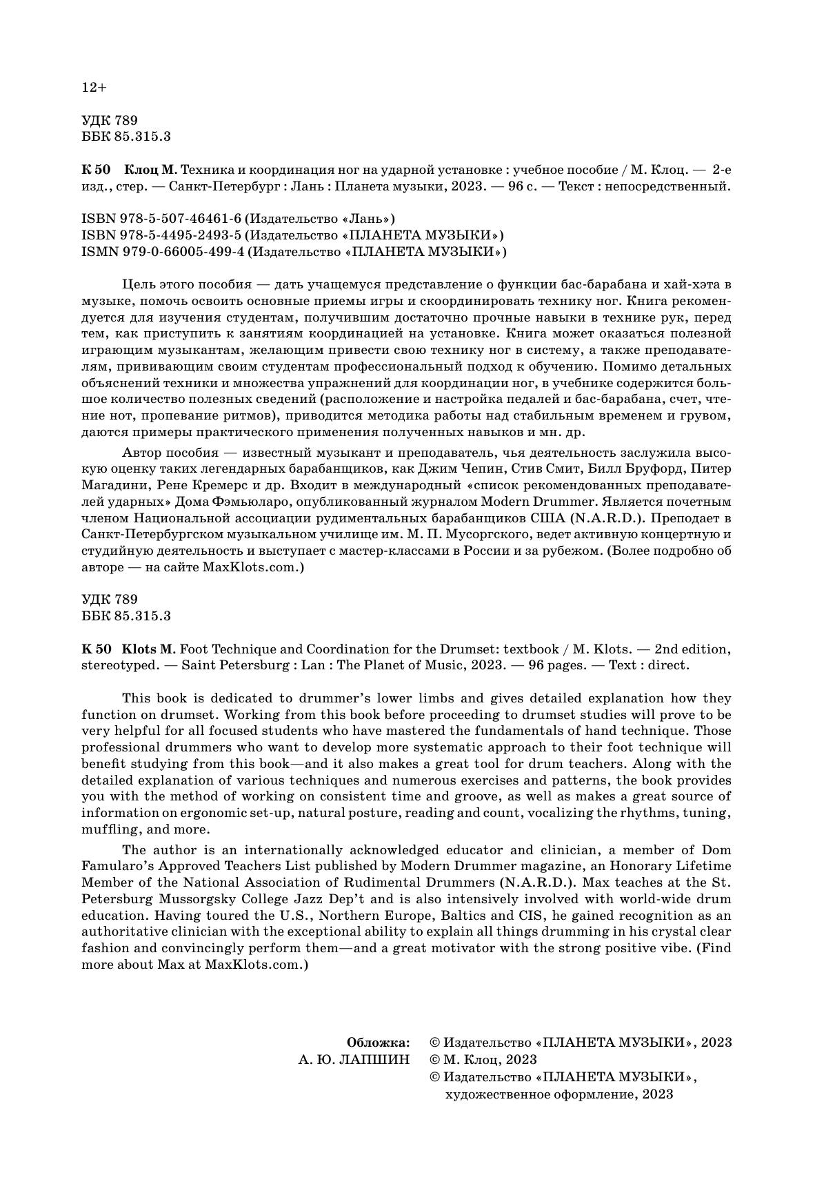 Автор пособия — известный музыкант и преподаватель, чья деятельность заслужила высокую оценку таких легендарных барабанщиков, как Джим Чепин, Стив Смит, Билл Бруфорд, Питер Магадини, Рене Кремерс и др. Входит в международный «список рекомендованных преподавателей ударных» Дома Фэмьюларо, опубликованный журналом Modern Drummer. Является почетным членом Национальной ассоциации рудиментальных барабанщиков США (N.A.R.D.). Преподает в Санкт-Петербургском музыкальном училище им. М. П. Мусоргского, ведет активную концертную и студийную деятельность и выступает с мастер-классами в России и за рубежом. (Более подробно об авторе — на сайте MaxKlots.com.)