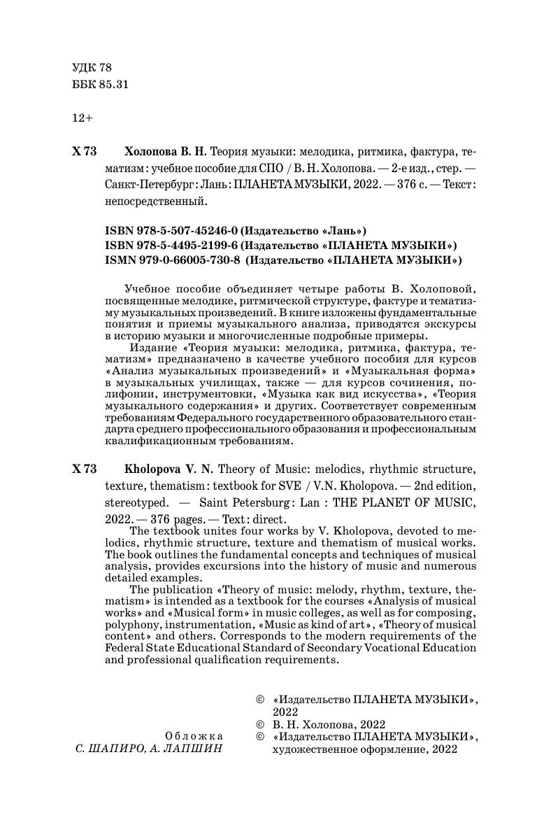 The textbook unites four works by V. Kholopova, devoted to melodics, rhythmic structure, texture and thematism of musical works. The book outlines the fundamental concepts and techniques of musical analysis, provides excursions into the history of music and numerous detailed examples.
