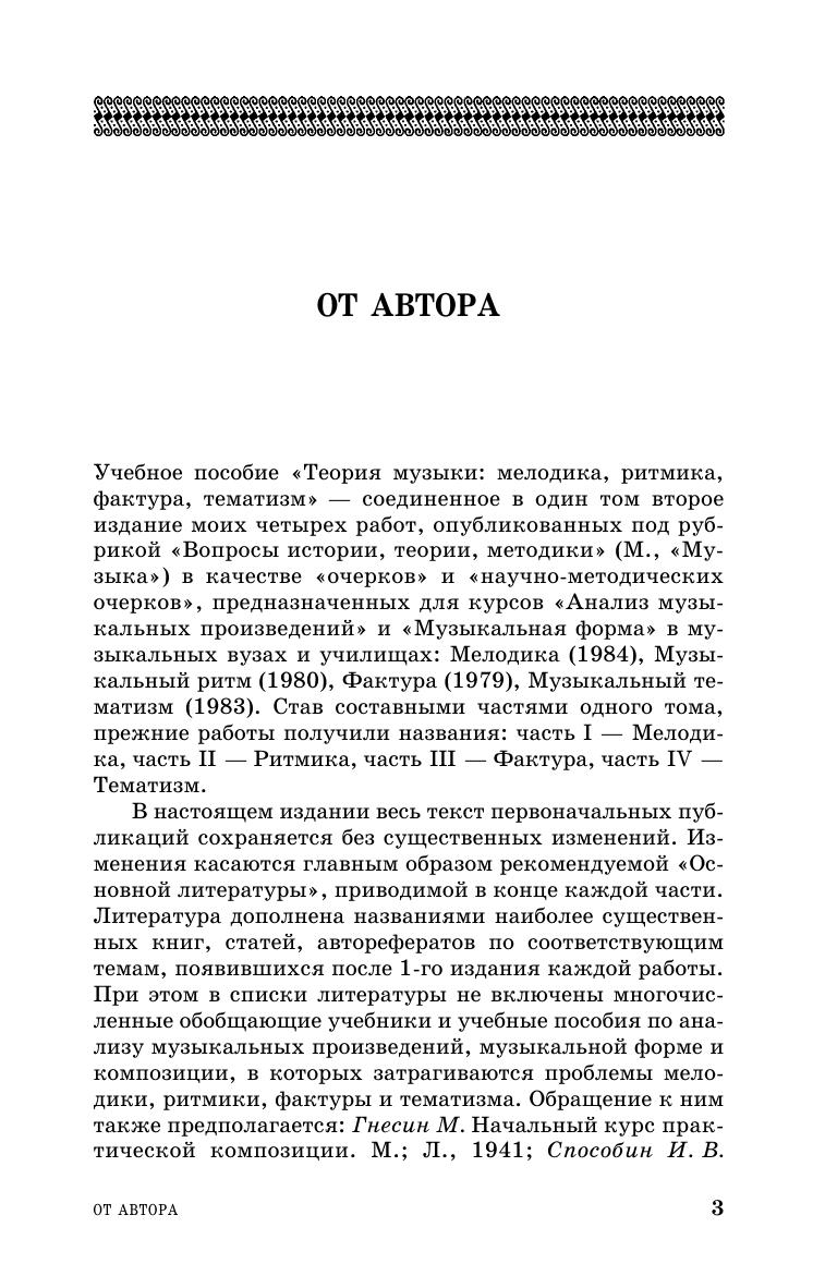 The publication «Theory of music: melody, rhythm, texture, thematism» is intended as a textbook for the course «Musical form» in music colleges, as well as for polyphony, instrumentation, composing and others.