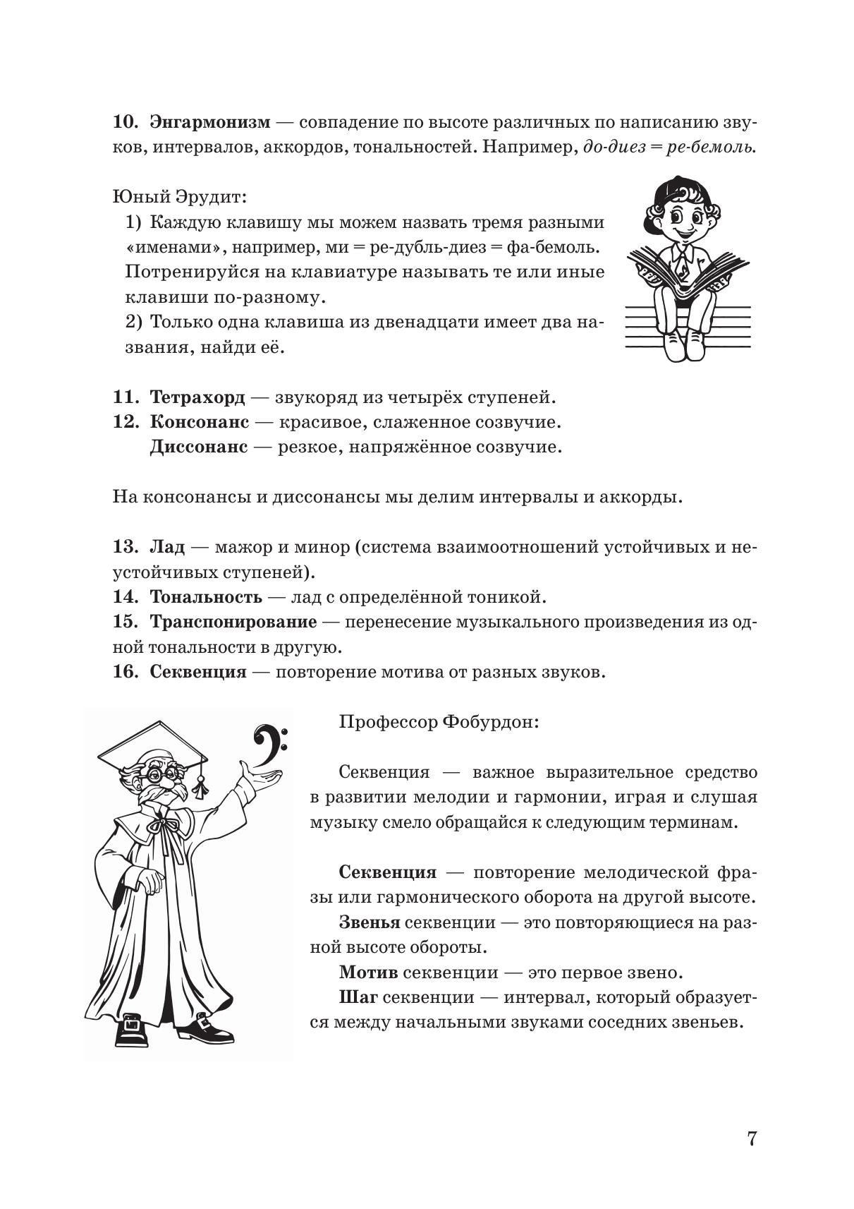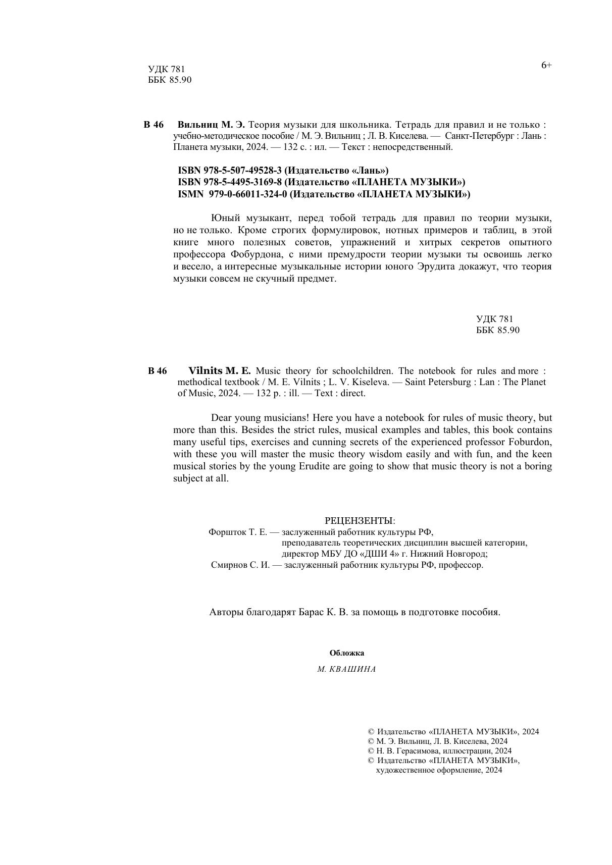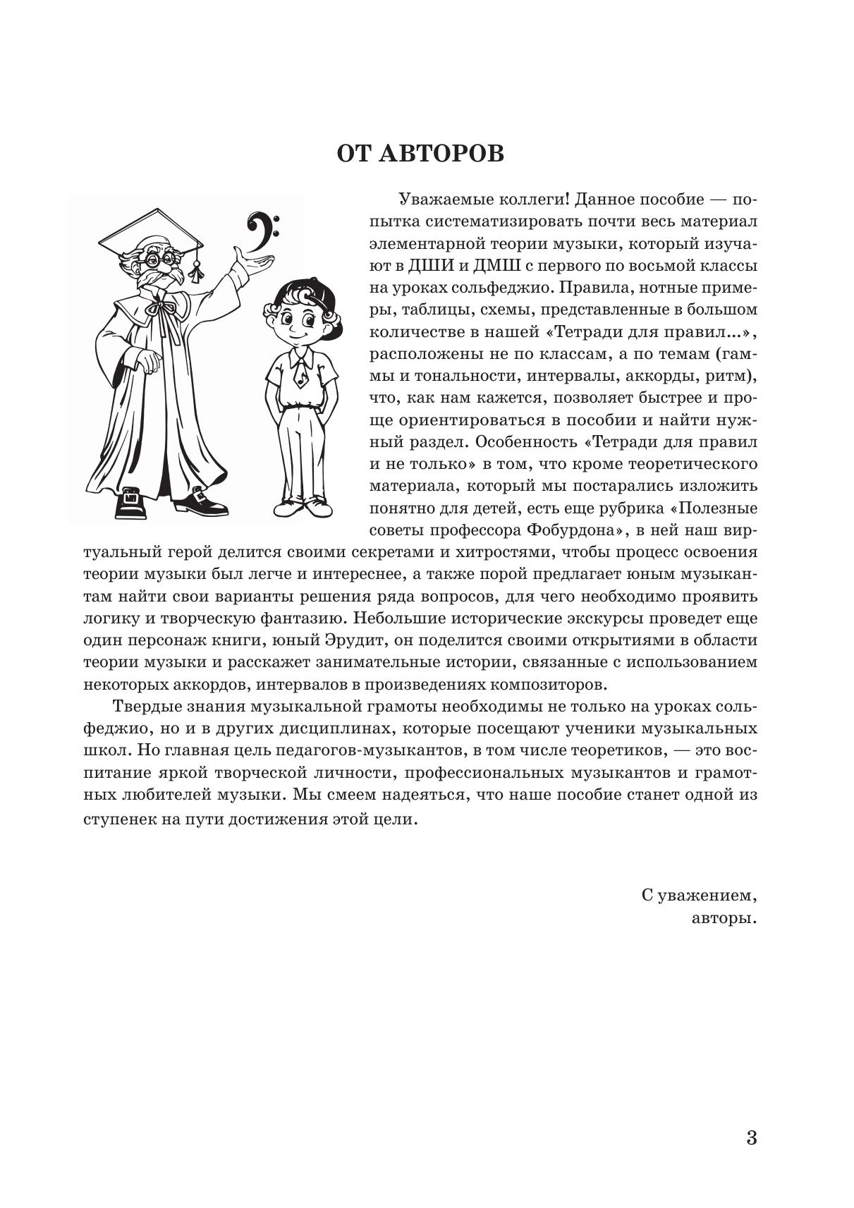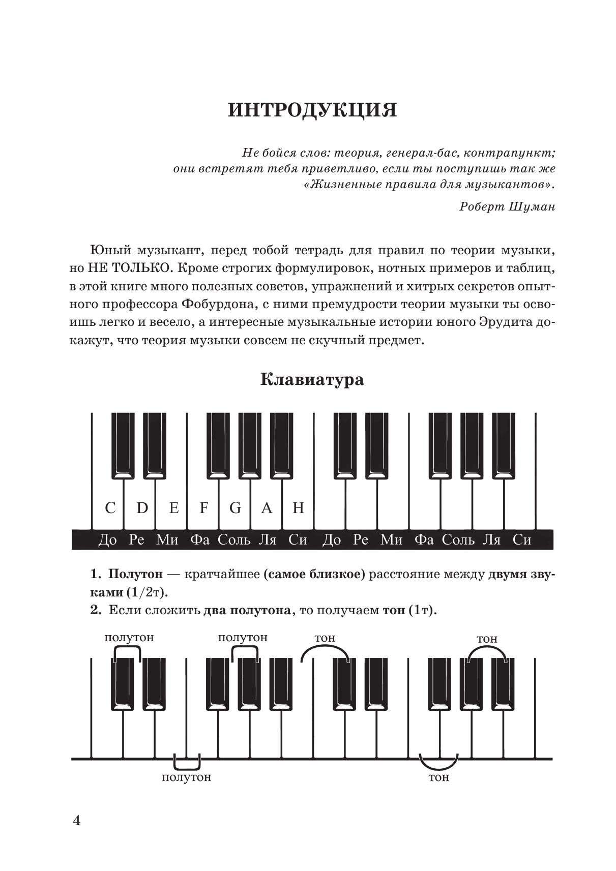 Юный музыкант, перед тобой тетрадь для правил по теории музыки, но не только. Кроме строгих формулировок, нотных примеров и таблиц, в этой книге много полезных советов, упражнений и хитрых секретов опытного профессора Фобурдона, с ними премудрости теории музыки ты освоишь легко и весело, а интересные музыкальные истории юного Эрудита докажут, что теория музыки совсем не скучный предмет. Dear young musicians! Here you have a notebook for rules of music theory, but more than this. Besides the strict rules, musical examples and tables, this book contains many useful tips, exercises and cunning secrets of the experienced professor Foburdon, with these you will master the music theory wisdom easily and with fun, and the keen musical stories by the young Erudite are going to show that music theory is not a boring subject at all.