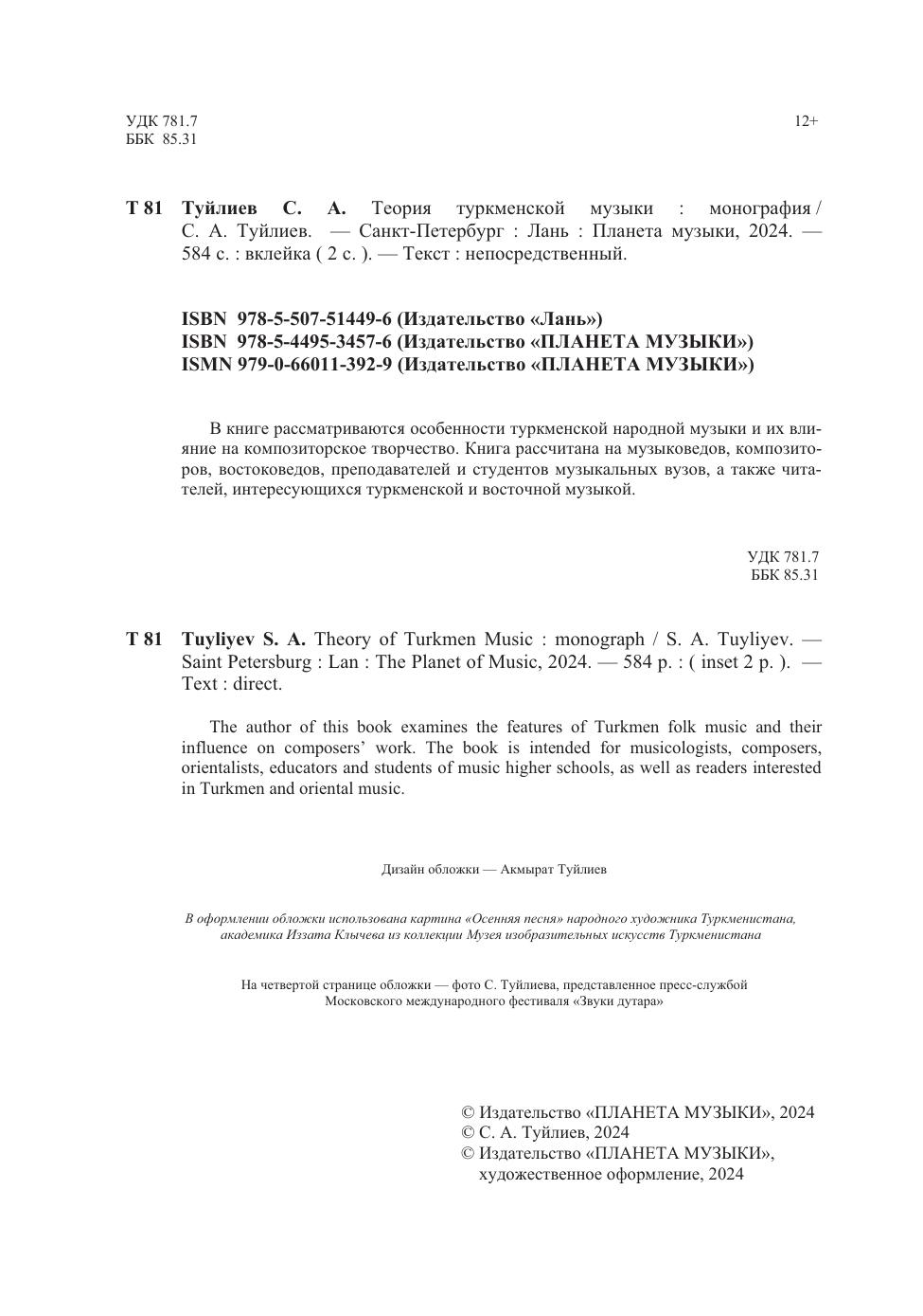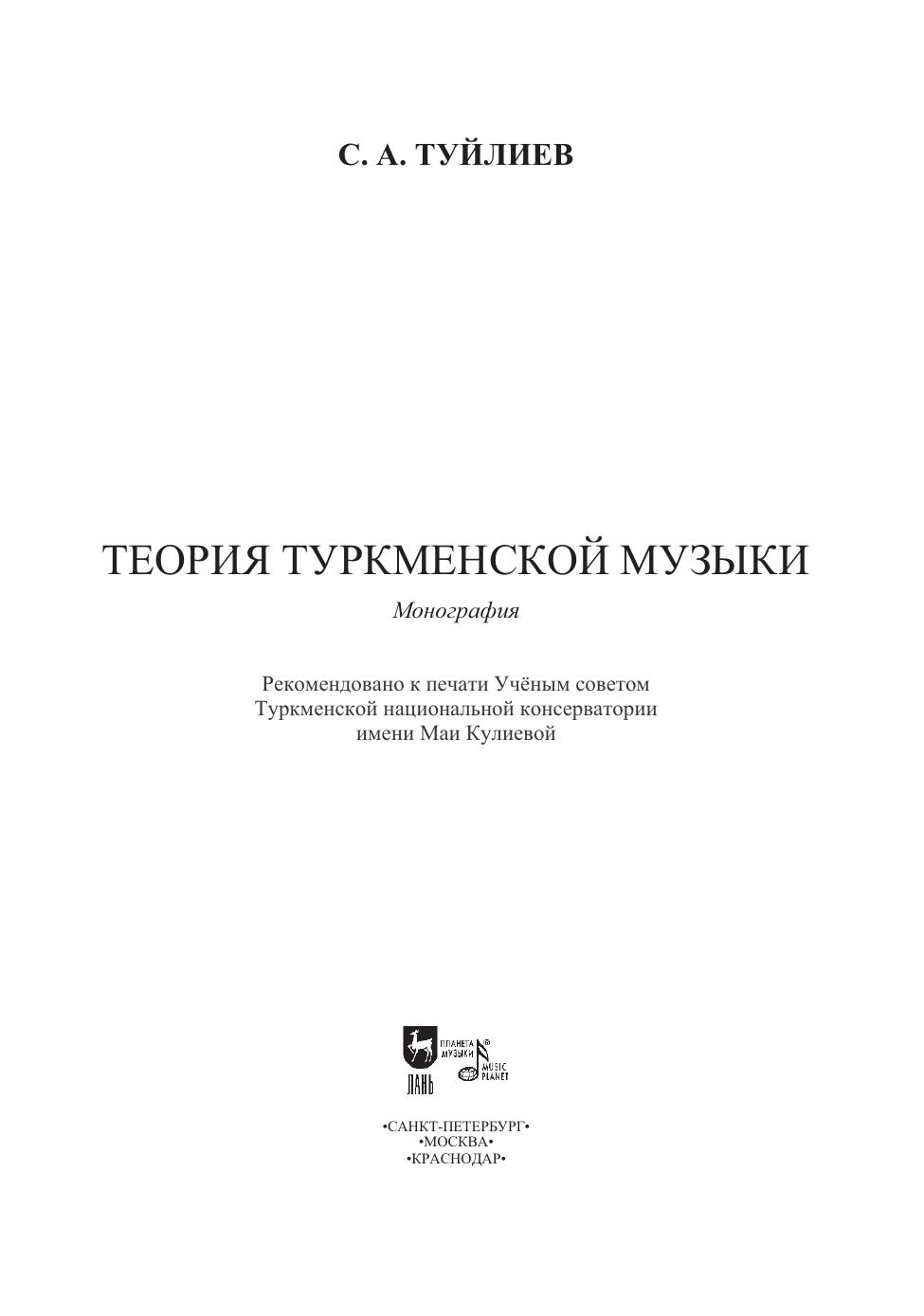 В книге рассматриваются особенности туркменской народной музыки и их влияние на композиторское творчество. Книга рассчитана на музыковедов, композиторов, востоковедов, преподавателей и студентов музыкальных вузов, а также читателей, интересующихся туркменской и восточной музыкой. The author of this book examines the features of Turkmen folk music and their influence on composers’ work. The book is intended for musicologists, composers, orientalists, educators and students of music higher schools, as well as readers interested in Turkmen and oriental music.