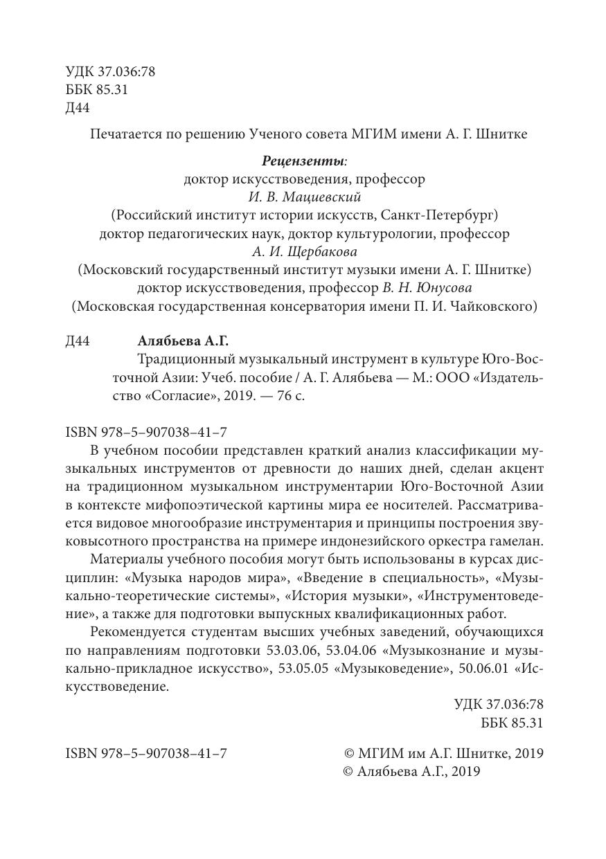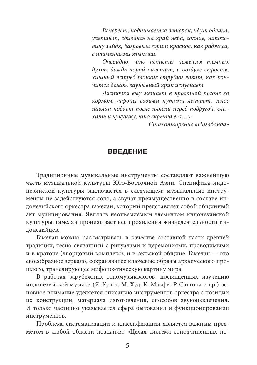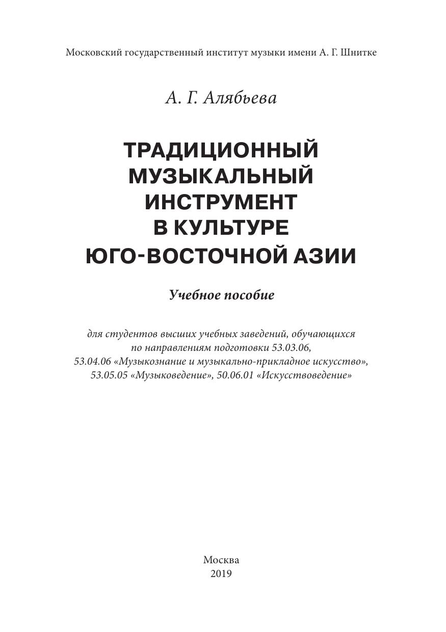 В учебном пособии представлен краткий анализ классификации музыкальных инструментов от древности до наших дней, сделан акцент на традиционном музыкальном инструментарии Юго Восточной Азии в контексте мифопоэтической картины мира ее носителей. Рассматривается видовое многообразие инструментария и принципы построения звуковысотного пространства на примере индонезийского оркестра гамелан. Материалы учебного пособия могут быть использованы в курсах дисциплин: «Музыка народов мира», «Введение в специальность», «Музыкально-теоретические системы», «История музыки», «Инструментоведение», а также для подготовки выпускных квалификационных работ. Рекомендуется студентам высших учебных заведений, обучающихся по направлениям подготовки 53.03.06, 53.04.06 «Музыкознание и музыкально-прикладное искусство», 53.05.05 «Музыковедение», 50.06.01 «Искусствоведение.