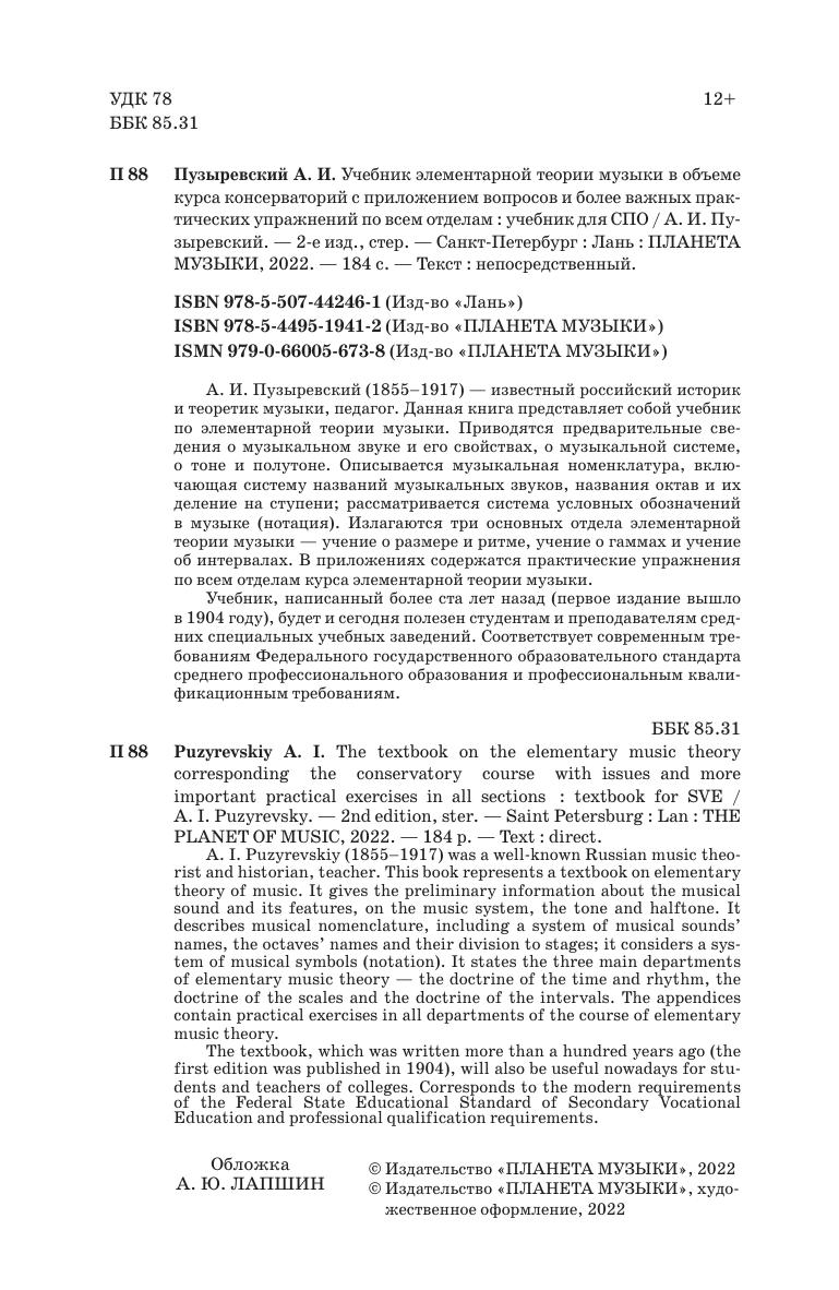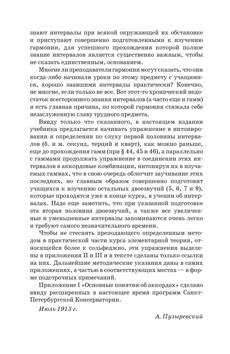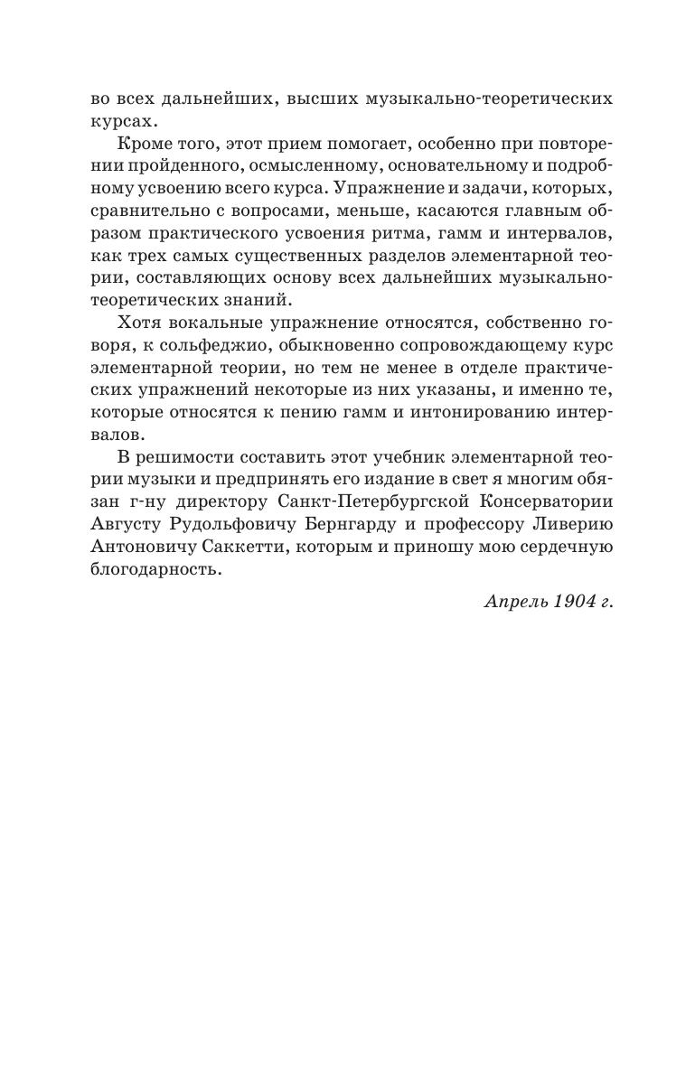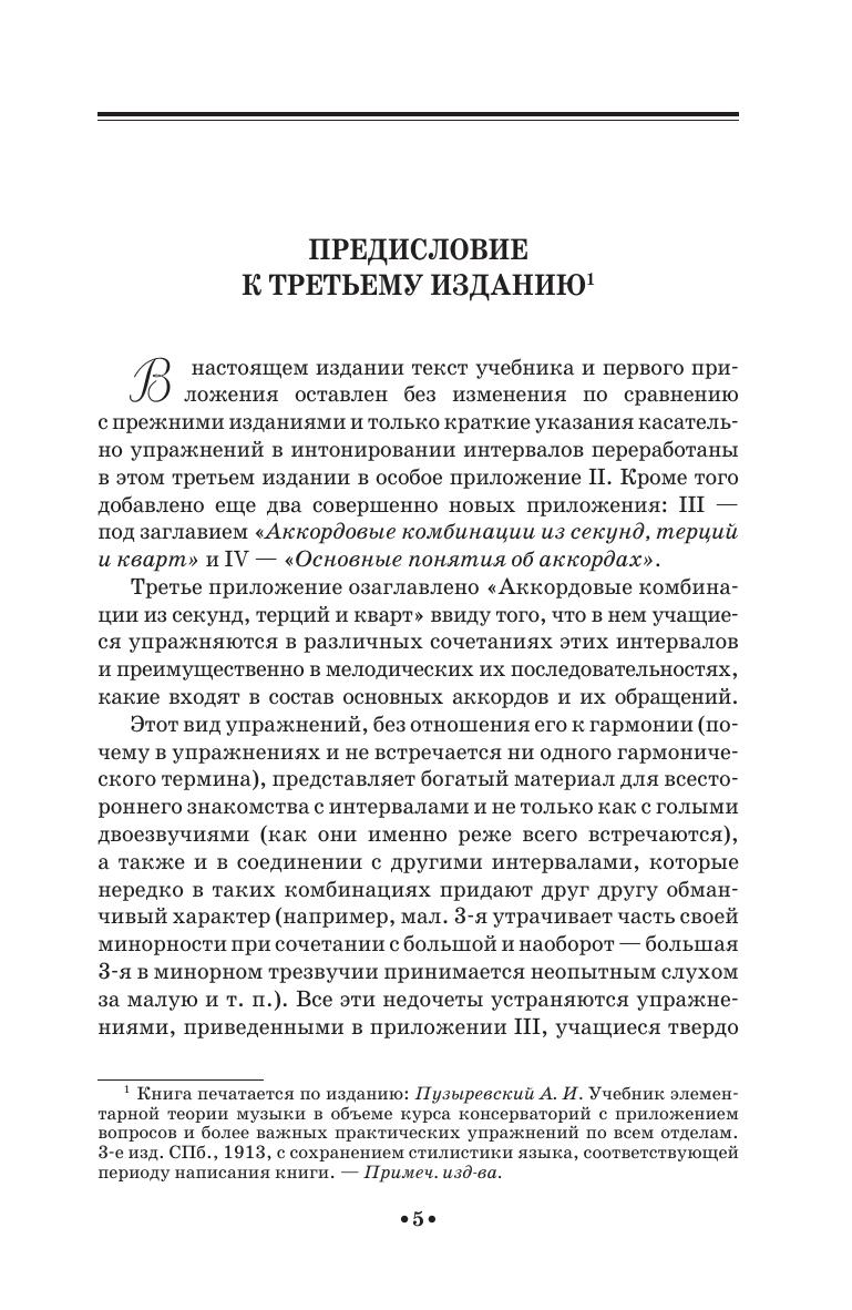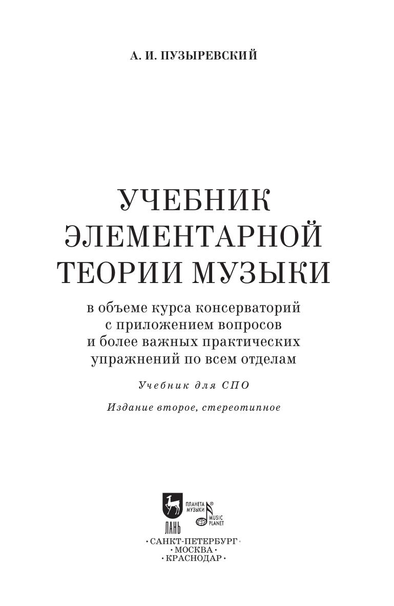 А. И. Пузыревский (1855–1917) — известный российский историк и теоретик музыки, педагог. Данная книга представляет собой учебник по элементарной теории музыки. Приводятся предварительные сведения о музыкальном звуке и его свойствах, о музыкальной системе, о тоне и полутоне. Описывается музыкальная номенклатура, включающая систему названий музыкальных звуков, названия октав и их деление на ступени; рассматривается система условных обозначений в музыке (нотация). Излагаются три основных отдела элементарной теории музыки — учение о размере и ритме, учение о гаммах и учение об интервалах. В приложениях содержатся практические упражнения по всем отделам курса элементарной теории музыки.