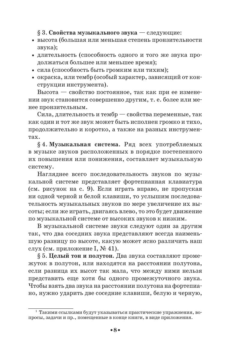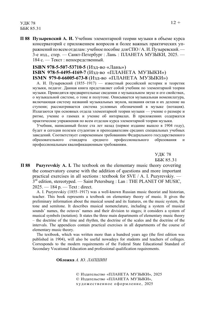 А. И. Пузыревский (1855–1917) — известный российский историк и теоретик музыки, педагог. Данная книга представляет собой учебник по элементарной теории музыки. Приводятся предварительные сведения о музыкальном звуке и его свойствах, о музыкальной системе, о тоне и полутоне. Описывается музыкальная номенклатура, включающая систему названий музыкальных звуков, названия октав и их деление на ступени, рассматривается система условных обозначений в музыке (нотация). Излагаются три основных отдела элементарной теории музыки — учение о размере и ритме, учение о гаммах и учение об интервалах. В приложениях содержатся практические упражнения по всем отделам курса элементарной теории музыки.