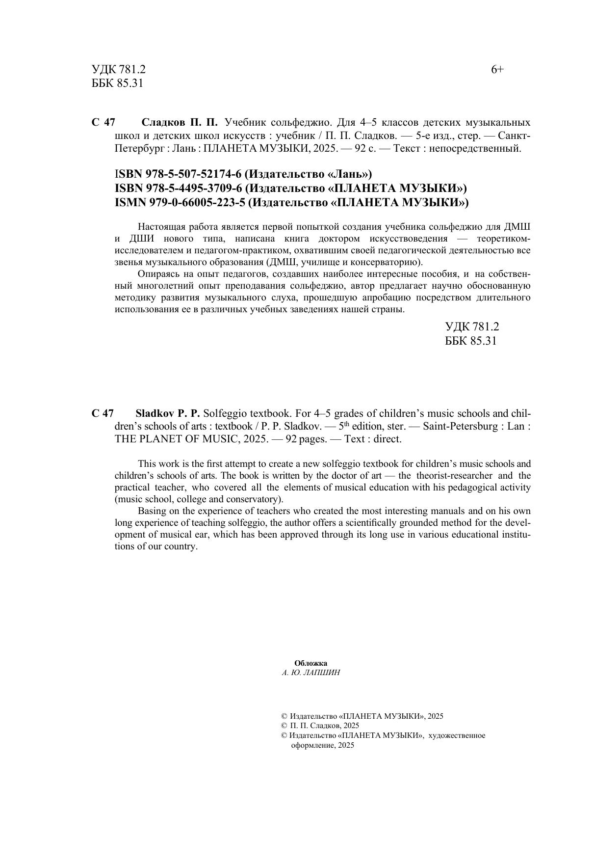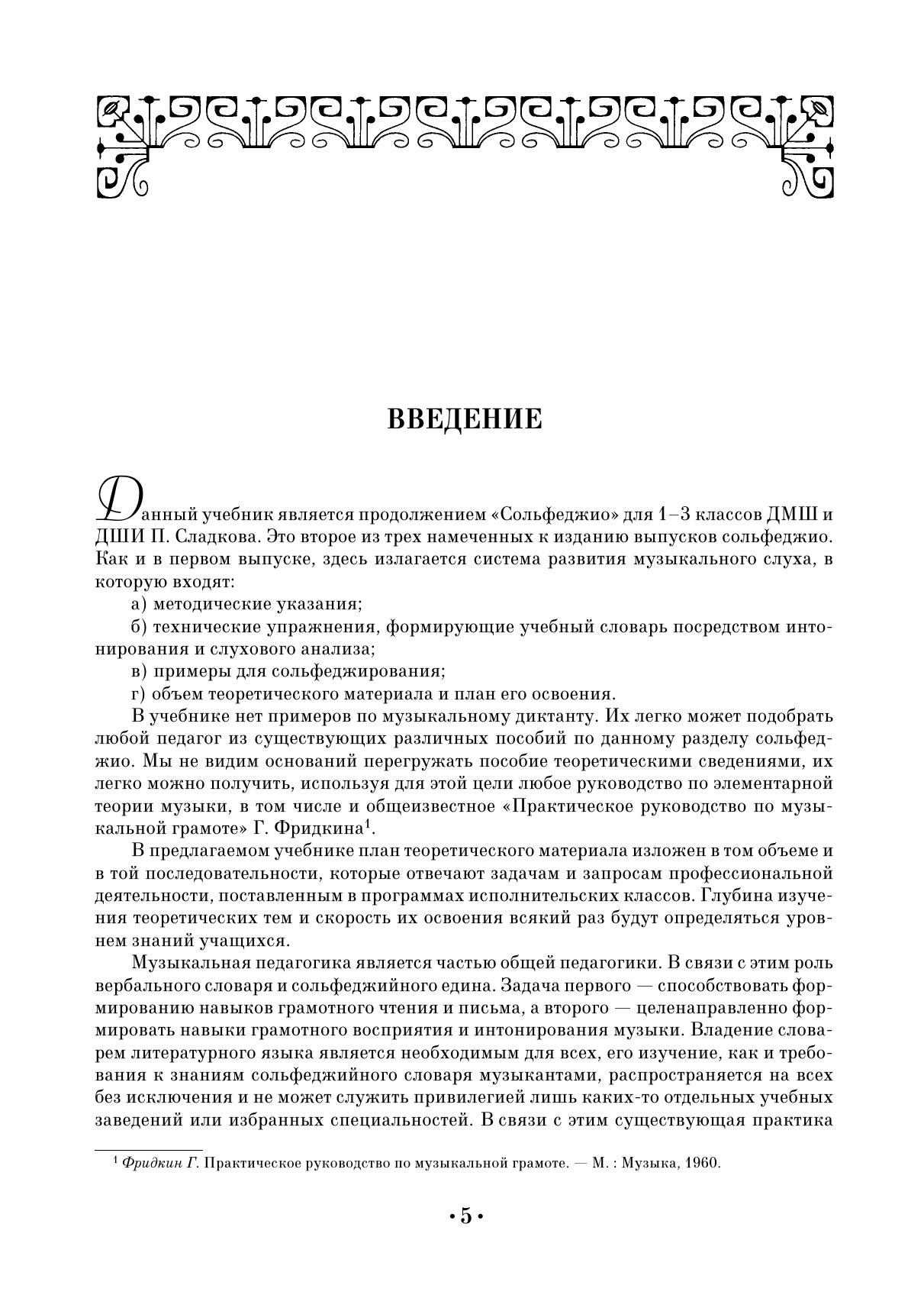 Настоящая работа является первой попыткой создания учебника сольфеджио для ДМШ и ДШИ нового типа, Написана книга доктором искусствоведения – теоретиком-исследователем и педагогом-практиком, охватившим своей педагогической деятельно-стью все звенья музыкального образования (ДМШ, училище и консерваторию). Опираясь на опыт педагогов, создавших наиболее интересные пособия и на собственный многолетний опыт преподавания сольфеджио, автор предлагает научно-обоснованную методику развития музыкального слуха, прошедшую апробацию посредством длительного использования её в различных учебных заведениях нашей страны. This work is the first attempt to create a new solfeggio textbook for children’s music schools and children's schools of arts. The book is written by the doctor of art - the theorist-researcher and the practical teacher, who covered all the elements of musical education with his pedagogical activity (music school, college and conservatory). Basing on the experience of teachers who created the most interesting manuals and on his own long experience of teaching solfeggio, the author offers a scientifically grounded method for the development of musical ear, which has been approved through its long use in various educational institutions of our country.