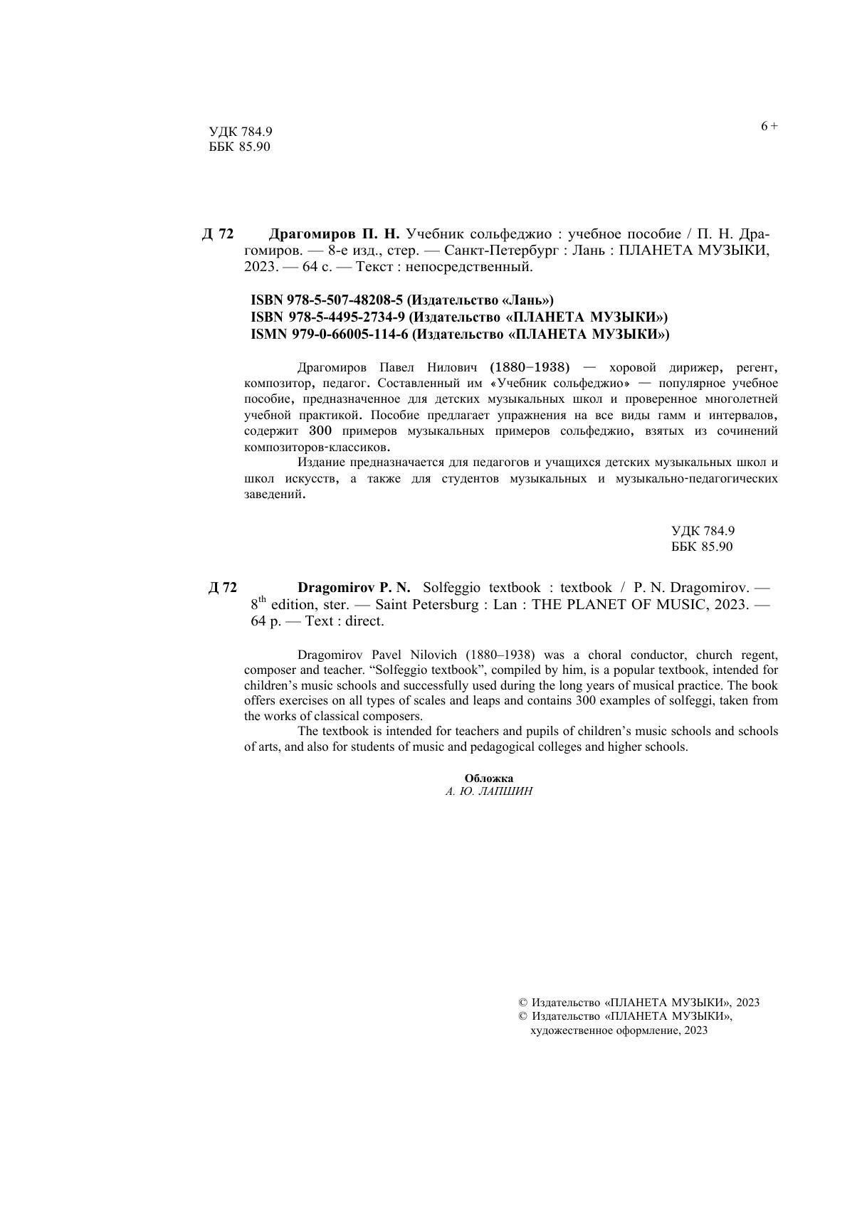 Драгомиров Павел Нилович (1880 - 1938) – хоровой дирижер, регент, композитор, педагог. Составленный им «Учебник сольфеджио» – популярное учебное пособие, предназначенное для детских музыкальных школ и проверенное многолетней учебной практикой. Пособие предлагает упражнения на все виды гамм и интервалов, содержит 300 примеров музыкальных примеров сольфеджио, взятых из сочинений композиторов-классиков. Издание предназначается для педагогов и учащихся детских музыкальных школ и школ искусств, а также для студентов средних и высших музыкальных и музыкально-педагогических заведений.