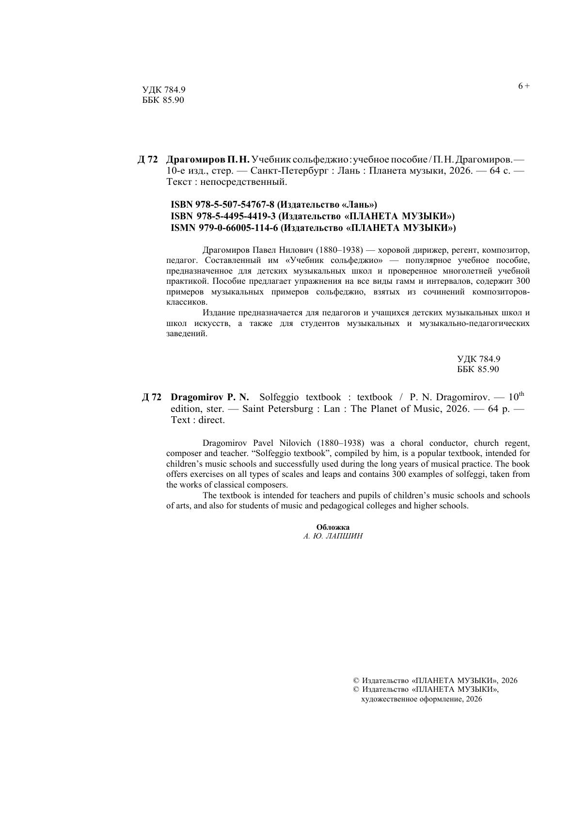 Драгомиров Павел Нилович (1880 - 1938) – хоровой дирижер, регент, композитор, педагог. Составленный им «Учебник сольфеджио» – популярное учебное пособие, предназначенное для детских музыкальных школ и проверенное многолетней учебной практикой. Пособие предлагает упражнения на все виды гамм и интервалов, содержит 300 примеров музыкальных примеров сольфеджио, взятых из сочинений композиторов-классиков. Издание предназначается для педагогов и учащихся детских музыкальных школ и школ искусств, а также для студентов средних и высших музыкальных и музыкально-педагогических заведений.