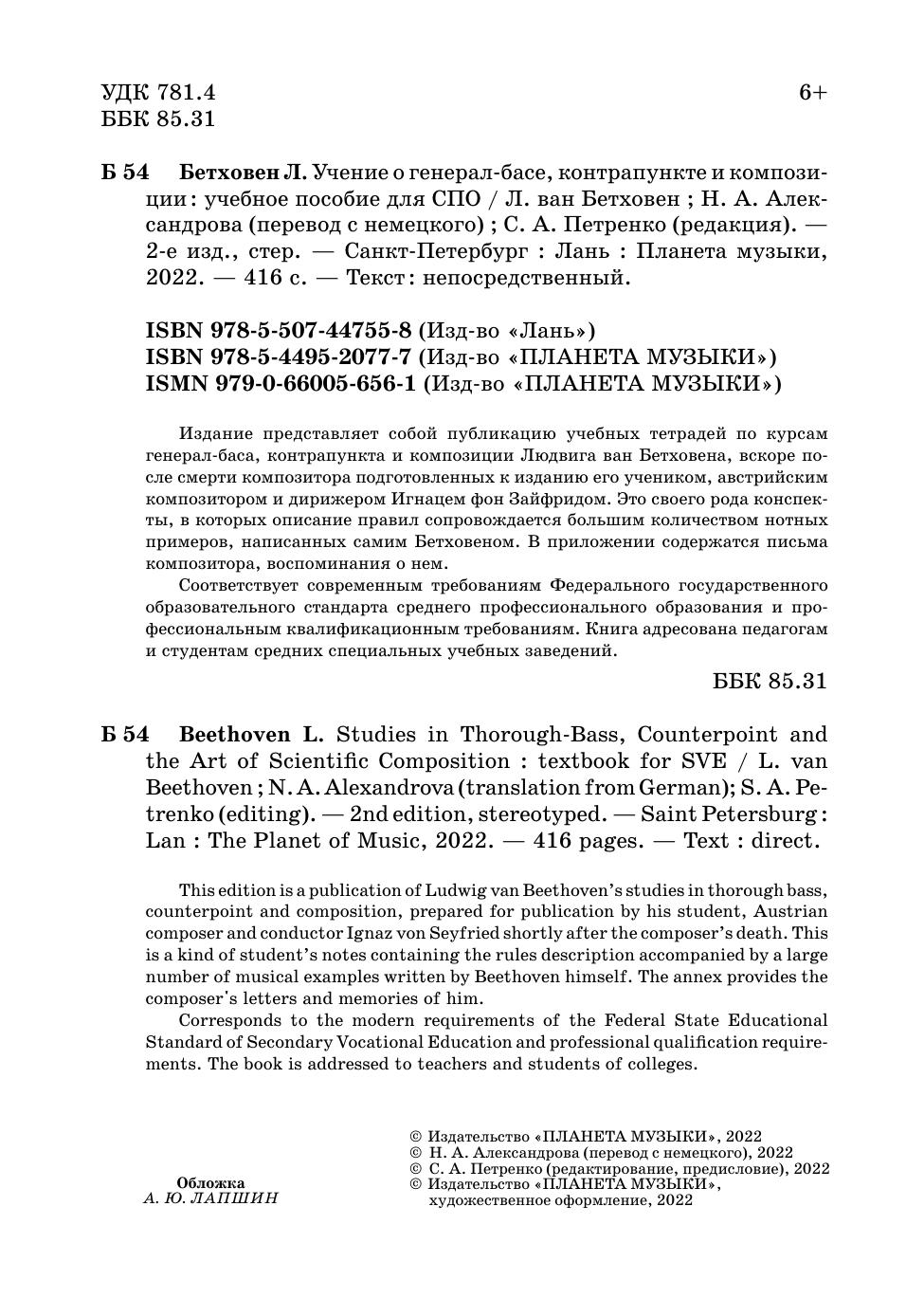This edition is a publication of Ludwig van Beethoven’s studies in thorough bass, counterpoint and composition, prepared for publication by his student, Austrian composer and conductor Ignaz von Seyfried shortly after the composer’s death. This is a kind of student’s notes containing the rules description accompanied by a large number of musical examples written by Beethoven himself. The annex provides the composer's letters and memories of him.