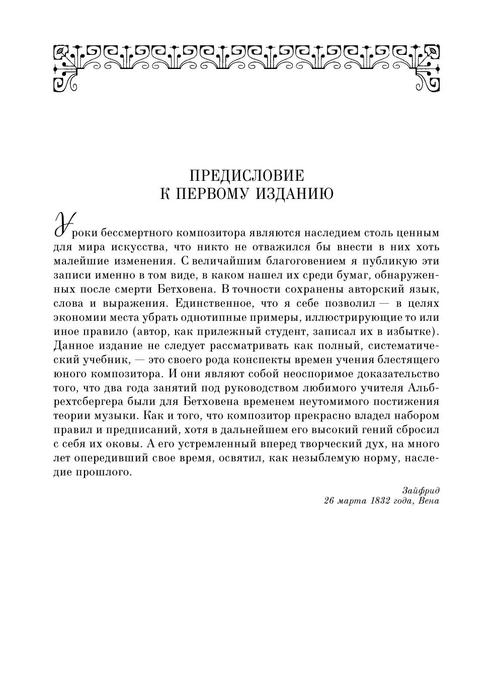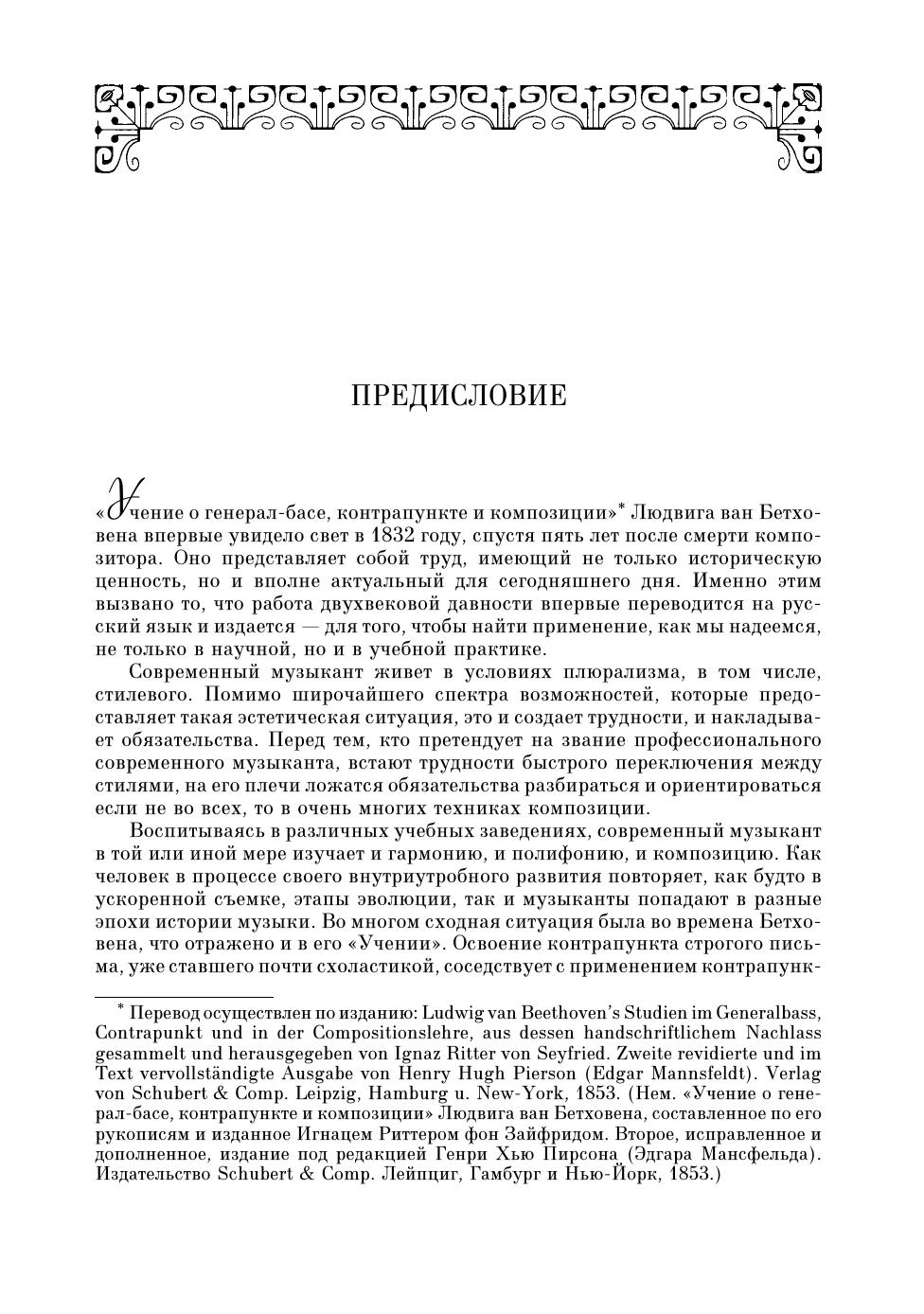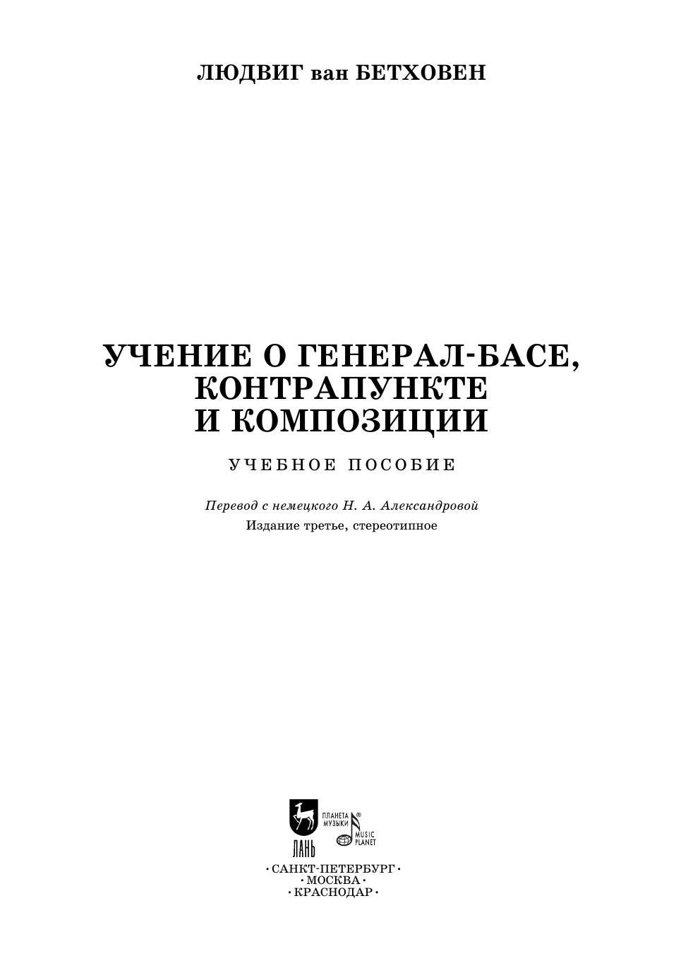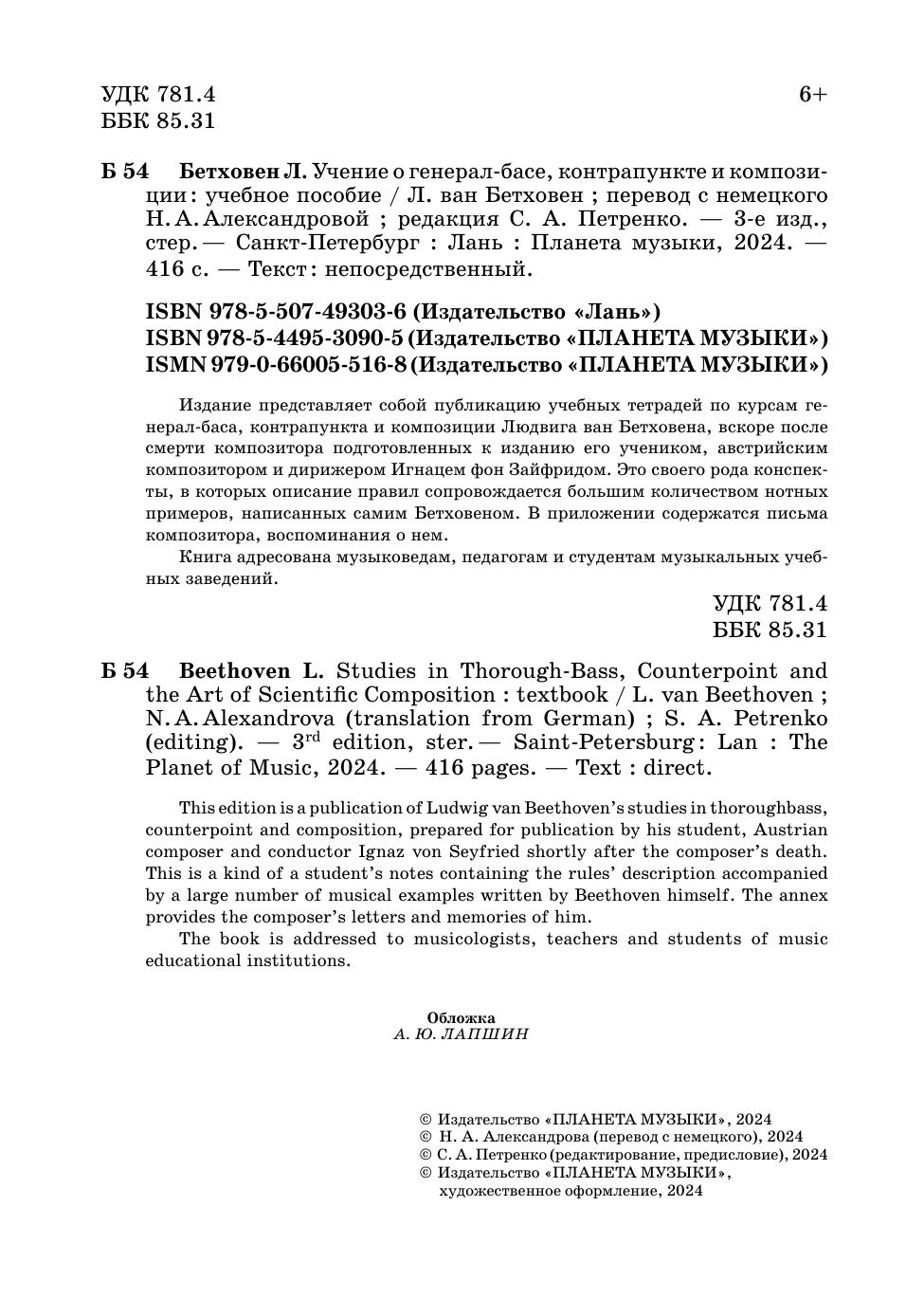 Издание представляет собой публикацию учебных тетрадей по курсам генерал-баса, контрапункта и композиции Людвига ван Бетховена, вскоре после смерти композитора подготовленных к изданию его учеником, австрийским композитором и дирижером Игнацем фон Зайфридом. Это своего рода конспекты, в которых описание правил сопровождается большим количеством нотных примеров, написанных самим Бетховеном. В приложении содержатся письма композитора, воспоминания о нем. Книга адресована музыковедам, педагогам и студентам музыкальных учебных заведений. This edition is a publication of Ludwig van Beethoven’s studies in thoroughbass, counterpoint and composition, prepared for publication by his student, Austrian composer and conductor Ignaz von Seyfried shortly after the composer’s death. This is a kind of a student’s notes containing the rules’ description accompanied by a large number of musical examples written by Beethoven himself. The annex provides the composer’s letters and memories of him. The book is addressed to musicologists, teachers and students of music educational institutions.