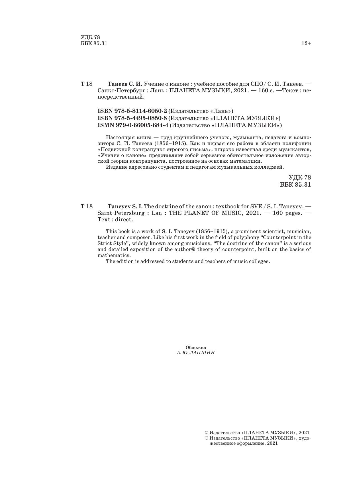 Настоящая книга - труд крупнейшего ученого, музыканта, педагога и композитора С.И. Танеева (1856–1915). Как и первая его работа в области полифонии «Подвижной контрапункт строгого письма», широко известная среди музыкантов, «Учение о каноне» представляет собой серьезное обстоятельное изложение авторской теории контрапункта, построенное на основах математики. Издание адресовано студентам и педагогам музыкальных колледжей.