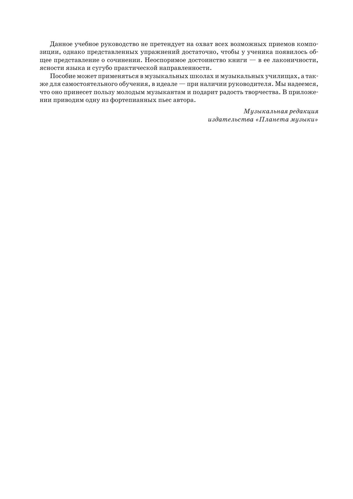 Руководство включает в себя упражнения, направленные на выработку навыка сочинения простых мелодий и тематического развития материала в пределах малых форм. Система упражнений построена на гомофонной основе. Ведущее место отводится мелодии с опорой на гармоническую основу.