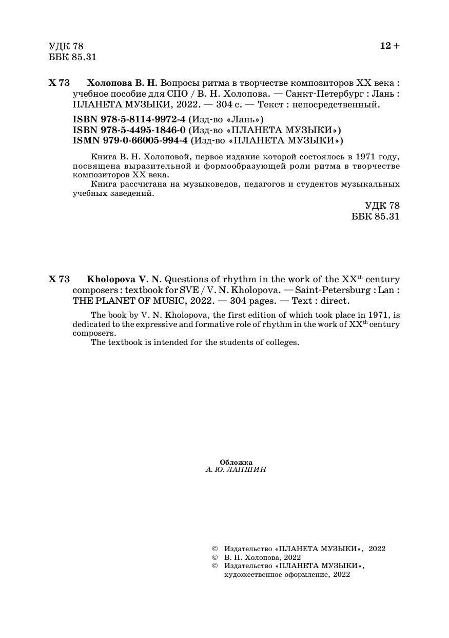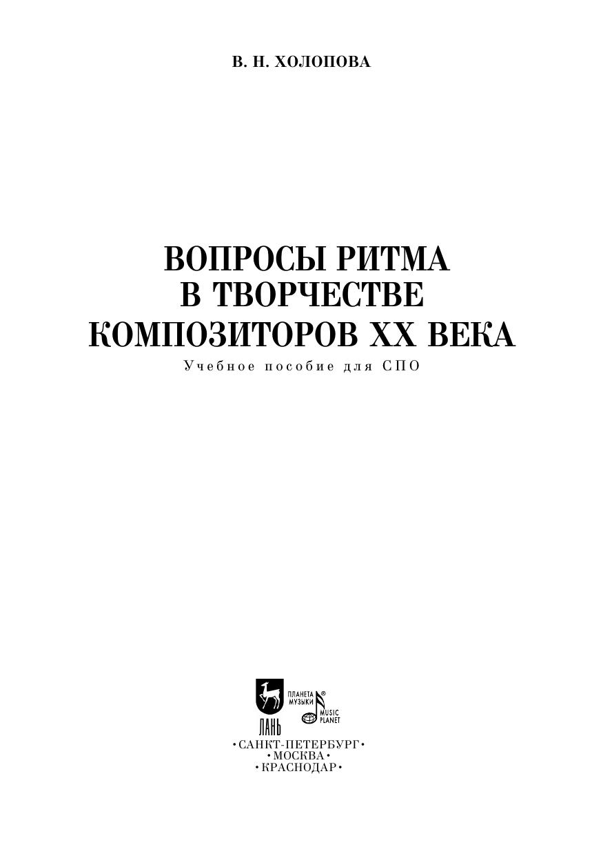 The book by V. N. Kholopova, the first edition of which took place in 1971, is dedicated to the expressive and formative role of rhythm in the work of XXth century composers.