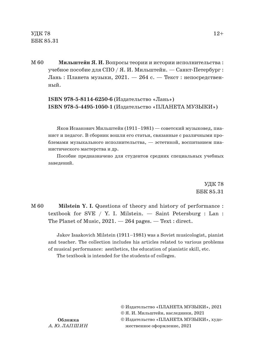 Яков Исаакович Мильштейн (1911–1981) — советский музыковед, пианист и педагог. В сборник вошли его статьи, связанные с различными проблемами музыкального исполнительства, — эстетикой, воспитанием пианистического мастерства и др.