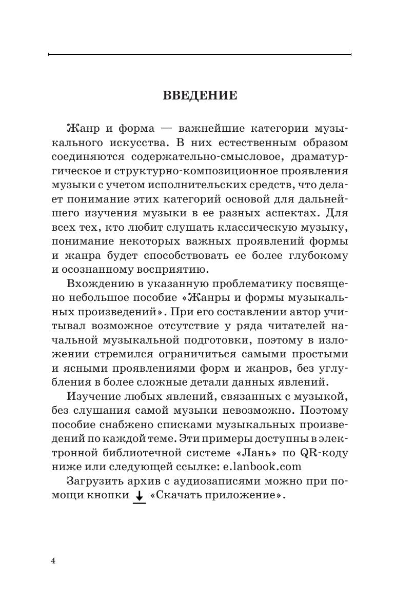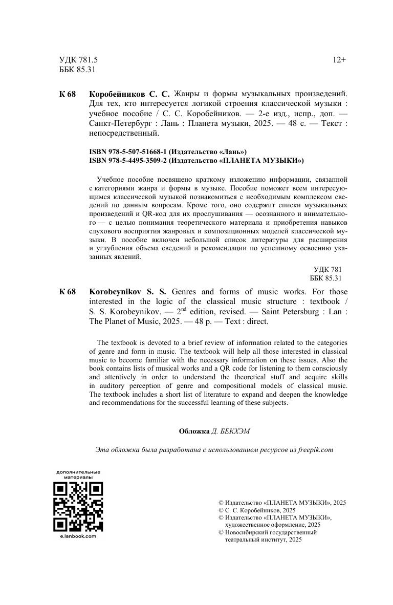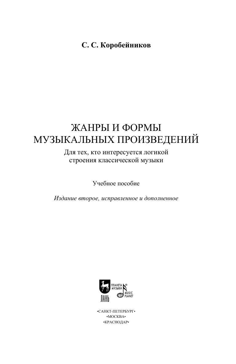 Учебное пособие посвящено краткому изложению информации, связанной с категориями жанра и формы в музыке. Пособие поможет всем интересующимся классической музыкой познакомиться с необходимым комплексом сведений по данным вопросам. Кроме того, оно содержит списки музыкальных произведений и QR-код для их прослушивания - осознанного и внимательного - с целью понимания теоретического материала и приобретения навыков слухового восприятия жанровых и композиционных моделей классической музыки. В пособие включен небольшой список литературы для расширения и углубления объёма сведений и рекомендации по успешному освоению указанных явлений. The textbook is devoted to a brief review of information related to the categories of genre and form in music. The textbook will help all those interested in classical music to become familiar with the necessary information on these issues. Also the book contains lists of musical works and a QR code for listening to them consciously and attentively in order to understand the theoretical stuff and acquire skills in auditory perception of genre and compositional models of classical music. The textbook includes a short list of literature to expand and deepen the knowledge and recommendations for the successful learning of these subjects.