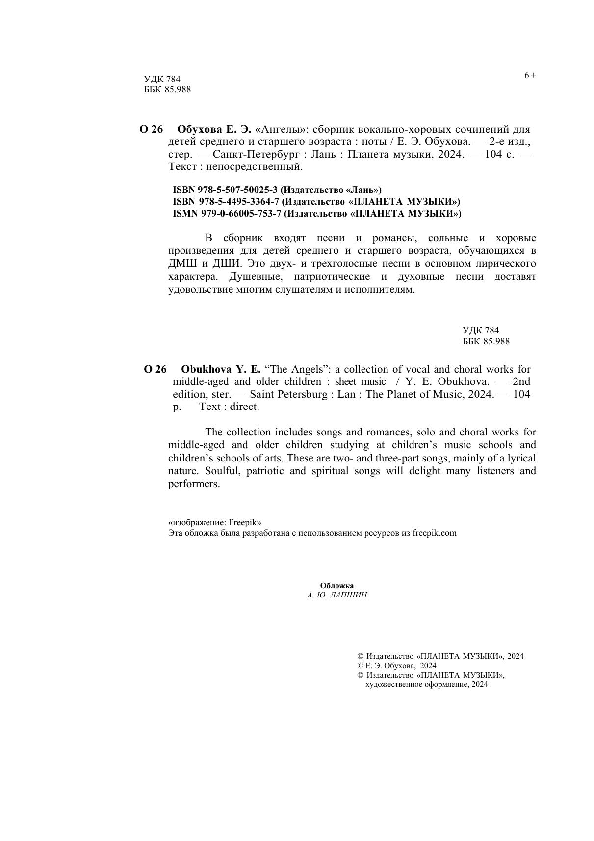 В сборник входят песни и романсы, сольные и хоровые произведения для детей среднего и старшего возраста, обучающихся в ДМШ и ДШИ. Это двух- и трехголосные песни в основном лирического характера. Душевные, патриотические и духовные песни доставят удовольствие многим слушателям и исполнителям. The collection includes songs and romances, solo and choral works for middle-aged and older children studying at children's music schools and children's schools of arts. These are two- and three-part songs, mainly of a lyrical nature. Soulful, patriotic and spiritual songs will delight many listeners and performers.
