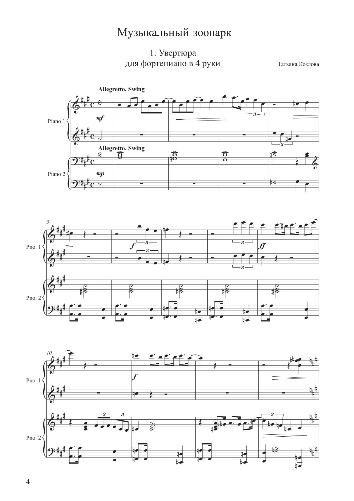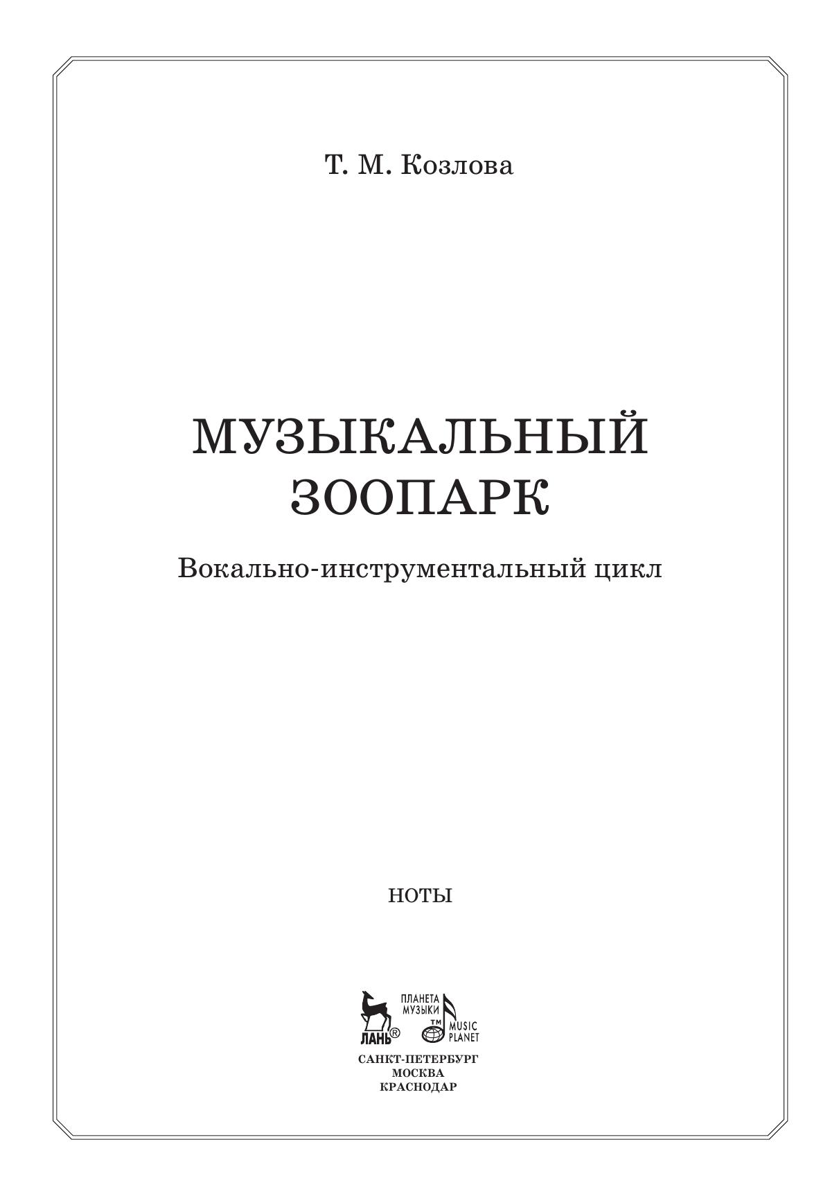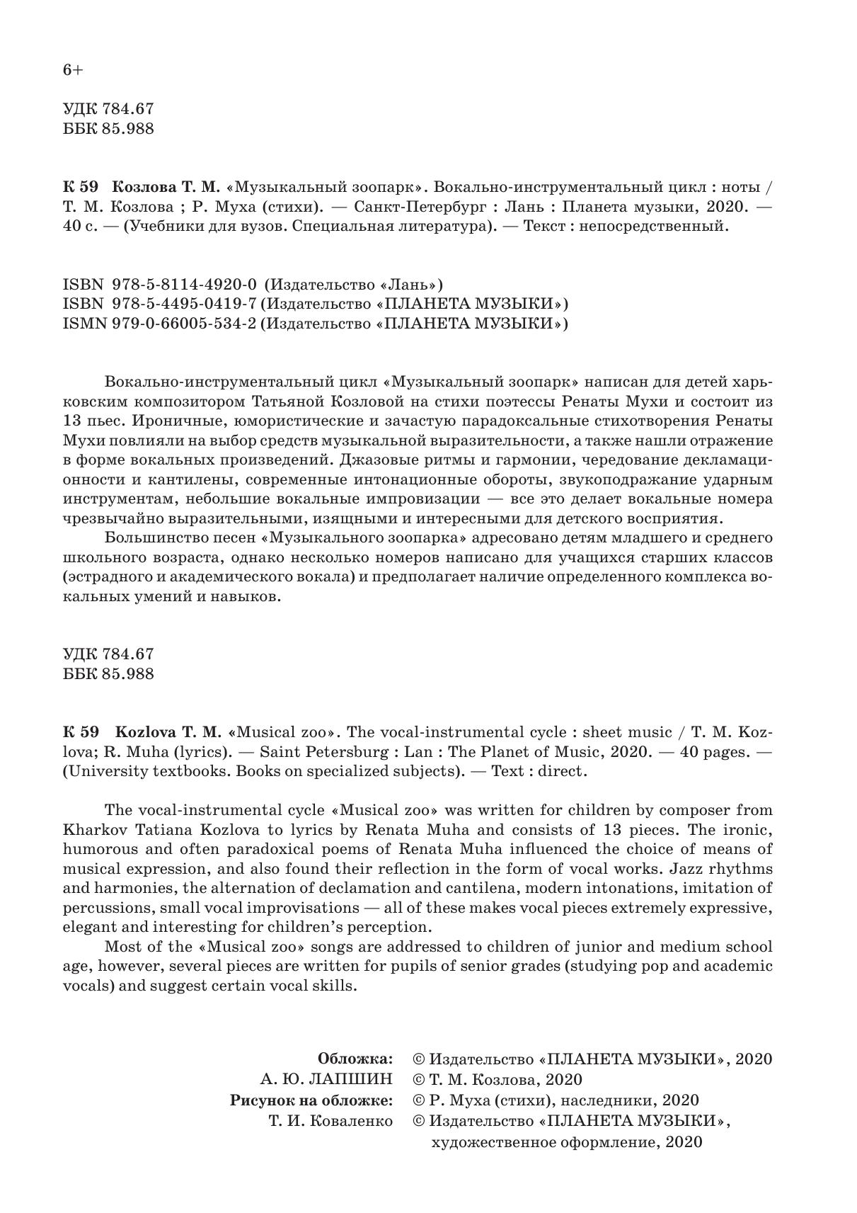 Вокально-инструментальный цикл «Музыкальный зоопарк» написан для детей харьковским композитором Татьяной Козловой на стихи поэтессы Ренаты Мухи и состоит из 13 пьес. Ироничные, юмористические и зачастую парадоксальные стихотворения Ренаты Мухи повлияли на выбор средств музыкальной выразительности, а также нашли отражение в форме вокальных произведений. Джазовые ритмы и гармонии, чередование декламационности и кантилены, современные интонационные обороты, звукоподражание ударным инструментам, небольшие вокальные импровизации — все это делает вокальные номера чрезвычайно выразительными, изящными и интересными для детского восприятия.