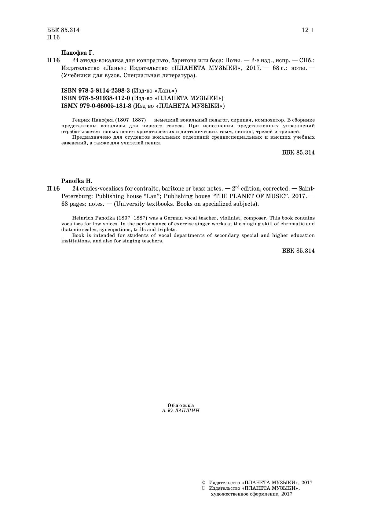 Генрих Панофка (1807–1887) — немецкий вокальный педагог, скрипач, композитор. В сборнике представлены вокализы для низкого голоса. При исполнении представленных упражнений отрабатывается навык пения хроматических и диатонических гамм, синкоп, трелей и триолей.