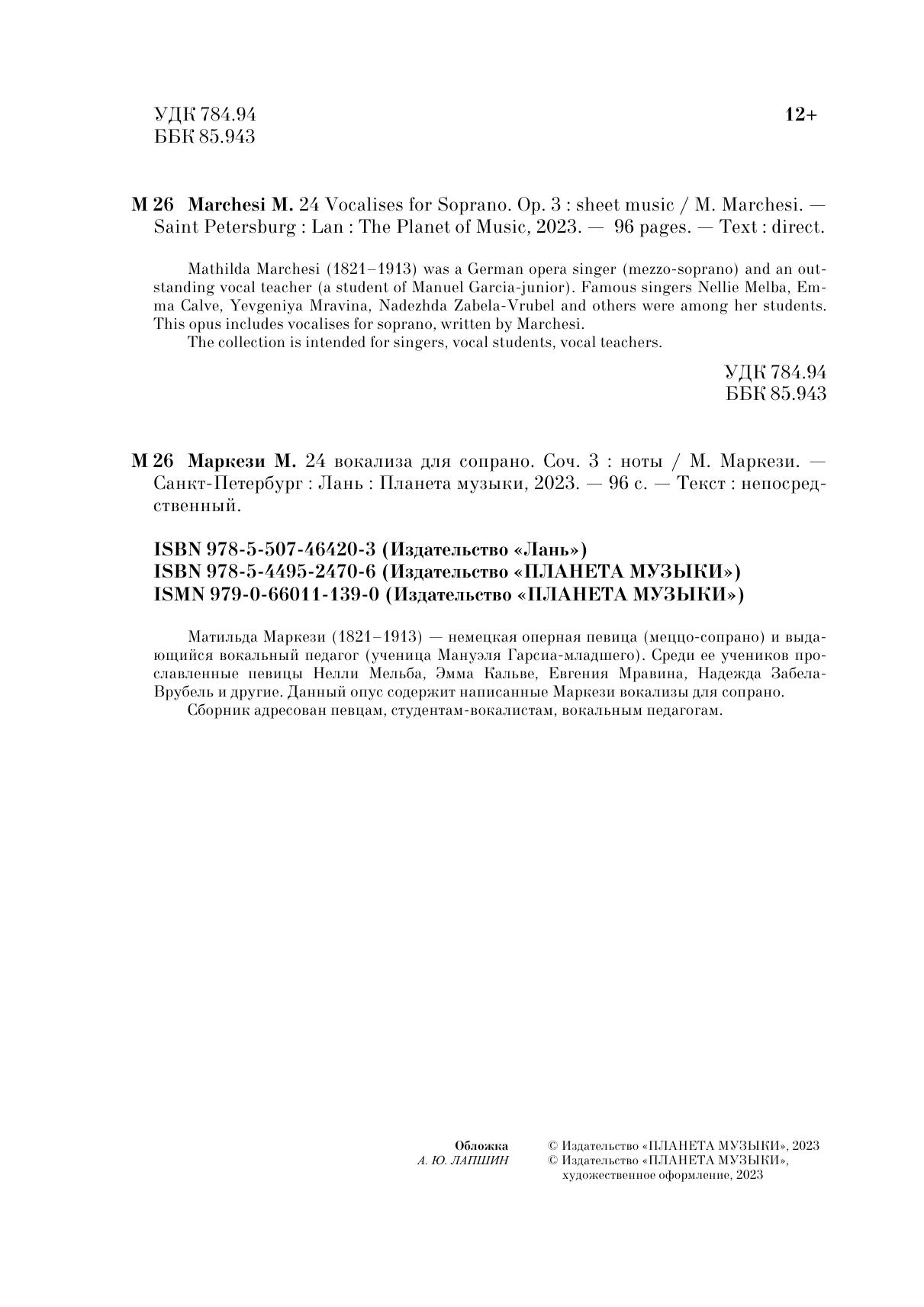 Матильда Маркези (1821–1913) — немецкая оперная певица (меццо-сопрано) и выдающийся вокальный педагог (ученица Мануэля Гарсиа-младшего). Среди ее учеников прославленные певицы Нелли Мельба, Эмма Кальве, Евгения Мравина, Надежда Забела-Врубель и другие. Данный опус содержит написанные Маркези вокализы для сопрано. Сборник адресован певцам, студентам-вокалистам, вокальным педагогам. Mathilda Marchesi (1821–1913) was a German opera singer (mezzo-soprano) and an outstanding vocal teacher (a student of Manuel Garcia-junior). Famous singers Nellie Melba, Emma Calve, Yevgeniya Mravina, Nadezhda Zabela-Vrubel and others were among her students. This opus includes vocalises for soprano, written by Marchesi. The collection is intended for singers, vocal students, vocal teachers.