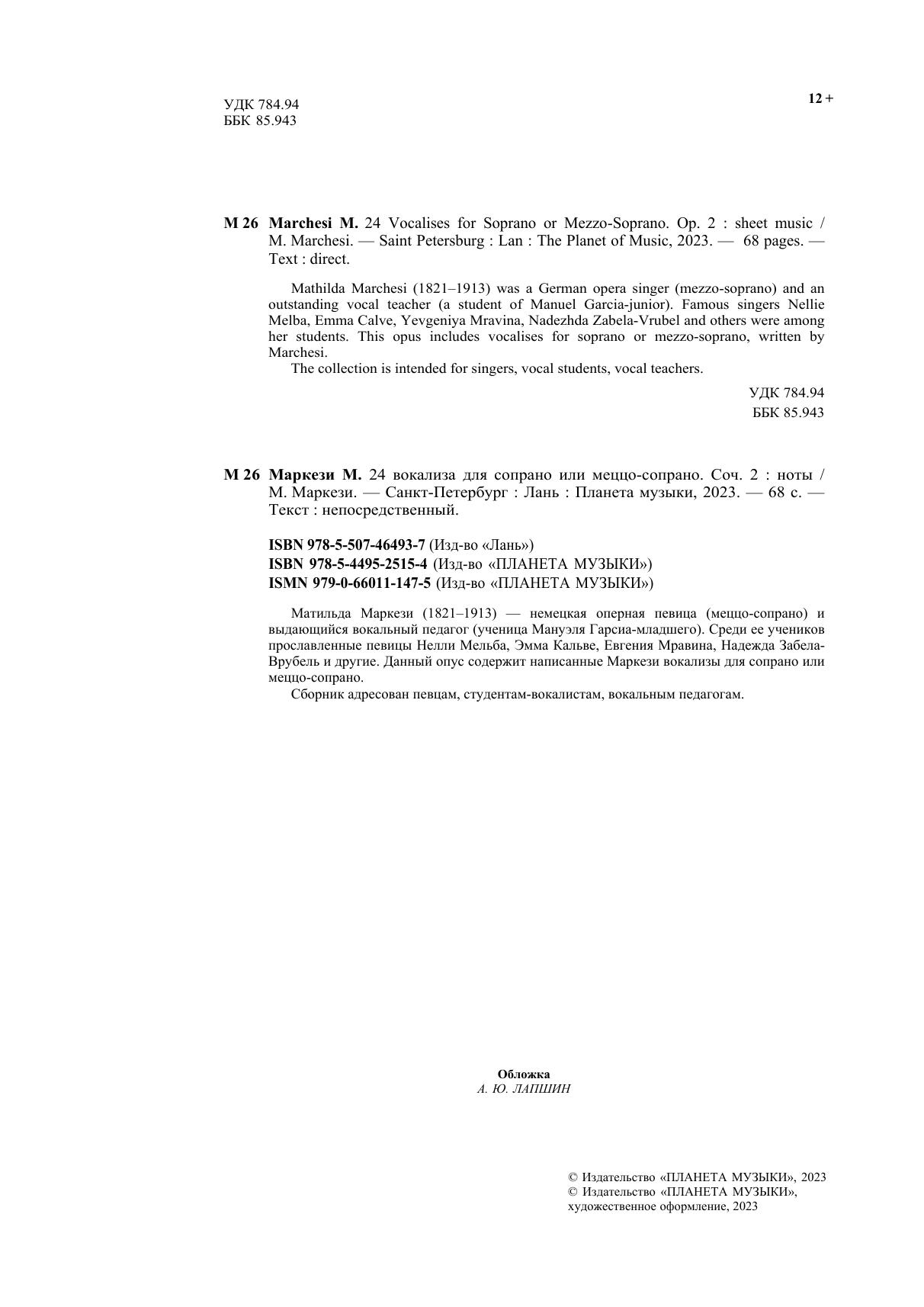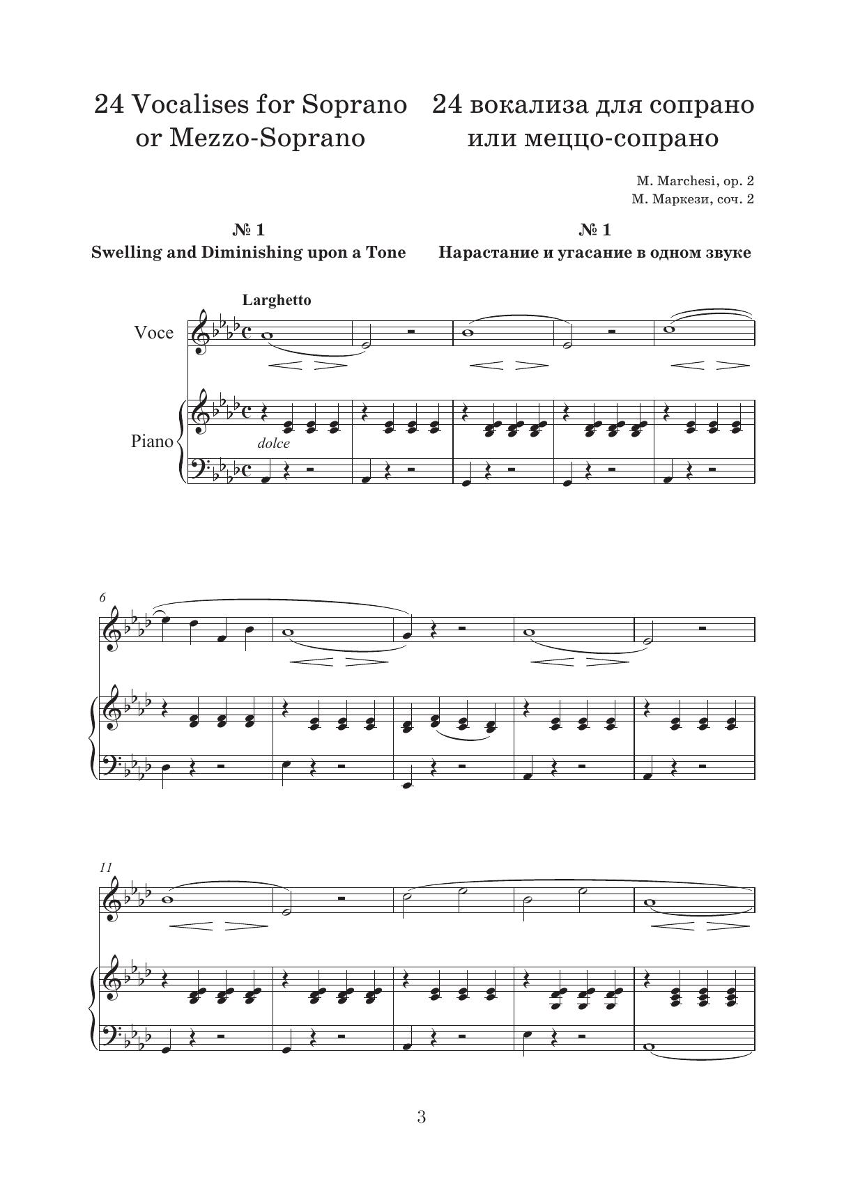 Матильда Маркези (1821–1913) — немецкая оперная певица (меццо-сопрано) и выдающийся вокальный педагог (ученица Мануэля Гарсиа-младшего). Среди ее учеников прославленные певицы Нелли Мельба, Эмма Кальве, Евгения Мравина, Надежда Забела-Врубель и другие. Данный опус содержит написанные Маркези вокализы для сопрано или меццо-сопрано. Сборник адресован певцам, студентам-вокалистам, вокальным педагогам. Mathilda Marchesi (1821–1913) was a German opera singer (mezzo-soprano) and an outstanding vocal teacher (a student of Manuel Garcia-junior). Famous singers Nellie Melba, Emma Calve, Yevgeniya Mravina, Nadezhda Zabela-Vrubel and others were among her students. This opus includes vocalises for soprano or mezzo-soprano, written by Marchesi. The collection is intended for singers, vocal students, vocal teachers.
