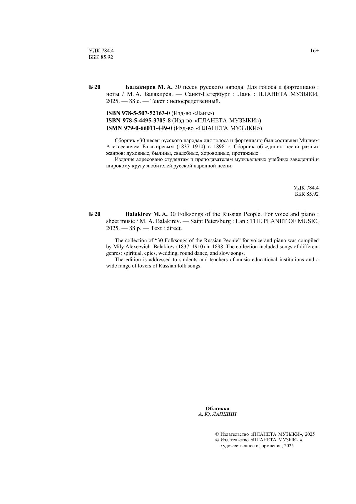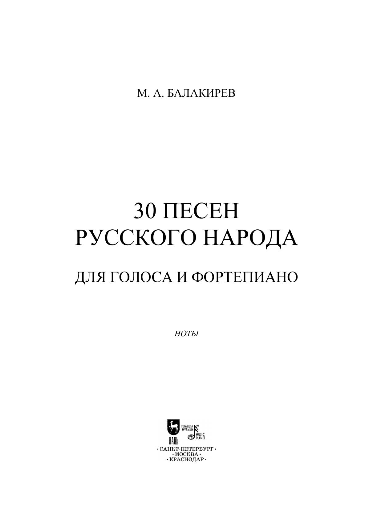Сборник «30 песен русского народа» для голоса и фортепиано был составлен Милием Алексеевичем Балакиревым (1837–1910) в 1898 г. Сборник объединил песни разных жанров: духовные, былины, свадебные, хороводные, протяжные. Издание адресовано студентам и преподавателям музыкальных учебных заведений и широкому кругу любителей русской народной песни. The collection of “30 Folksongs of the Russian People” for voice and piano was compiled by Mily Alexeevich Balakirev (1837–1910) in 1898. The collection included songs of different genres: spiritual, epics, wedding, round dance, and slow songs. The edition is addressed to students and teachers of music educational institutions and a wide range of lovers of Russian folk songs.